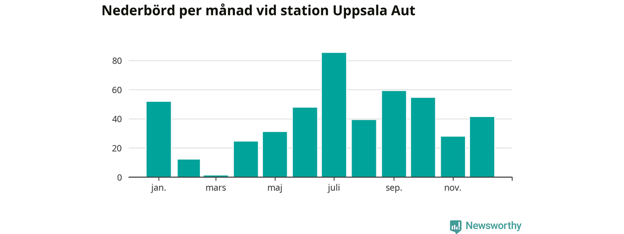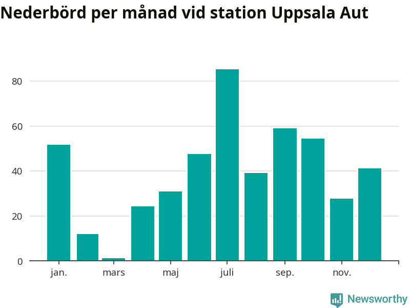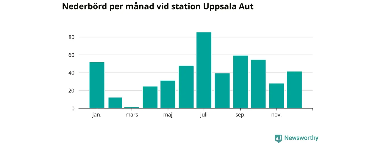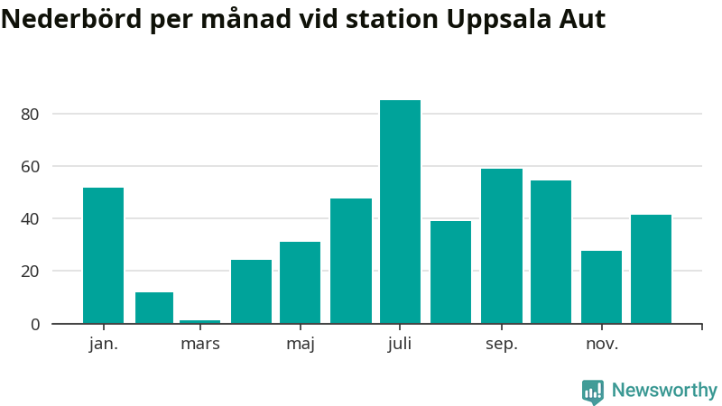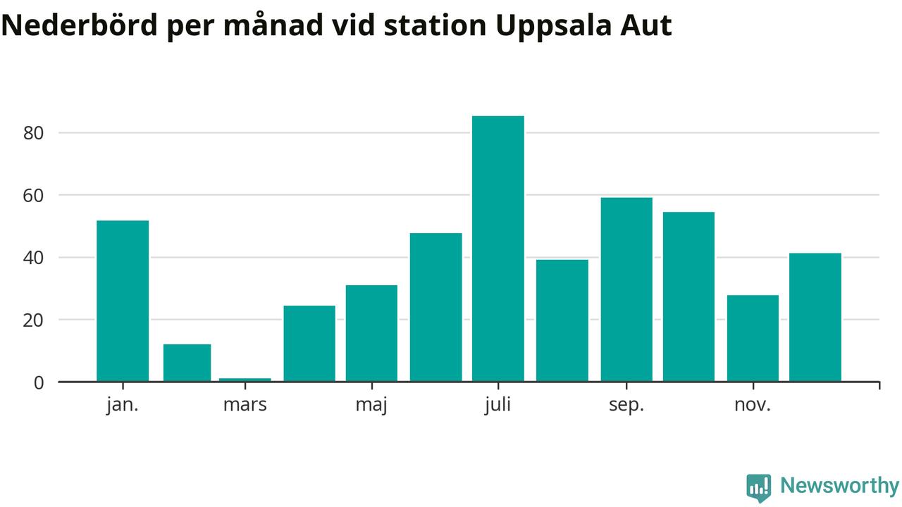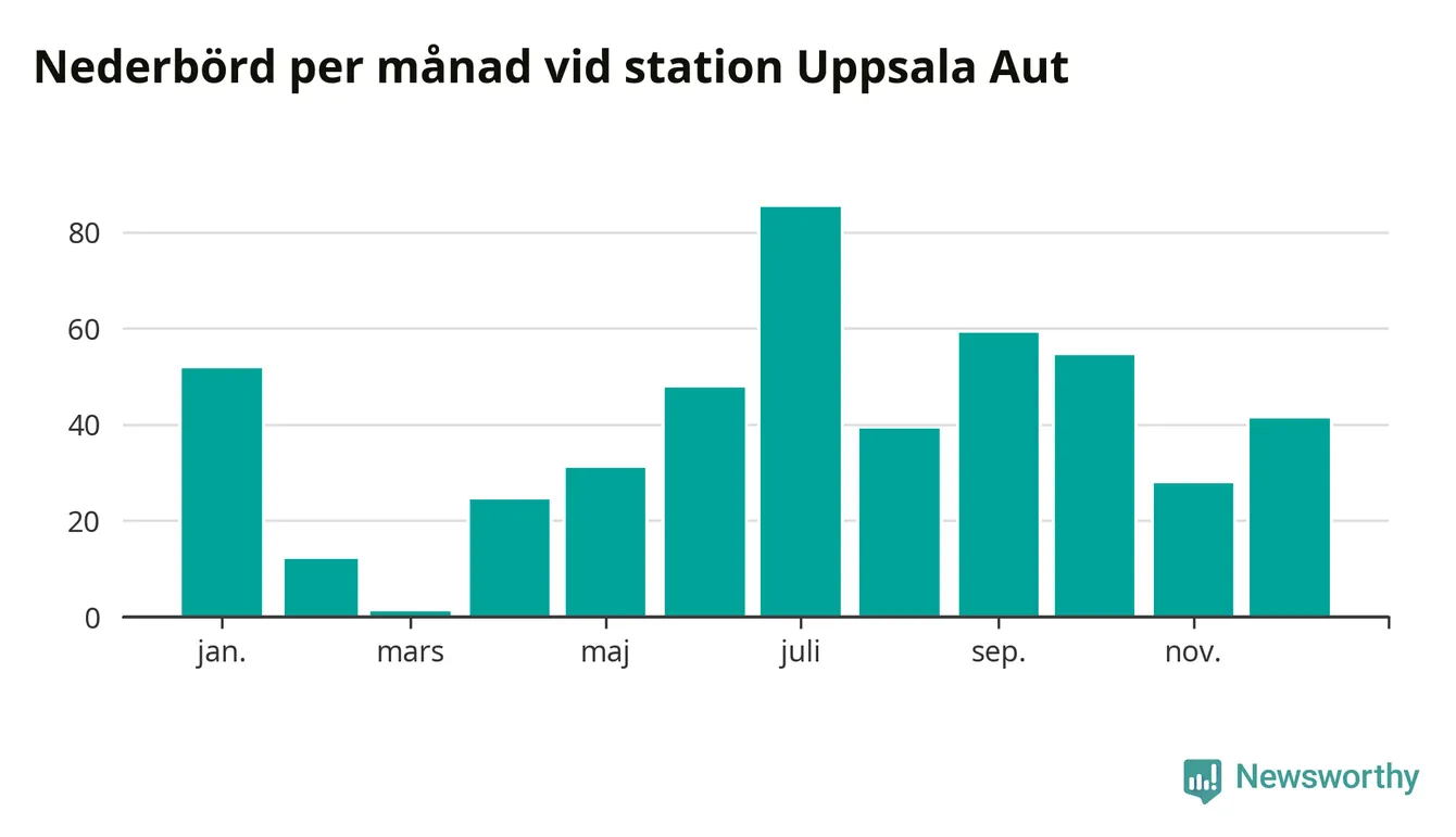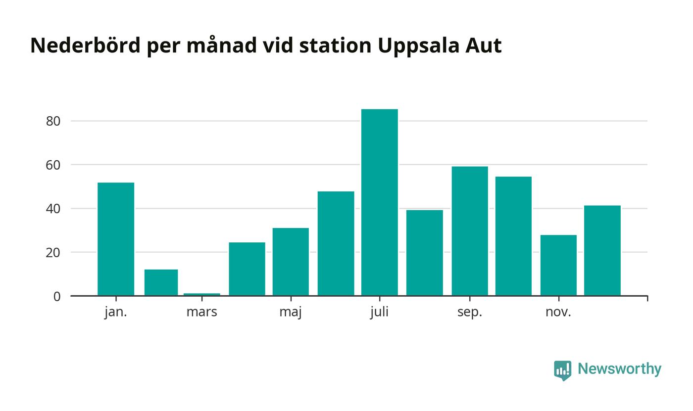 Nederbördsmässigt var 2025 ett torrare år än vanligt vid Uppsala Aut. Totalt föll 475 millimeter nederbörd vid stationen, att jämföra med de senaste tre decenniernas genomsnitt på 556 millimeter. Månaden med mest nederbörd var juli, med 85 millimeter.