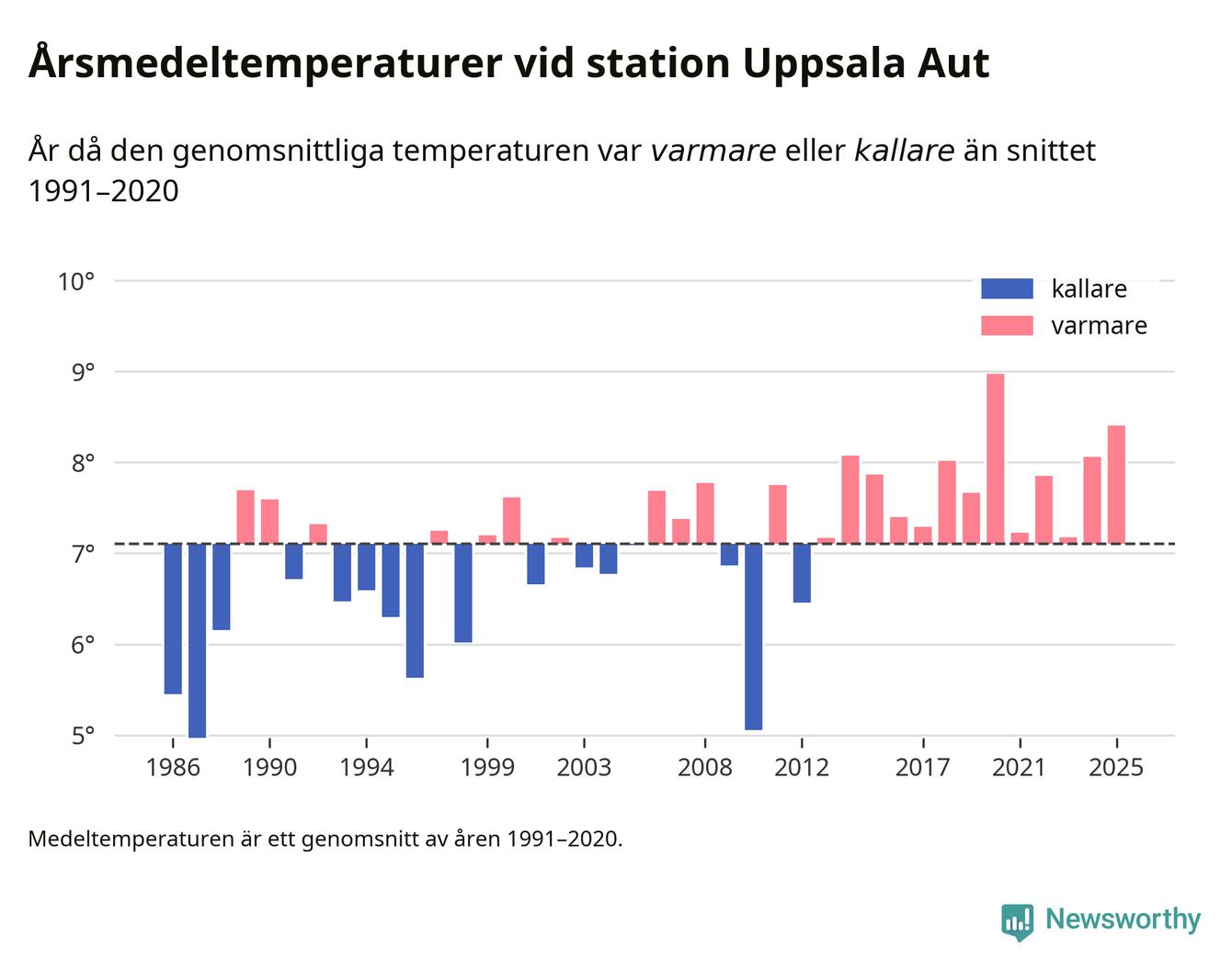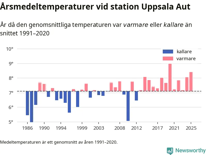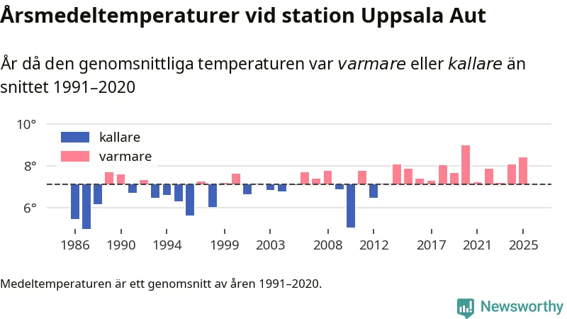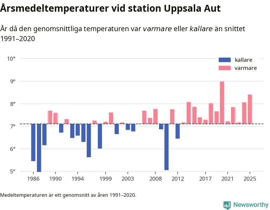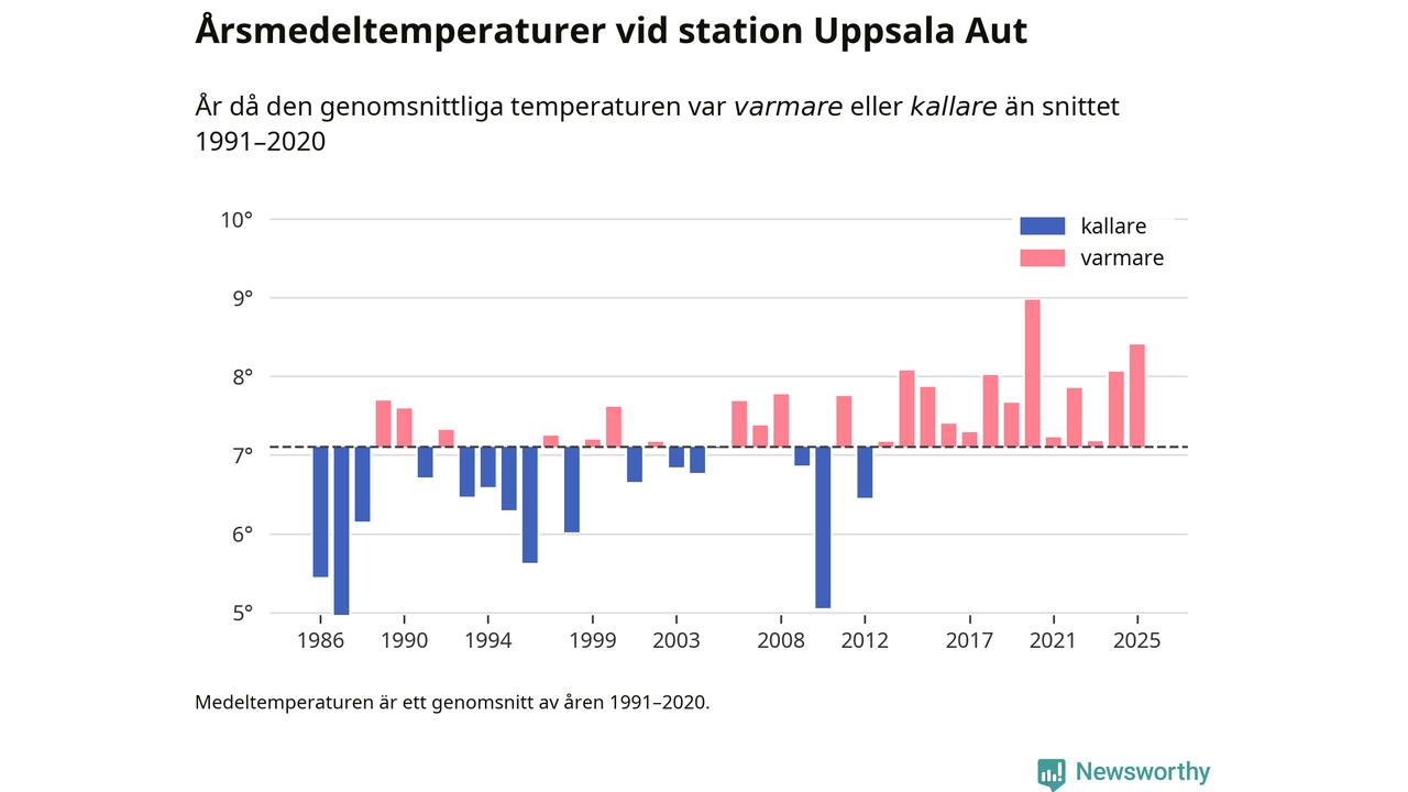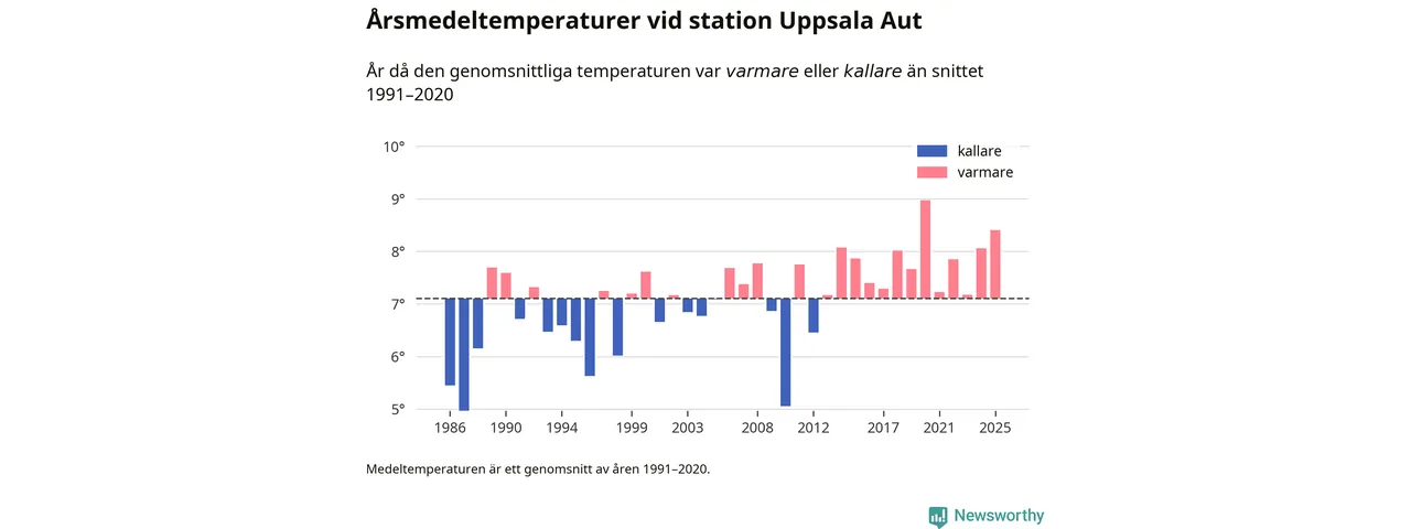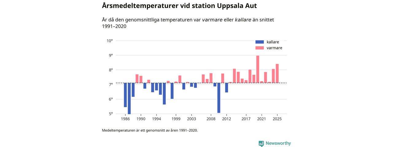 Årsmedeltemperaturen vid Uppsala Aut i centrala Uppsala1 var under 2025 8,4 grader, 1,3 grader högre än genomsnittet de senaste decennierna. Det är den näst högsta noteringen sedan 1986, visar Newsworthys beräkningar baserade på delvis preliminär observationsdata från SMHI.