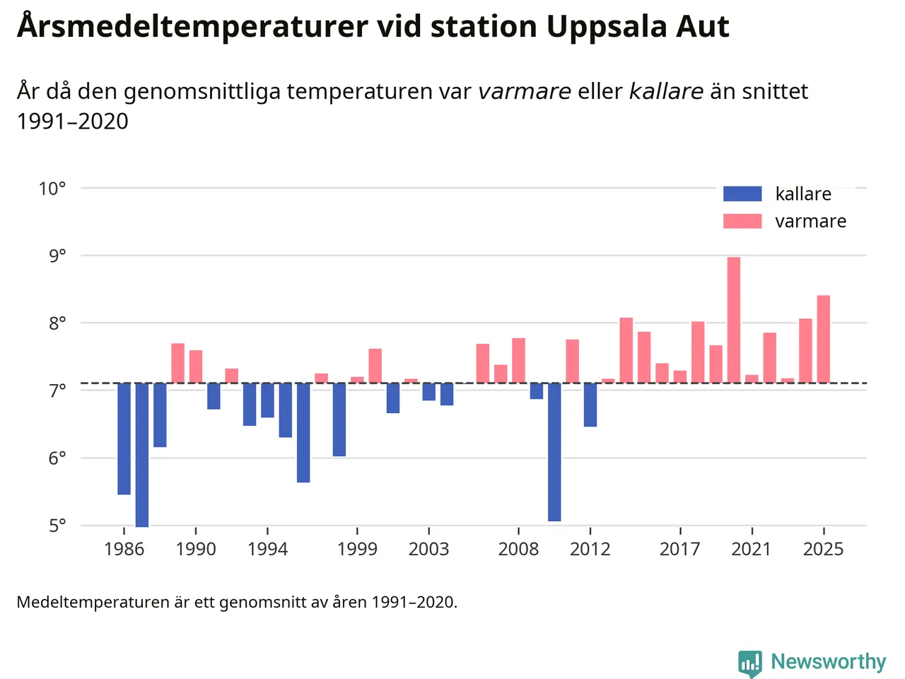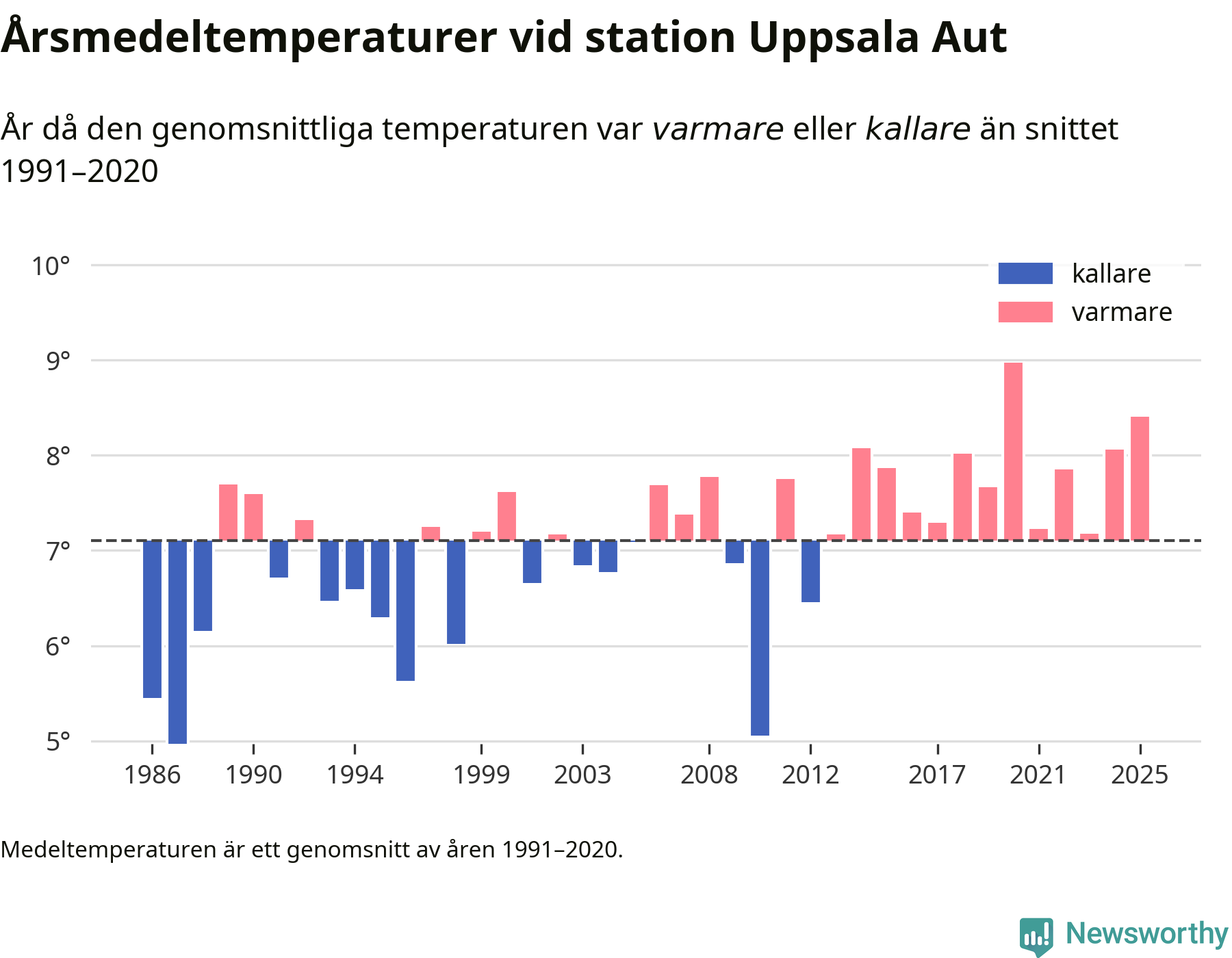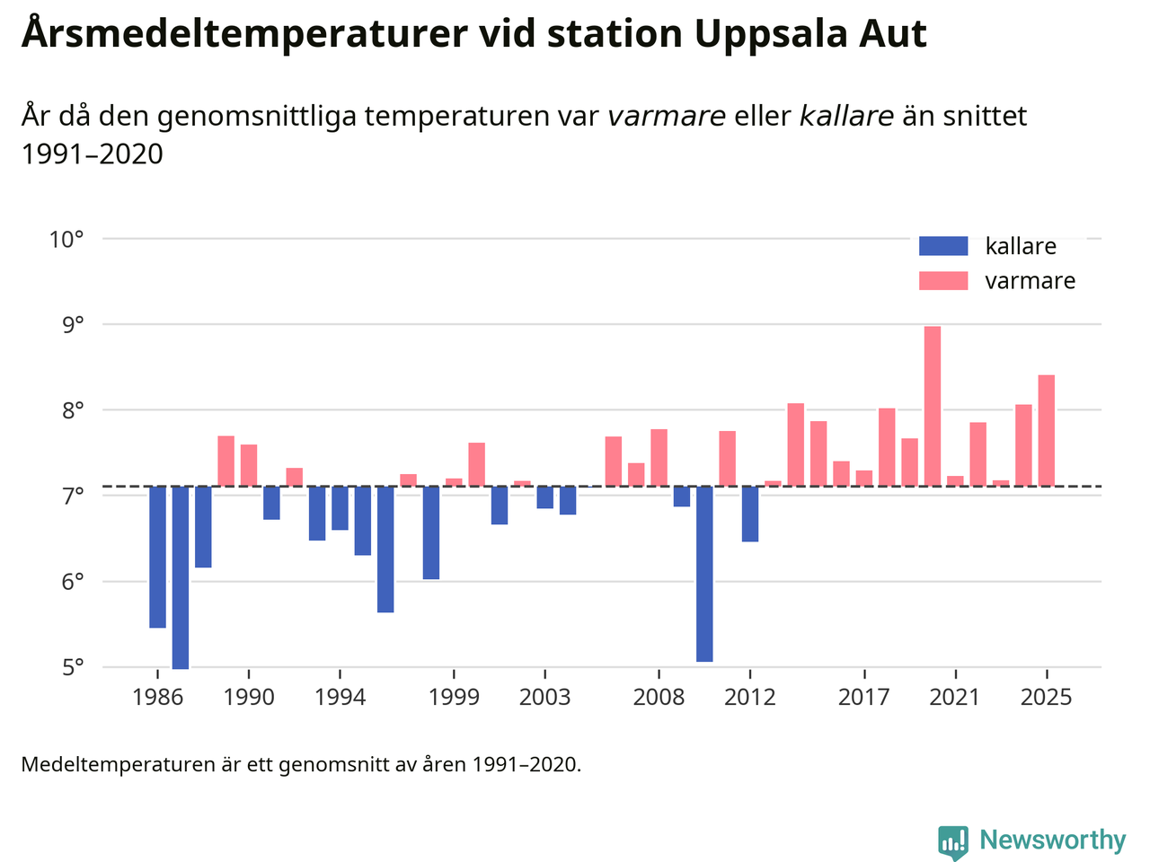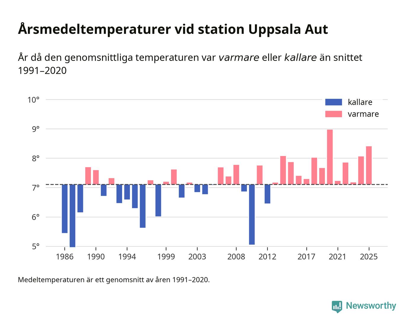 Årsmedeltemperaturen vid Uppsala Aut i centrala Uppsala1 var under 2025 8,4 grader, 1,3 grader högre än genomsnittet de senaste decennierna. Det är den näst högsta noteringen sedan 1986, visar Newsworthys beräkningar baserade på delvis preliminär observationsdata från SMHI.