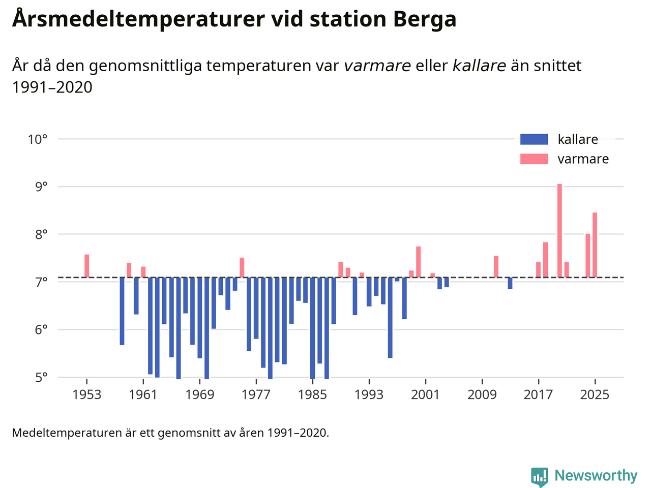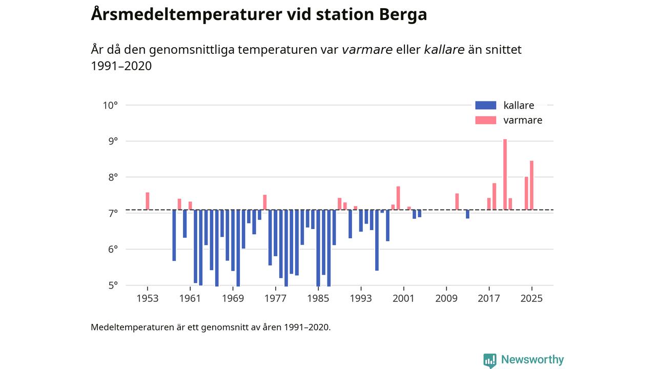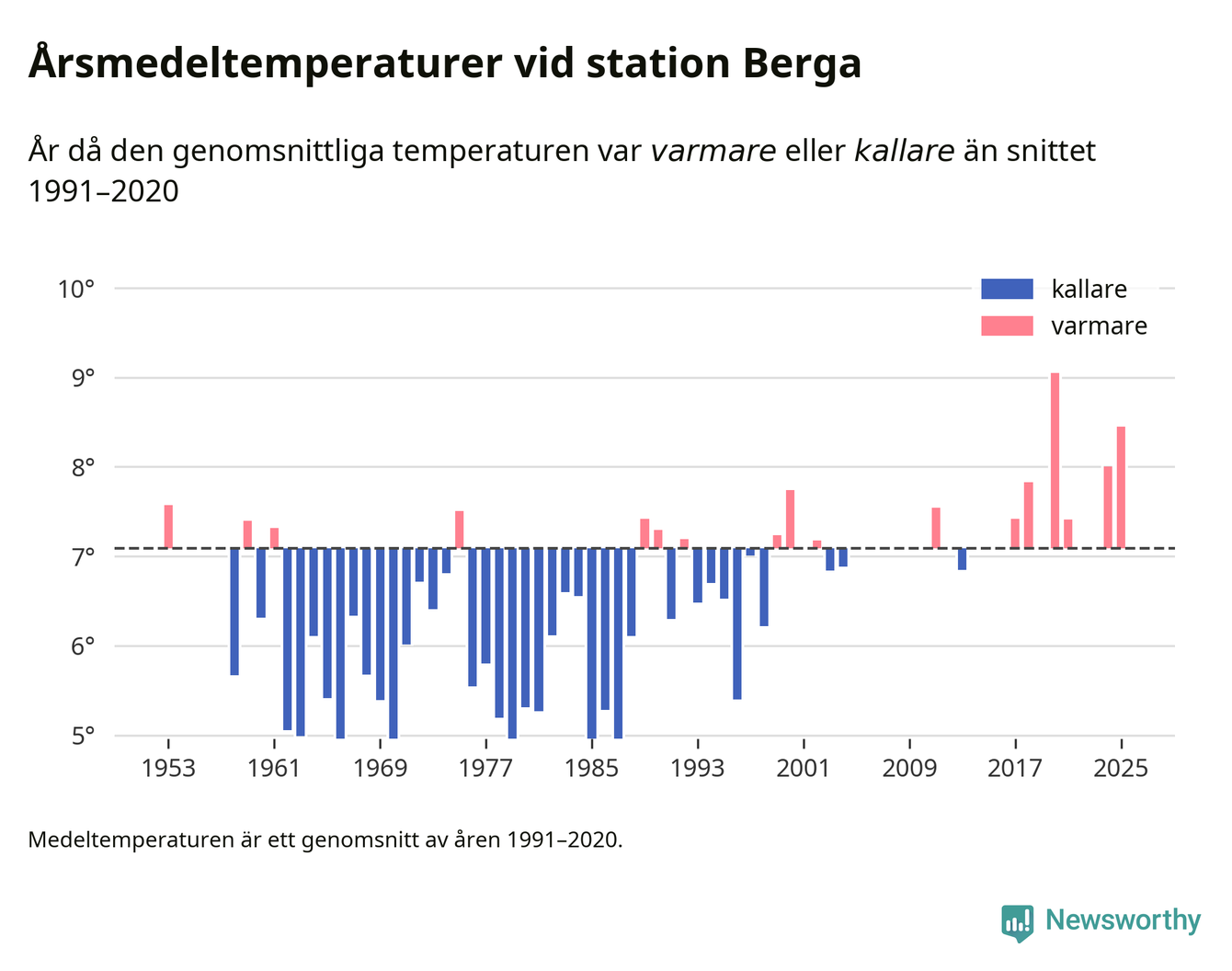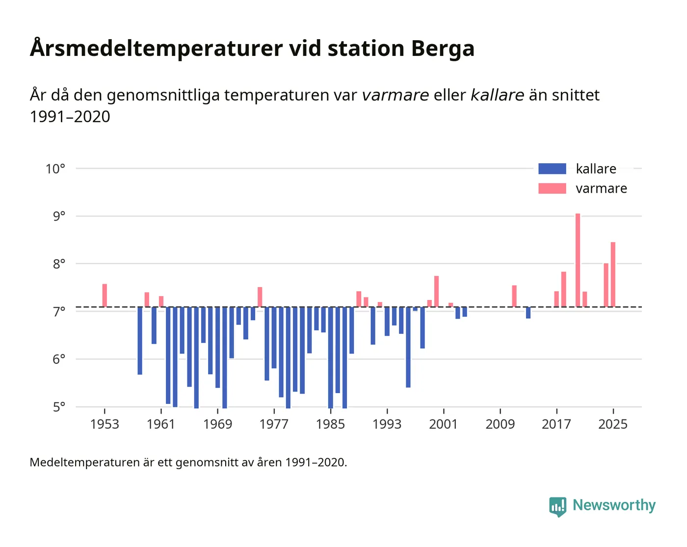 Årsmedeltemperaturen vid Berga elva kilometer söder om Handen1 – den enda aktiva, SMHI-anslutna stationen som mäter medeltemperaturer i Haninge kommun – var under 2025 8,5 grader, 1,4 grader högre än genomsnittet de senaste decennierna. Det visar Newsworthys beräkningar, som bygger på delvis preliminär observationsdata från SMHI.