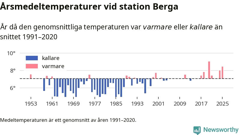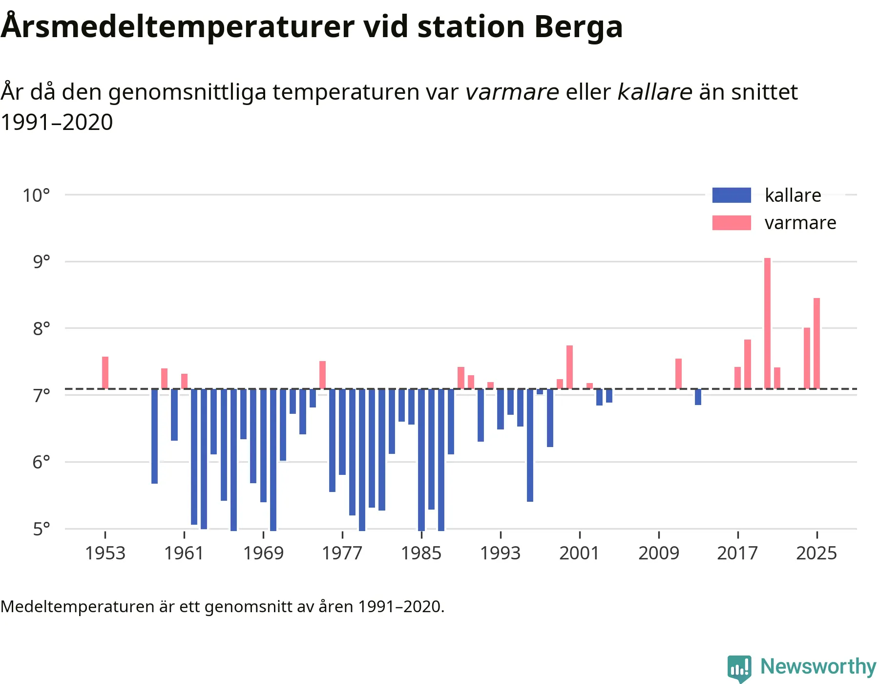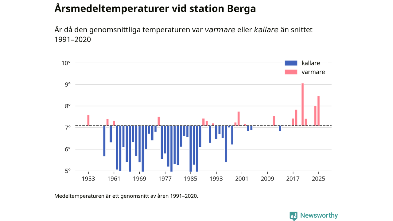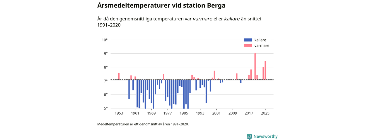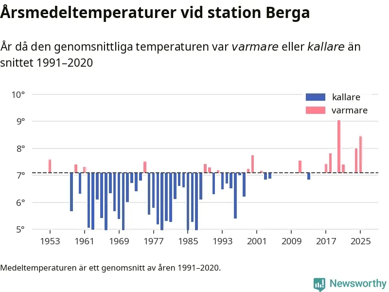Årsmedeltemperaturen vid Berga elva kilometer söder om Handen1 – den enda aktiva, SMHI-anslutna stationen som mäter medeltemperaturer i Haninge kommun – var under 2025 8,5 grader, 1,4 grader högre än genomsnittet de senaste decennierna. Det visar Newsworthys beräkningar, som bygger på delvis preliminär observationsdata från SMHI.