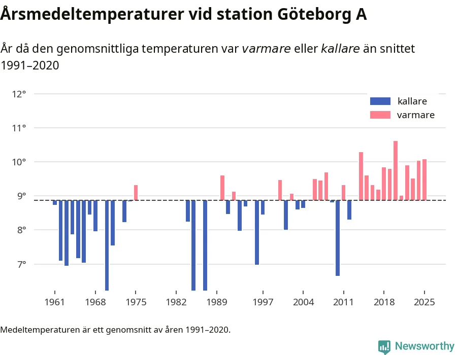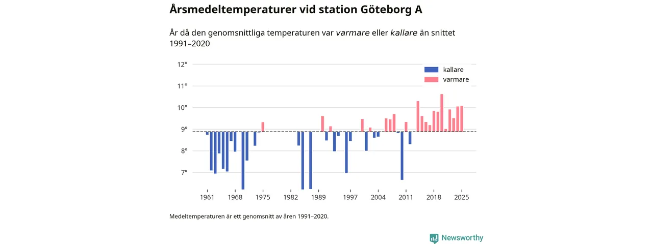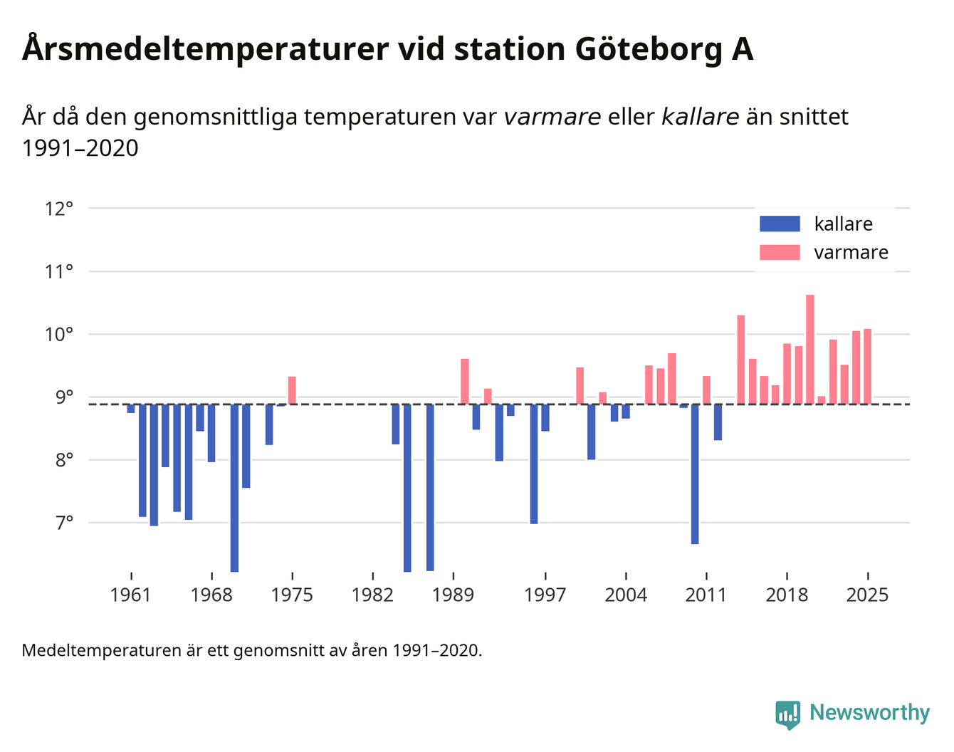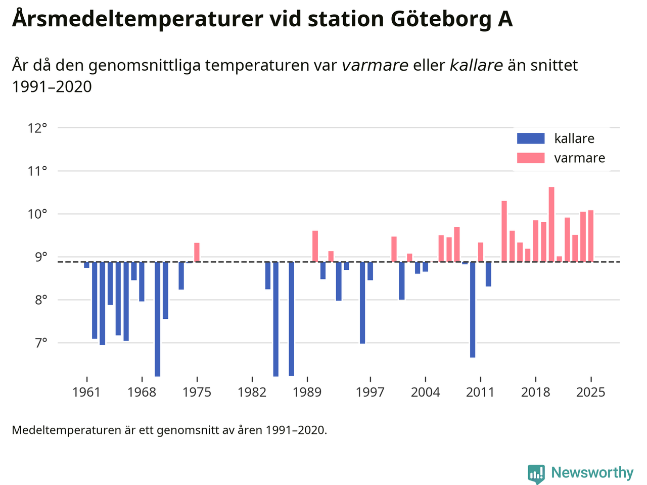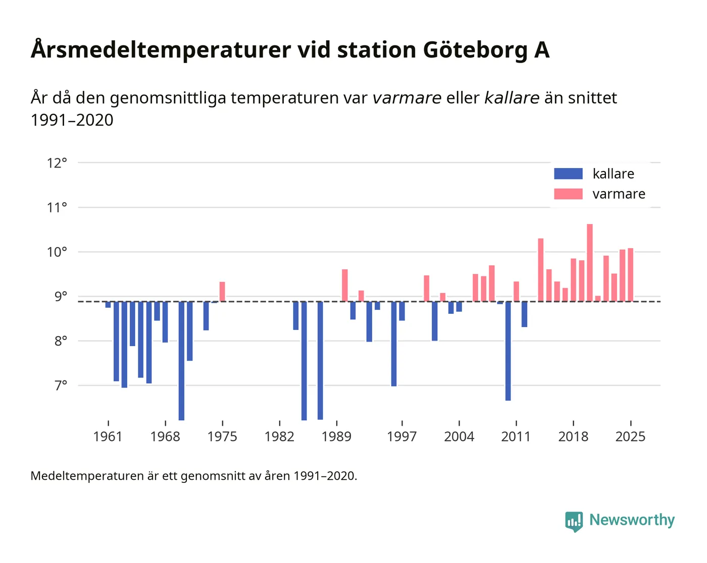 Årsmedeltemperaturen vid Göteborg A sju kilometer väster om centrala Partille1 var under 2025 10,1 grader, 1,2 grader högre än genomsnittet de senaste decennierna. Det visar Newsworthys beräkningar, som bygger på delvis preliminär observationsdata från SMHI.