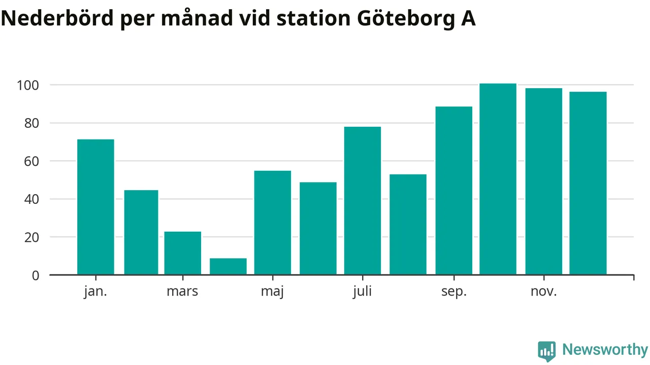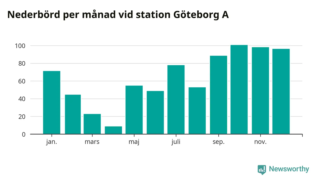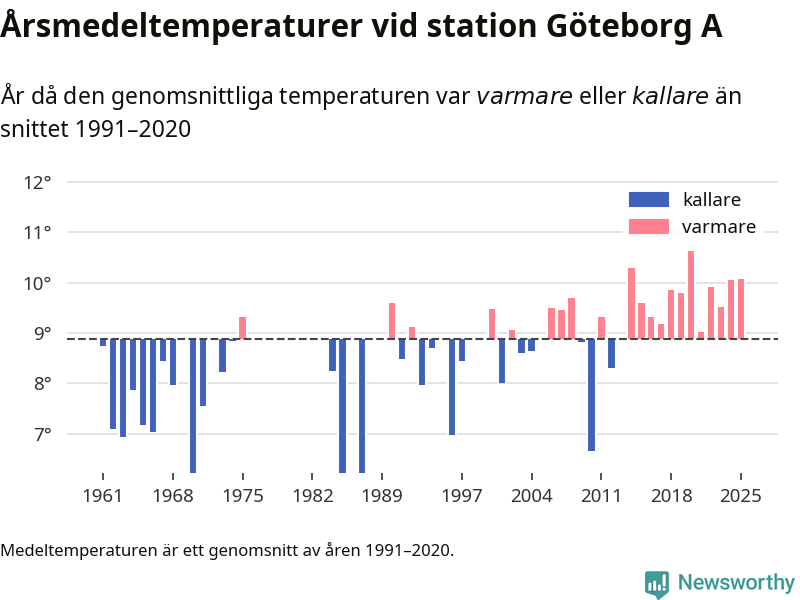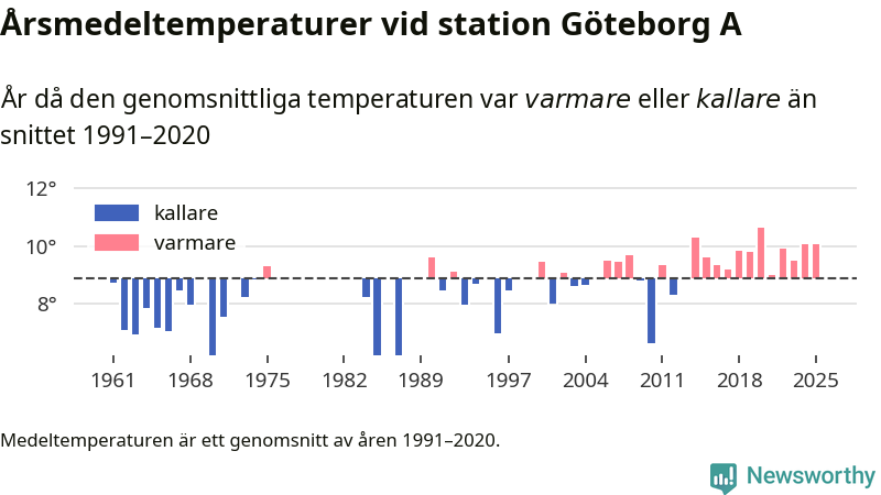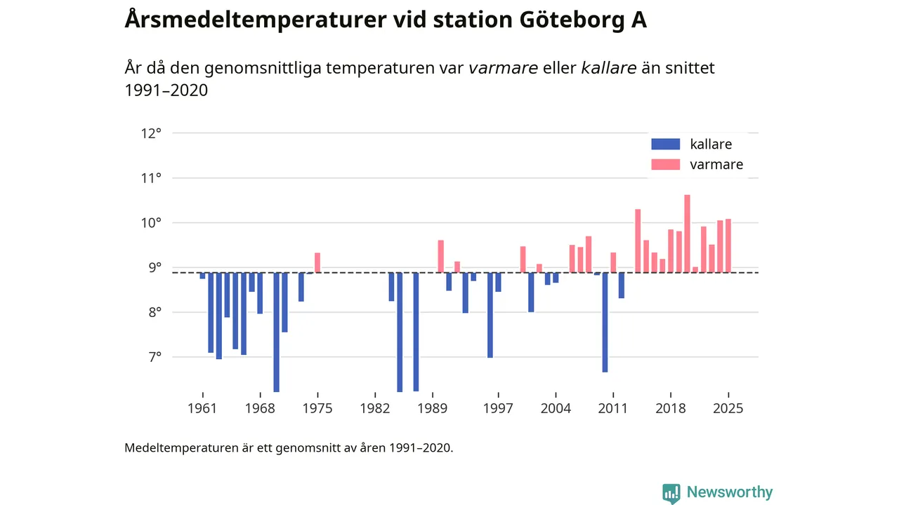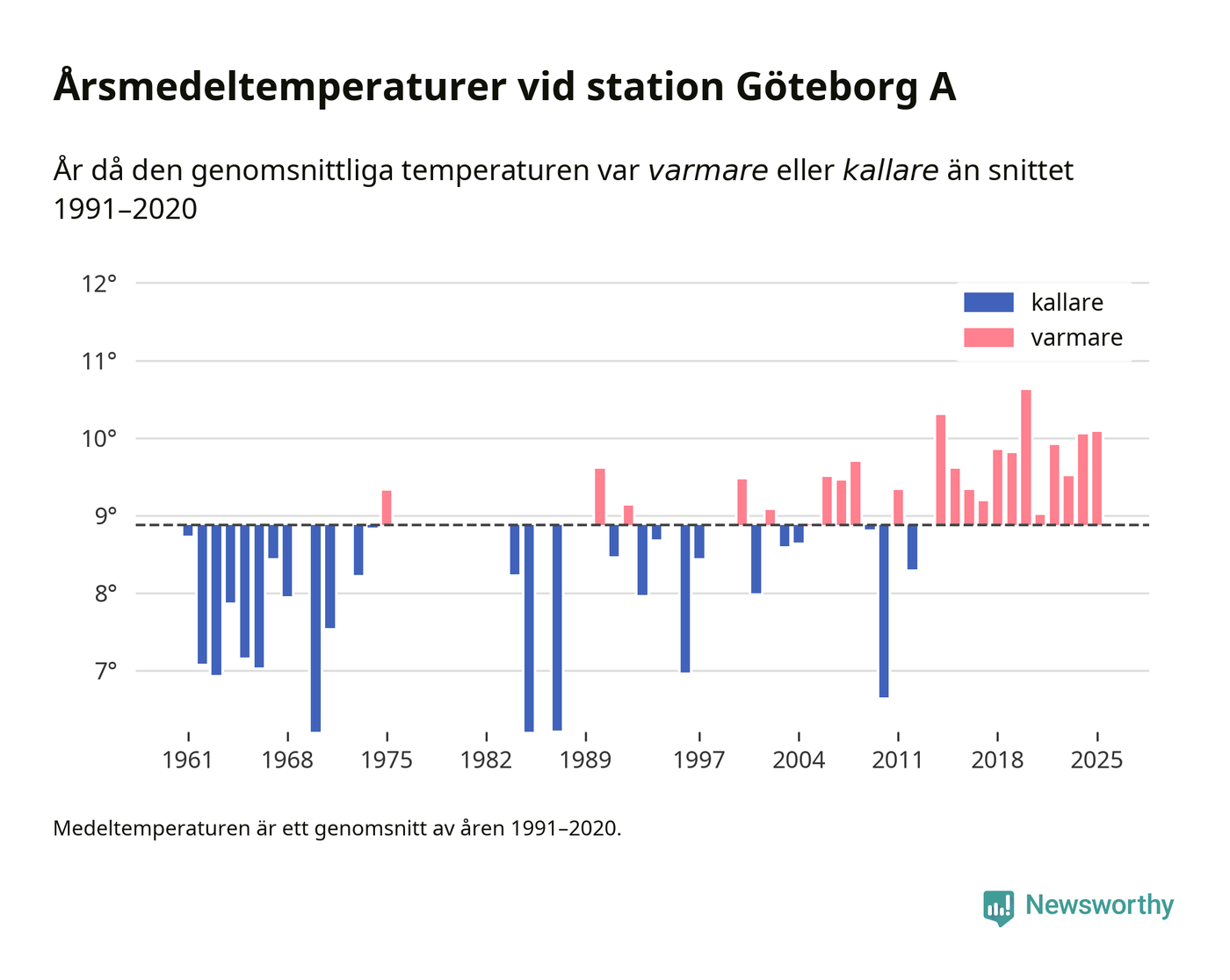 Årsmedeltemperaturen vid Göteborg A sju kilometer väster om centrala Partille1 var under 2025 10,1 grader, 1,2 grader högre än genomsnittet de senaste decennierna. Det visar Newsworthys beräkningar, som bygger på delvis preliminär observationsdata från SMHI.