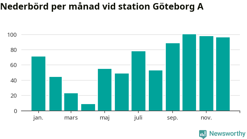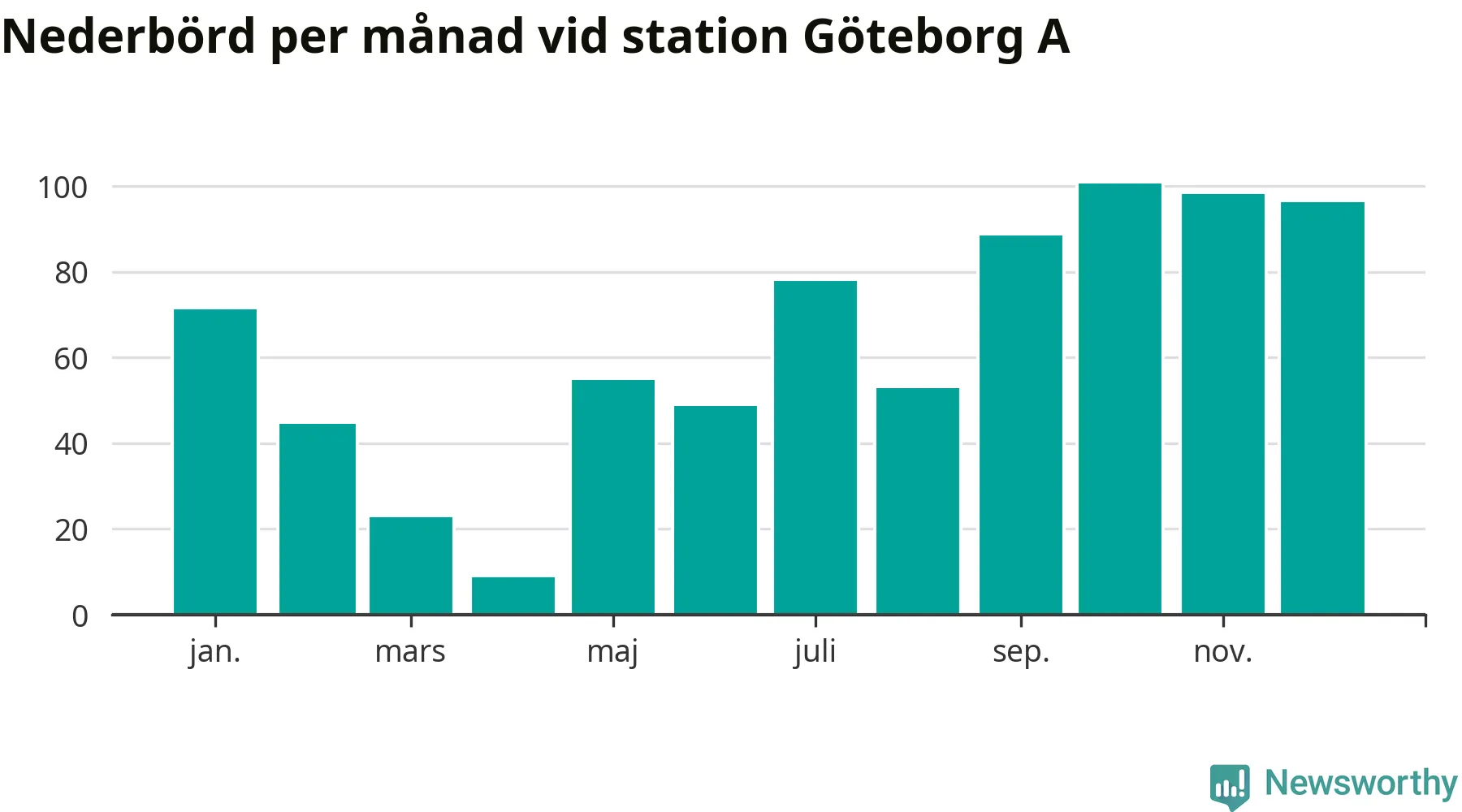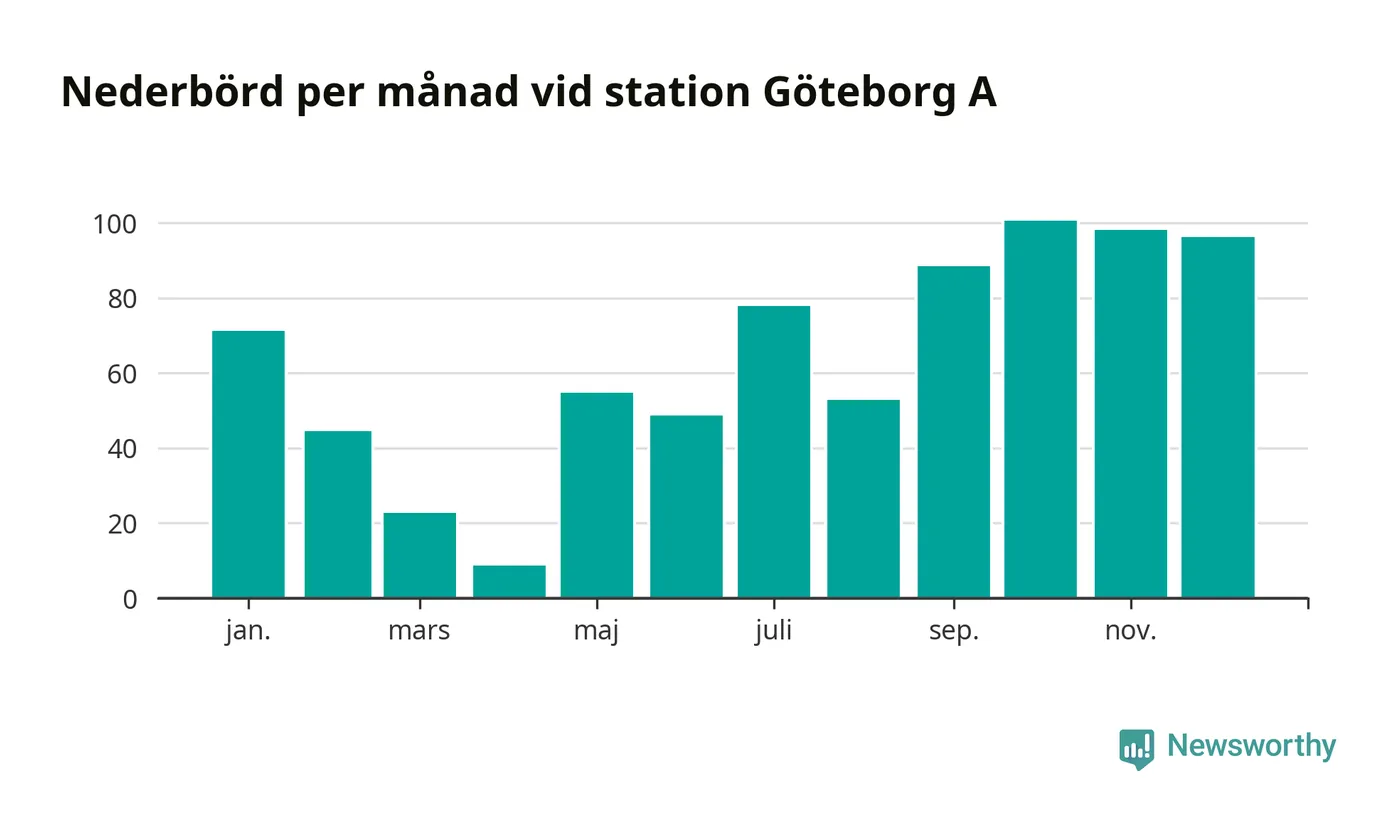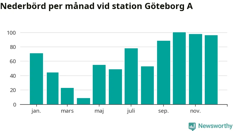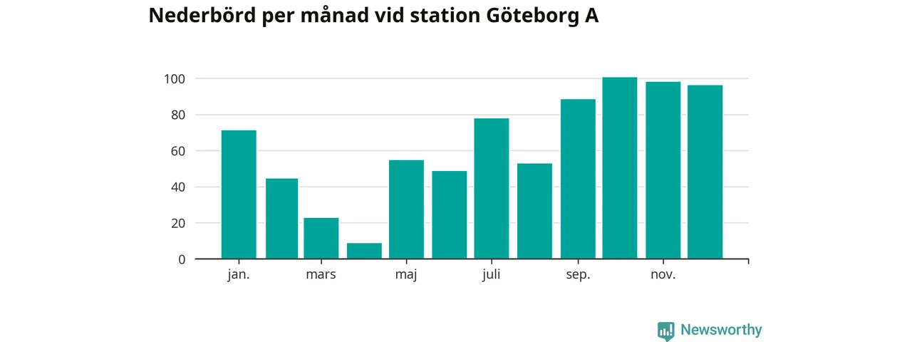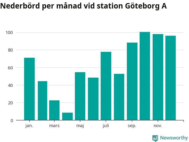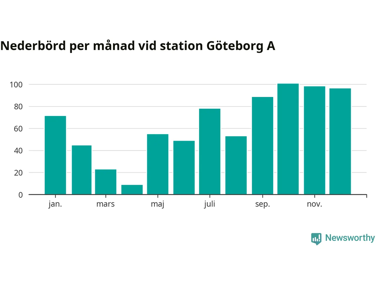 Nederbördsmässigt var 2025 ett torrare år än vanligt vid Göteborg A. Totalt föll 765 millimeter nederbörd vid stationen, att jämföra med de senaste tre decenniernas genomsnitt på 912 millimeter. Månaden med mest nederbörd var oktober, med 101 millimeter.