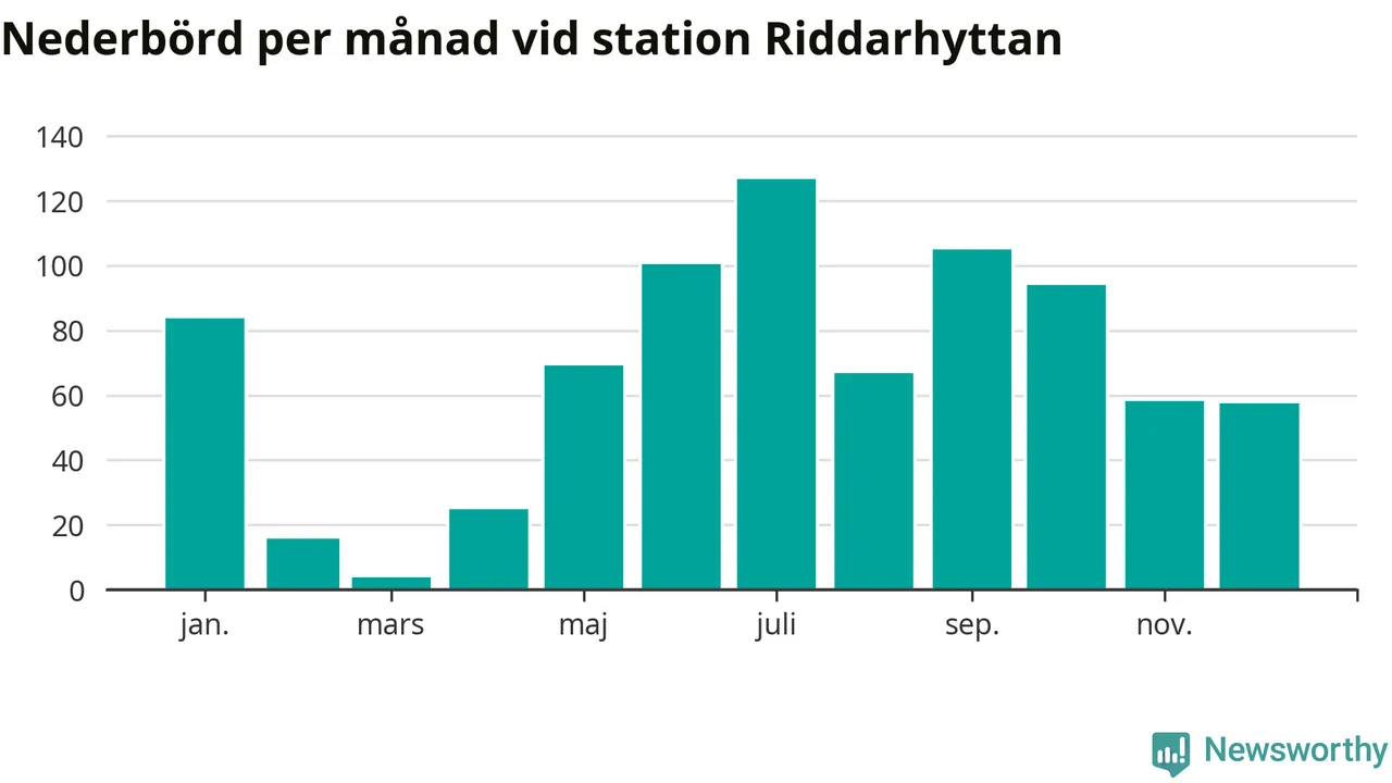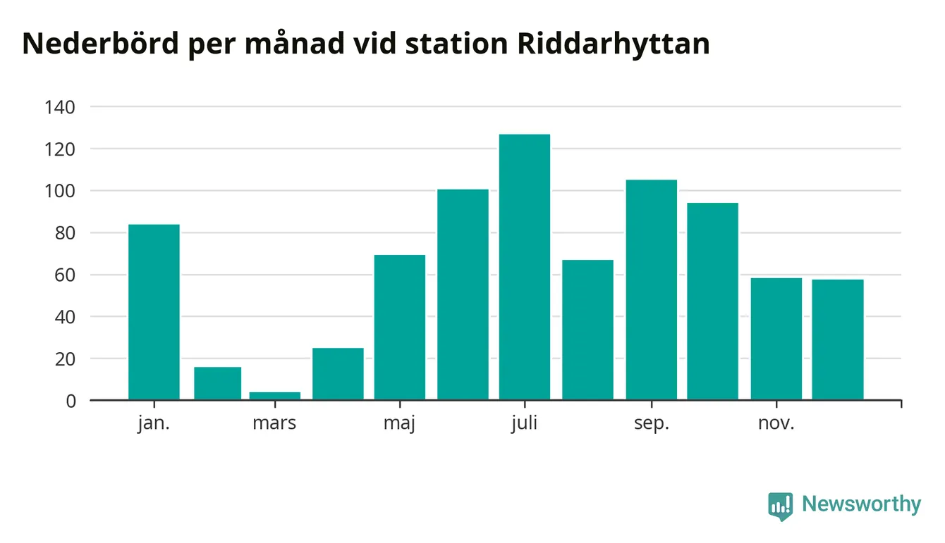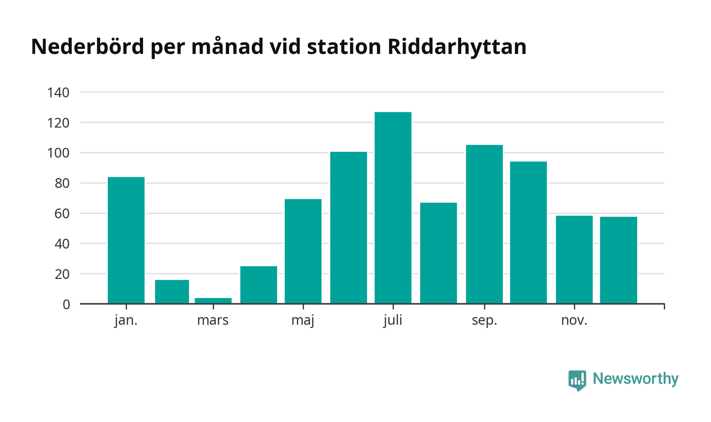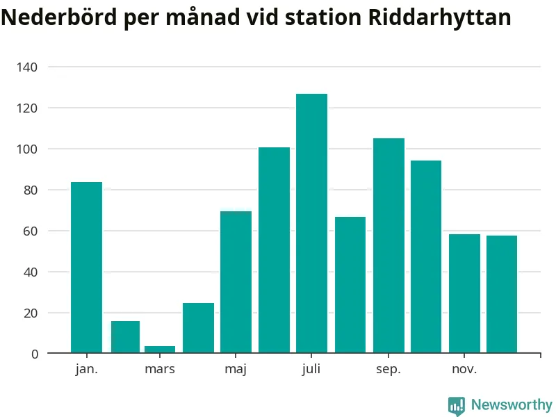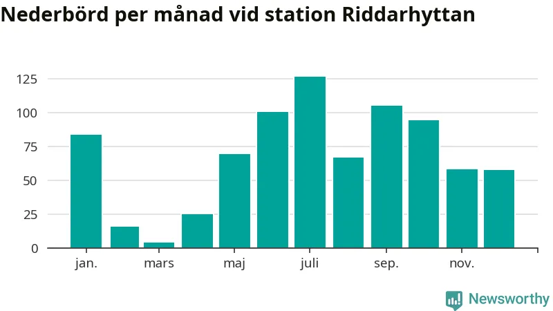 Nederbördsmässigt var 2025 ett blötare år än vanligt, åtminstone vid Riddarhyttan, nio kilometer väster om centrala Skinnskatteberg2. Totalt föll 806 millimeter nederbörd vid stationen, att jämföra med de senaste tre decenniernas genomsnitt på 739 millimeter. Månaden med mest nederbörd var juli, med 127 millimeter.