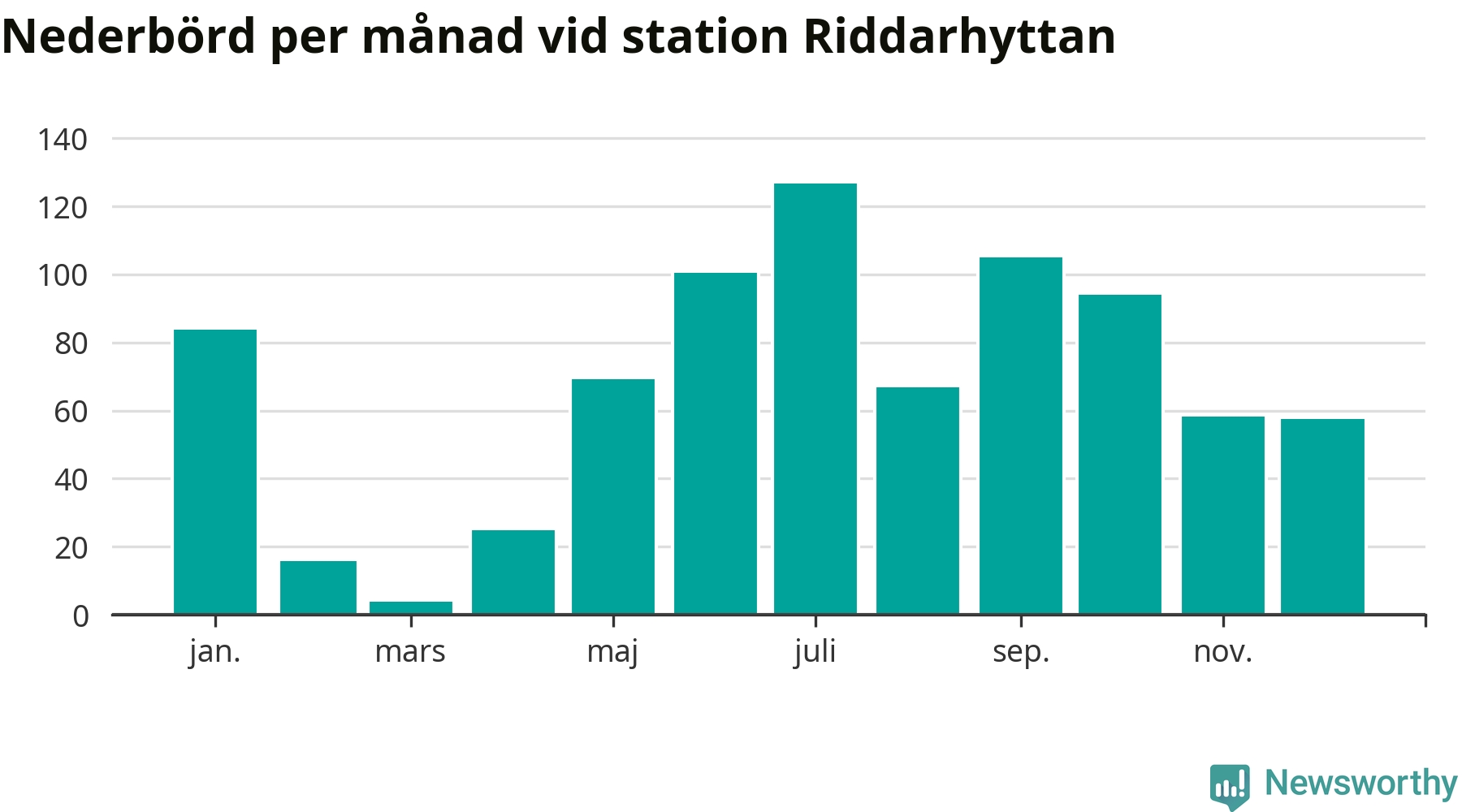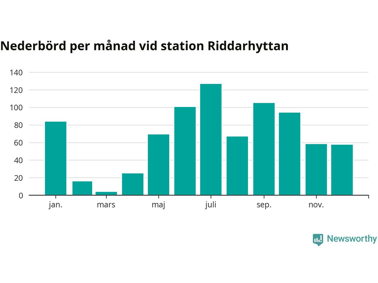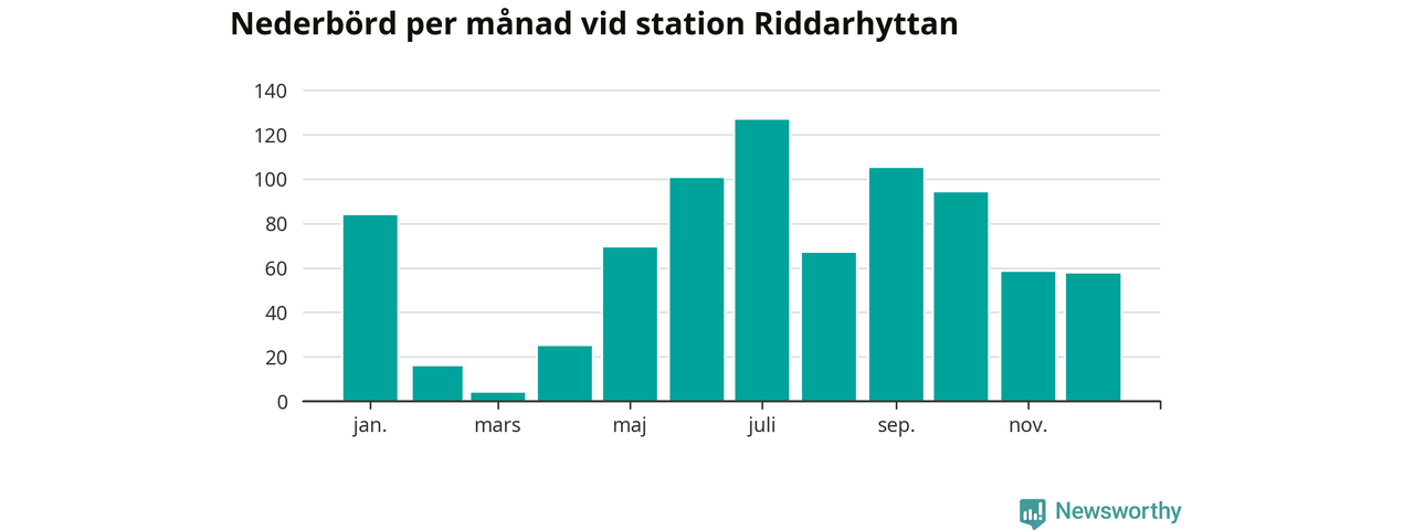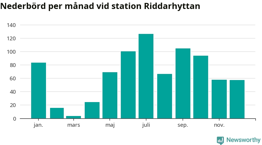 Nederbördsmässigt var 2025 ett blötare år än vanligt, åtminstone vid Riddarhyttan, nio kilometer väster om centrala Skinnskatteberg2. Totalt föll 806 millimeter nederbörd vid stationen, att jämföra med de senaste tre decenniernas genomsnitt på 739 millimeter. Månaden med mest nederbörd var juli, med 127 millimeter.