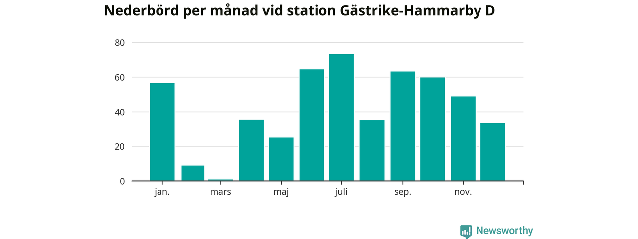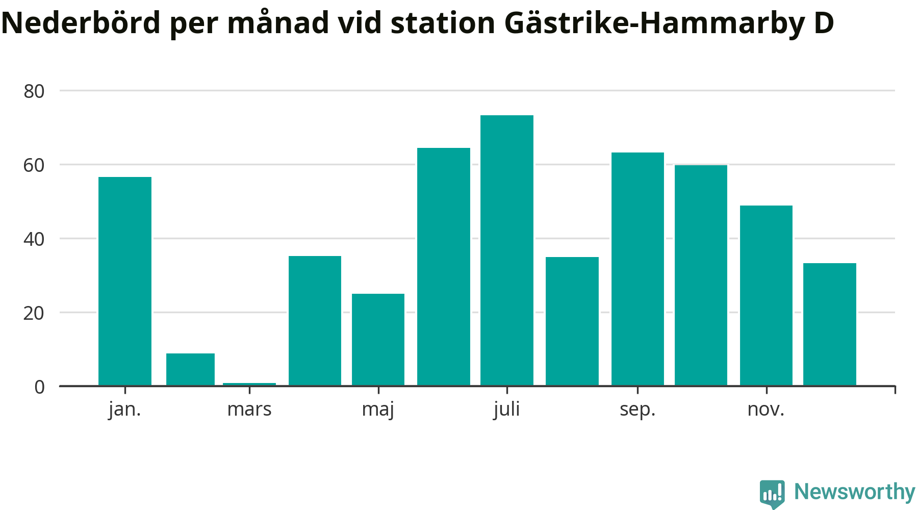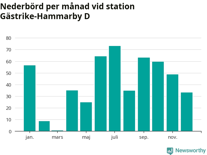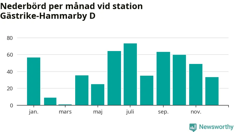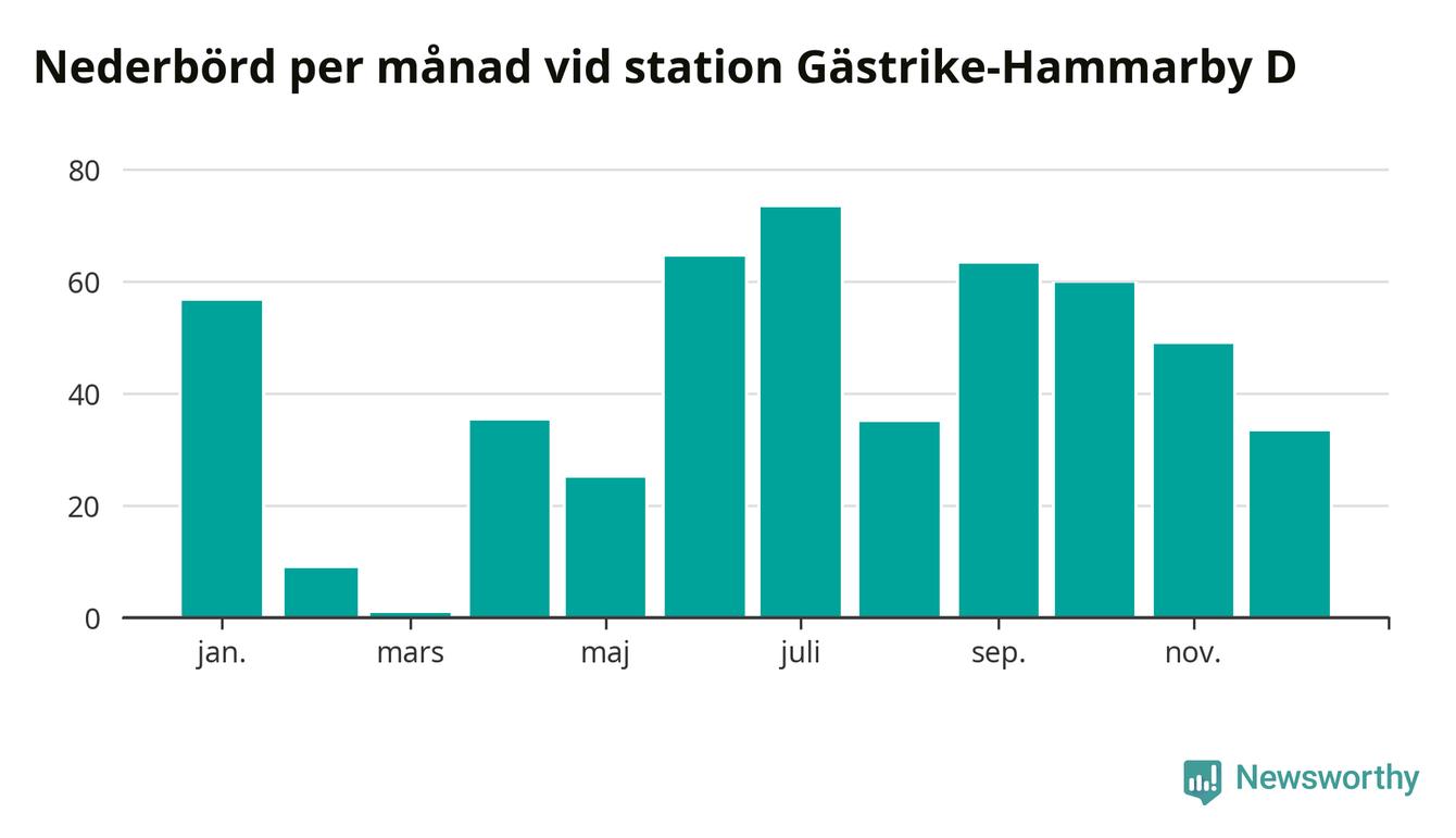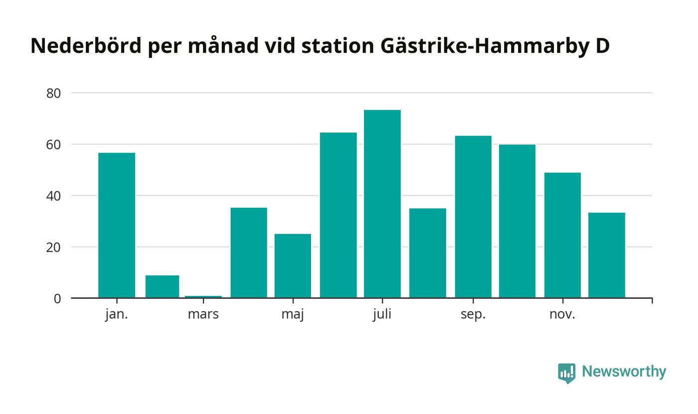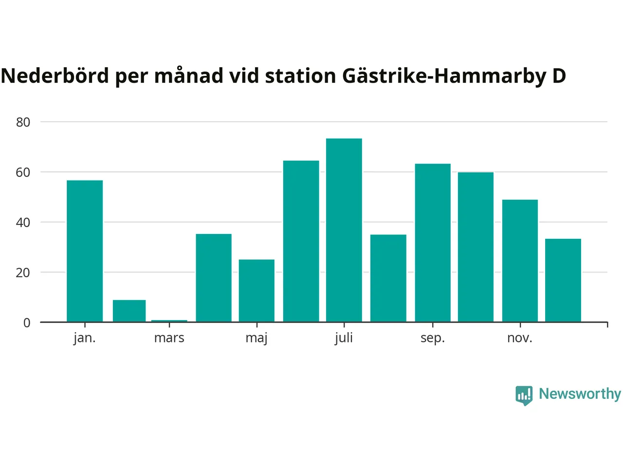 Nederbördsmässigt var 2025 ett torrare år än vanligt , åtminstone vid Gästrike-Hammarby D, tolv kilometer sydväst om centrala Sandviken2. Totalt föll 504 millimeter nederbörd vid stationen, att jämföra med de senaste tre decenniernas genomsnitt på 591 millimeter. Månaden med mest nederbörd var juli, med 73 millimeter.