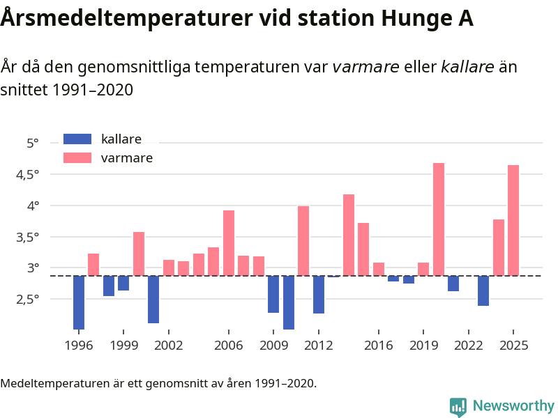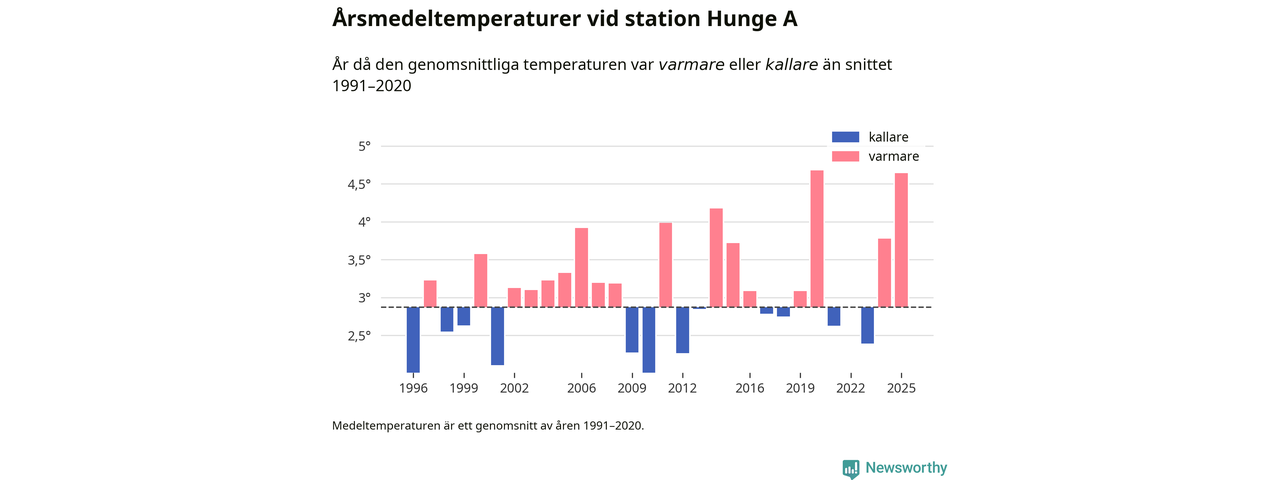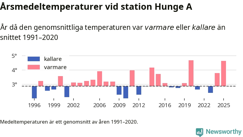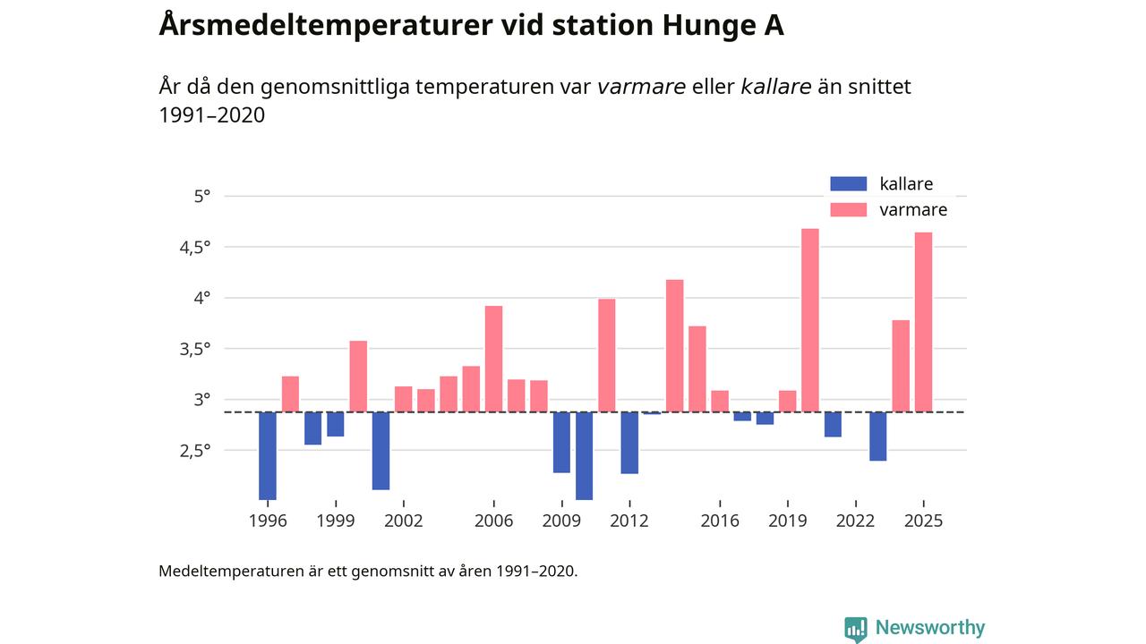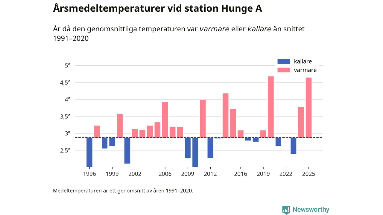 2025 blev ett av de tre varmaste åren som uppmätts på jorden, och även i Sverige var temperaturerna över de normala. Vid mätstationen Hunge A var årsmedeltemperaturen den näst högsta som uppmätts sedan 1996, enligt preliminära uppgifter.