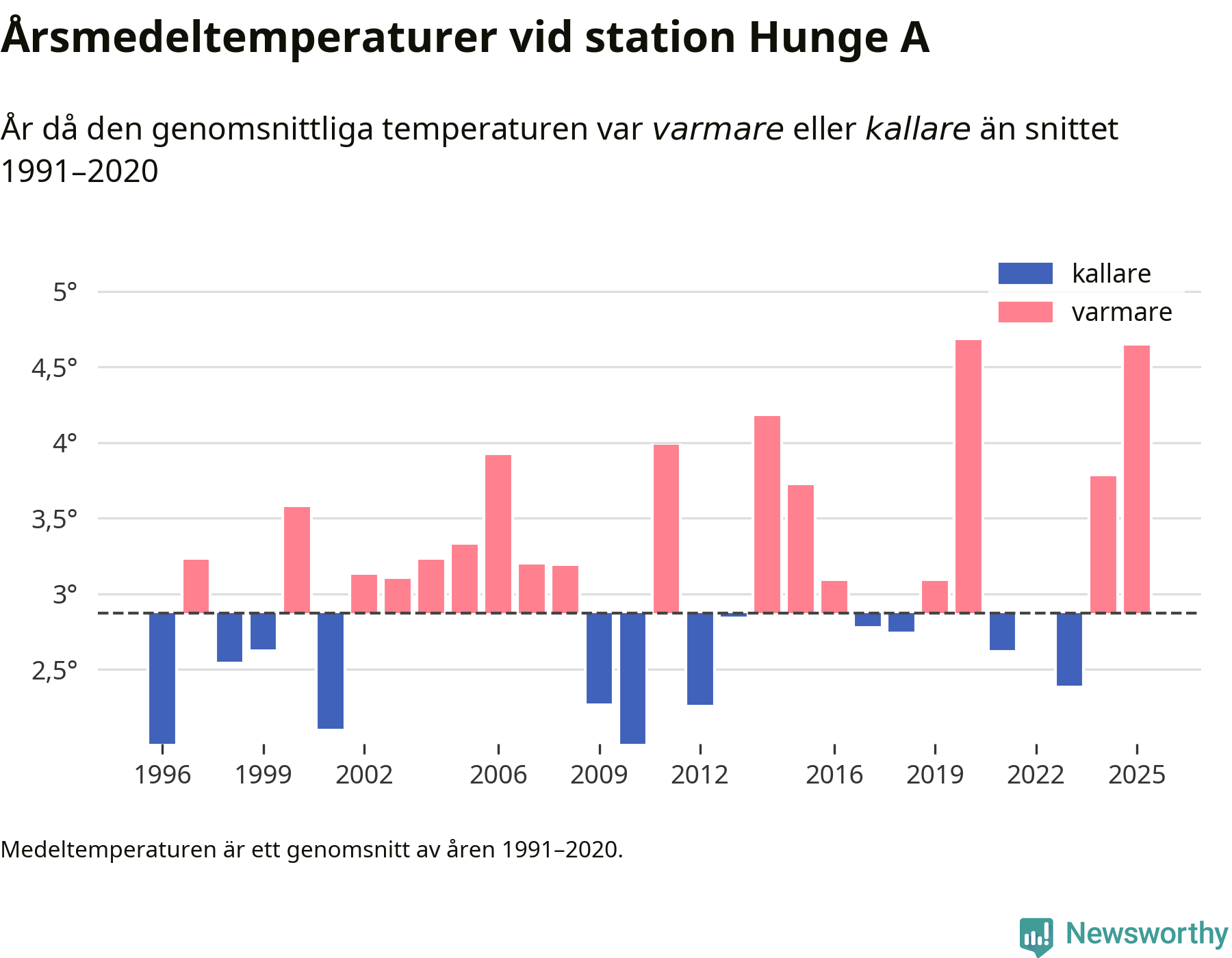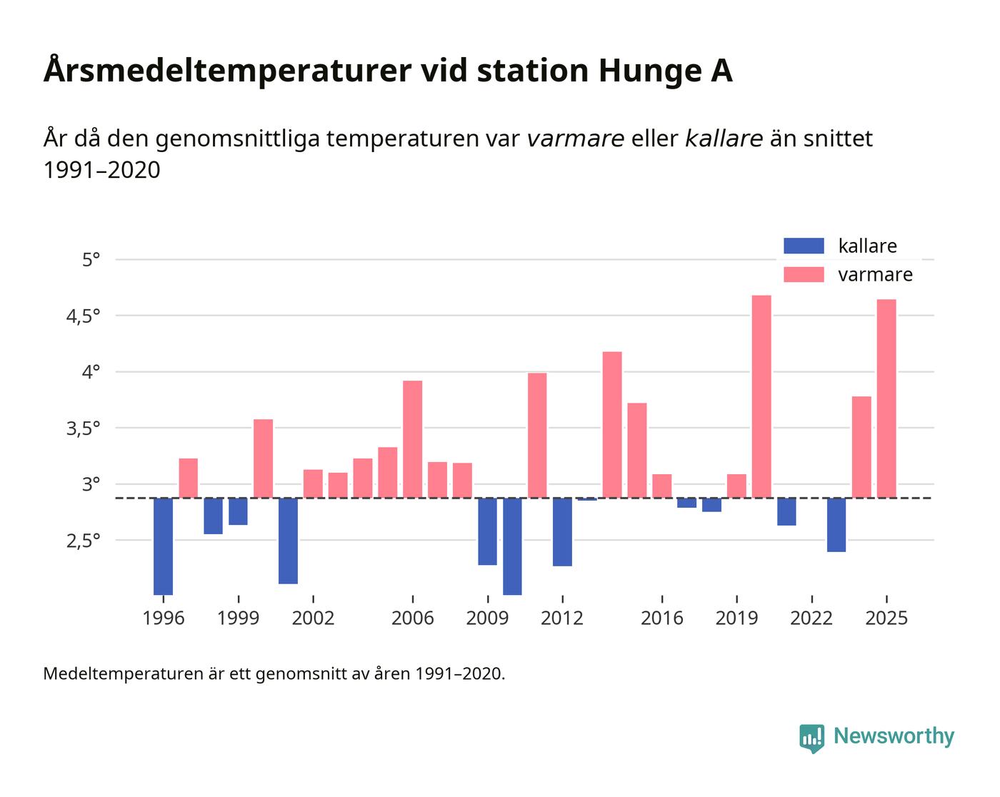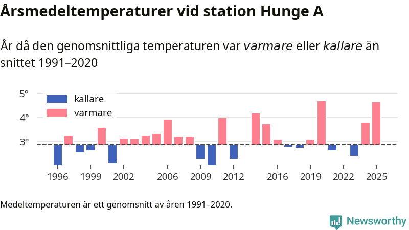 Årsmedeltemperaturen vid Hunge A 17 kilometer väster om centrala Bräcke – den enda aktiva, SMHI-anslutna stationen som mäter medeltemperaturer i Bräcke kommun – var under 2025 4,6 grader, 1,8 grader högre än genomsnittet de senaste decennierna. Det är den näst högsta noteringen sedan 1996, visar Newsworthys beräkningar baserade på delvis preliminär observationsdata från SMHI.