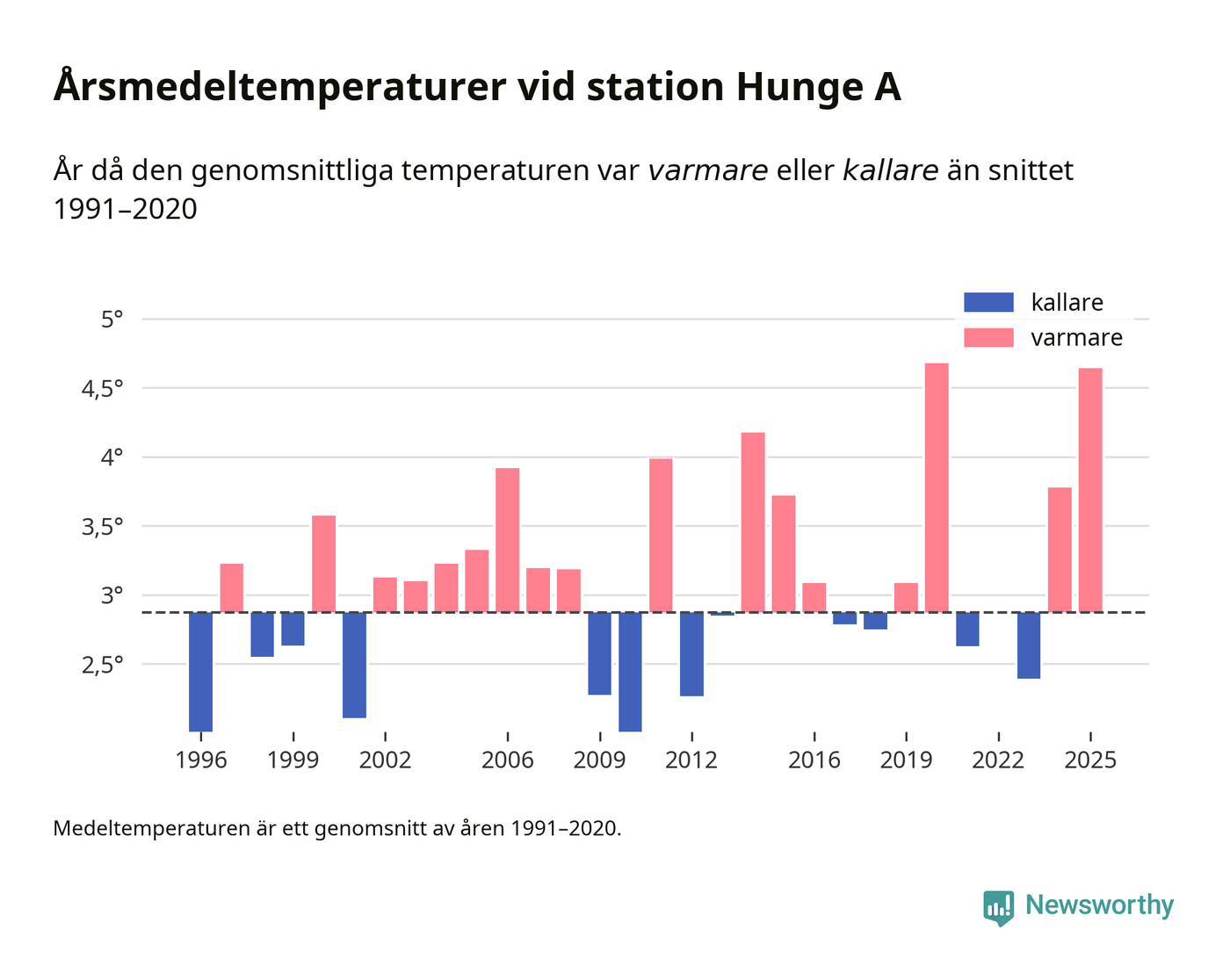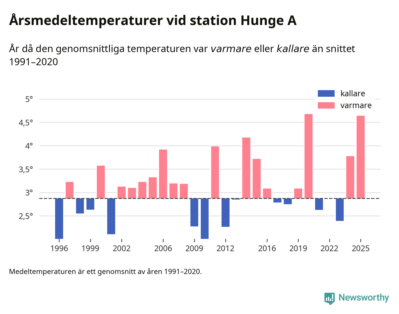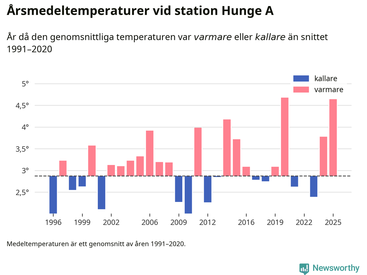 Årsmedeltemperaturen vid Hunge A 17 kilometer väster om centrala Bräcke – den enda aktiva, SMHI-anslutna stationen som mäter medeltemperaturer i Bräcke kommun – var under 2025 4,6 grader, 1,8 grader högre än genomsnittet de senaste decennierna. Det är den näst högsta noteringen sedan 1996, visar Newsworthys beräkningar baserade på delvis preliminär observationsdata från SMHI.