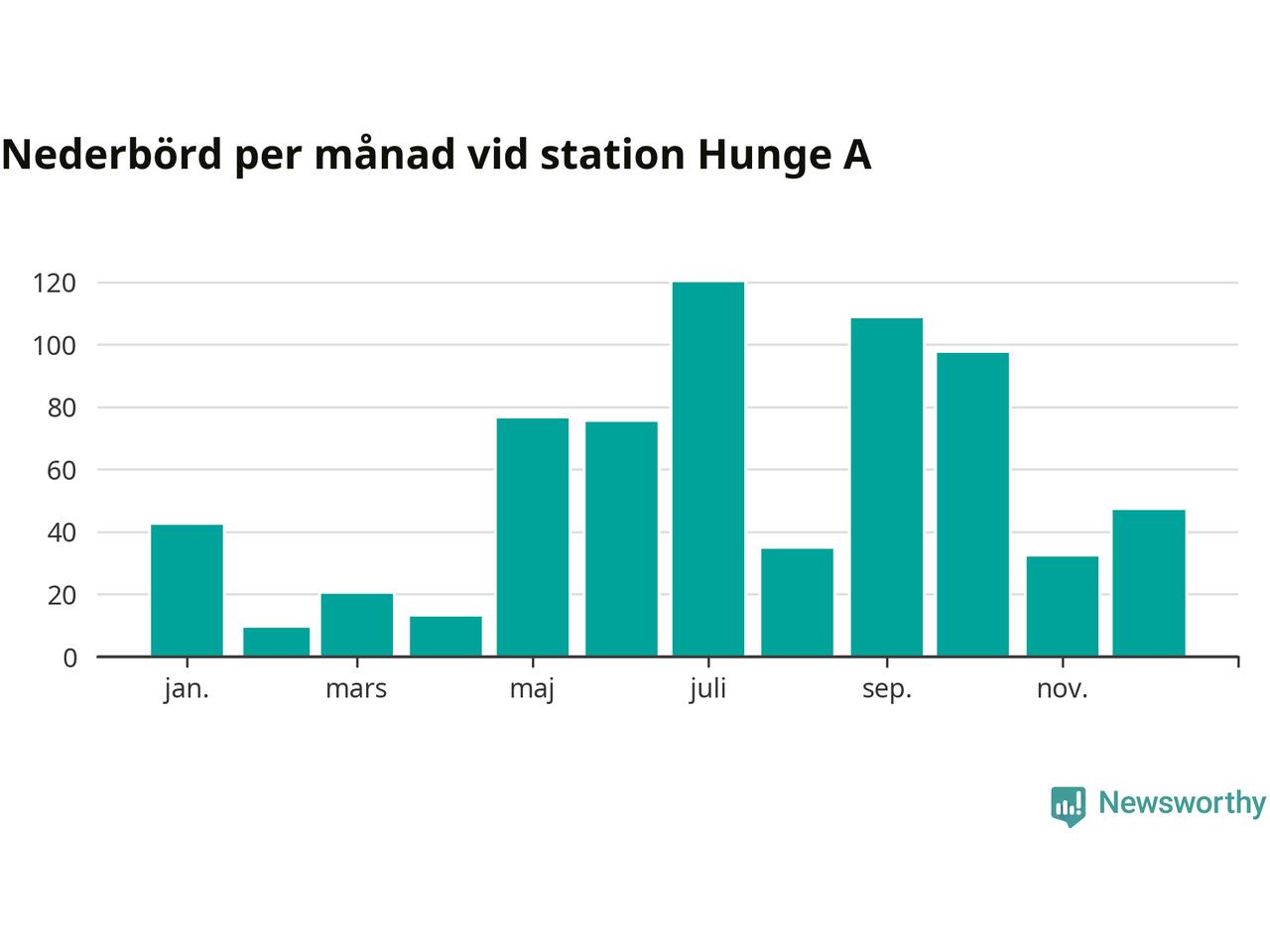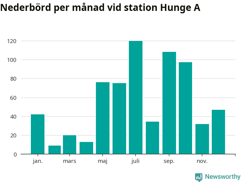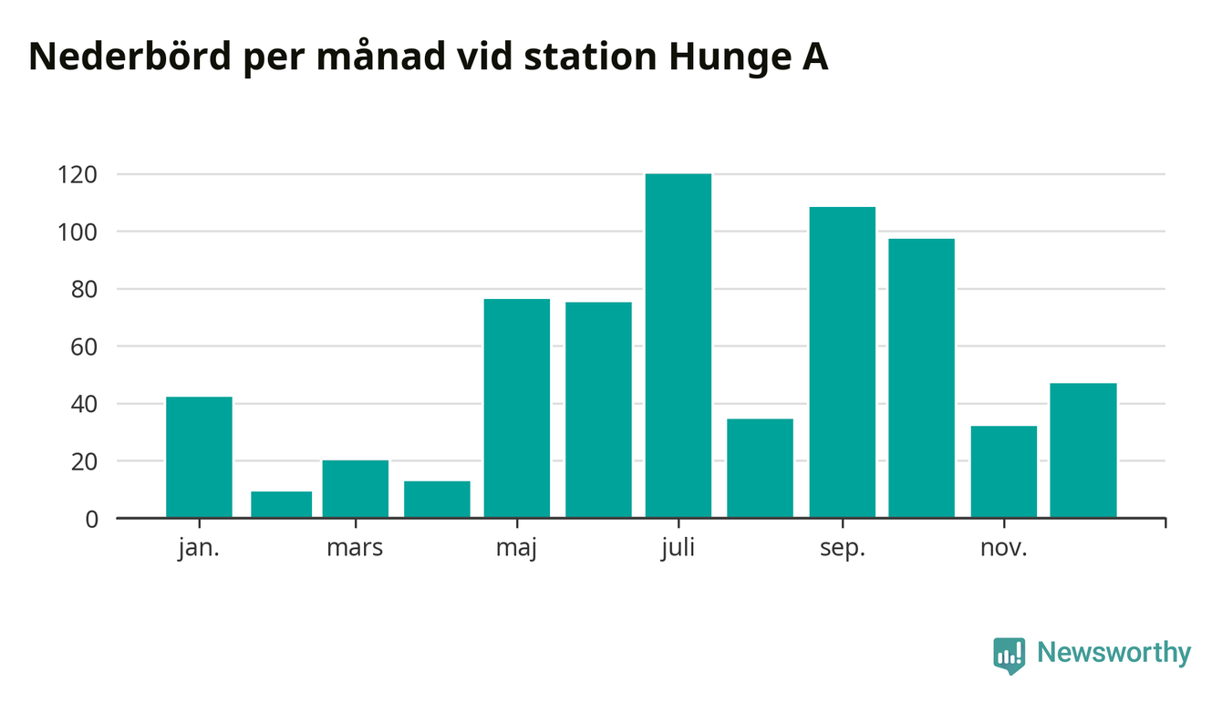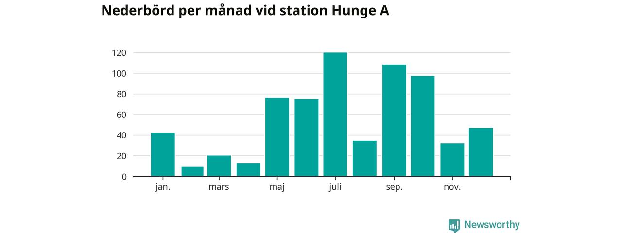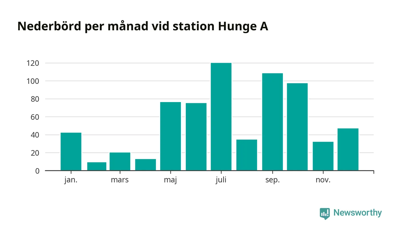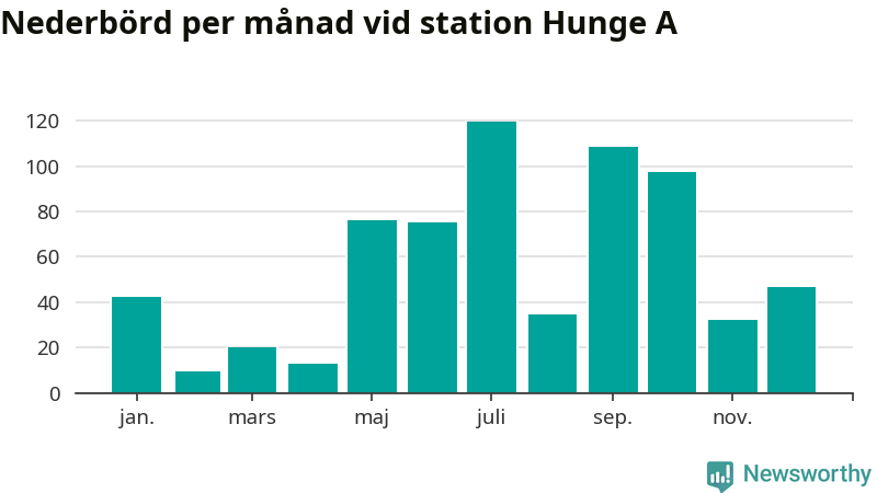 Nederbördsmässigt var 2025 ett blötare år än vanligt vid Hunge A. Totalt föll 676 millimeter nederbörd vid stationen, att jämföra med de senaste tre decenniernas genomsnitt på 558 millimeter. Månaden med mest nederbörd var juli, med 120 millimeter.