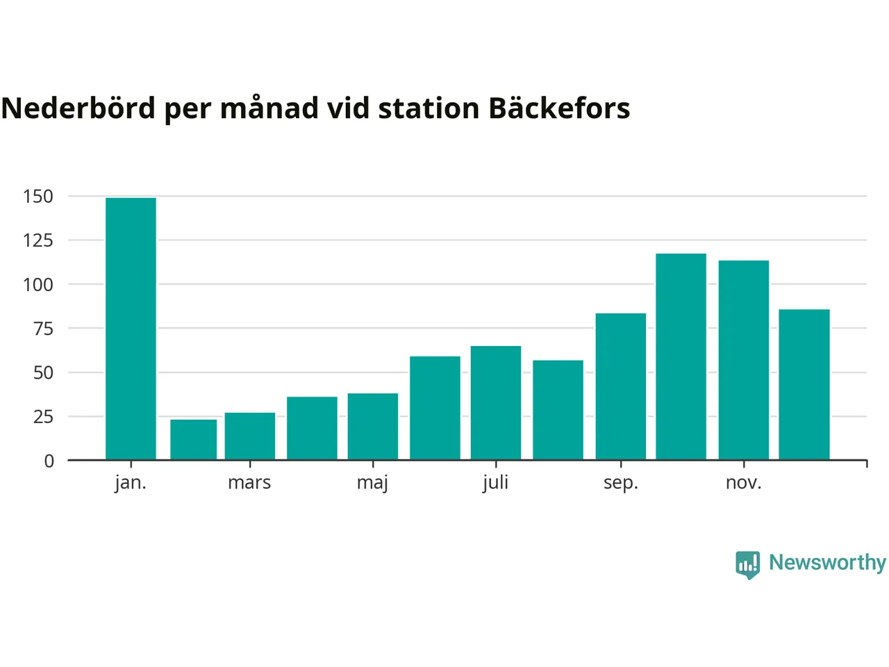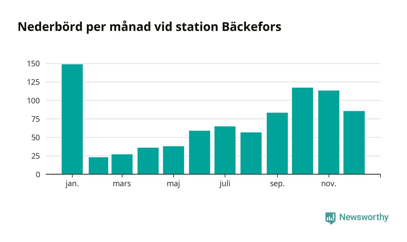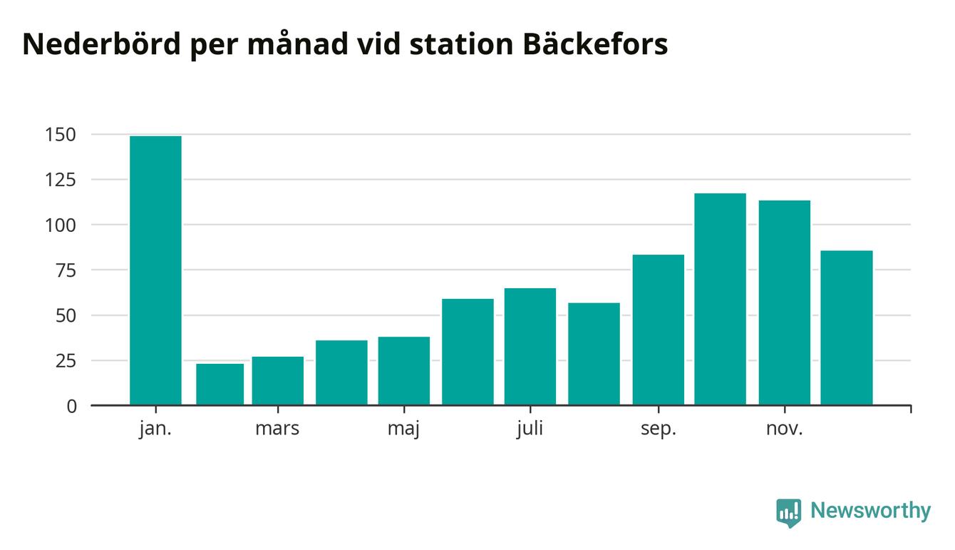 Nederbördsmässigt var 2025 ett torrare år än vanligt , åtminstone vid Bäckefors, 17 kilometer sydöst om centrala Ed3. Totalt föll 852 millimeter nederbörd vid stationen, att jämföra med de senaste tre decenniernas genomsnitt på 998 millimeter. Månaden med mest nederbörd var januari, med 149 millimeter.