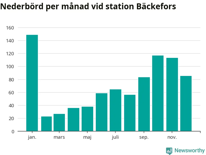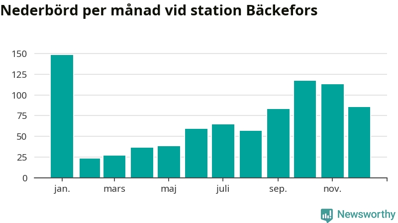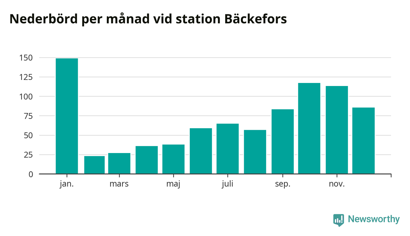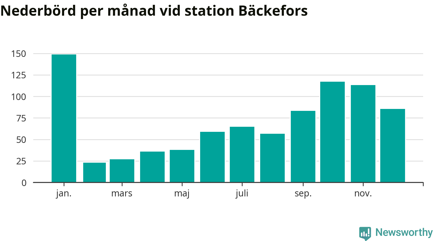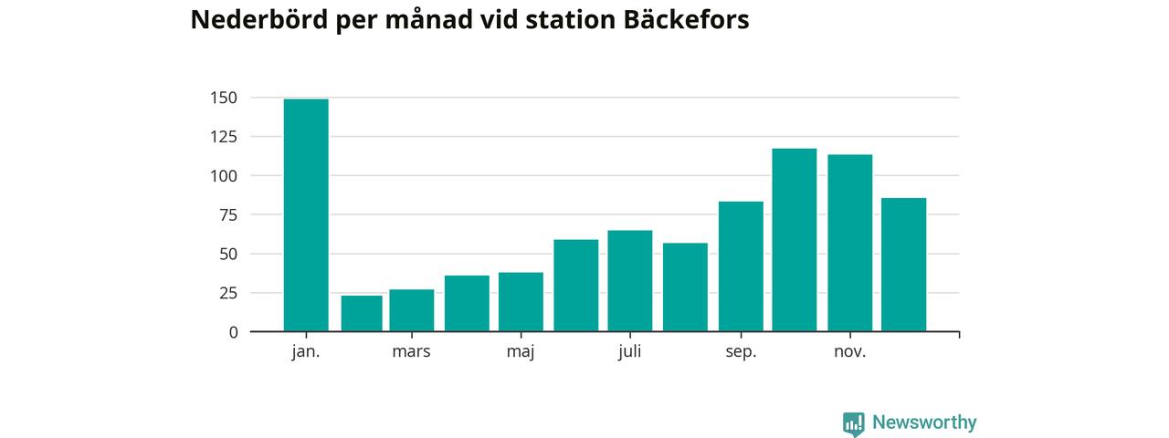 Nederbördsmässigt var 2025 ett torrare år än vanligt , åtminstone vid Bäckefors, 17 kilometer sydöst om centrala Ed3. Totalt föll 852 millimeter nederbörd vid stationen, att jämföra med de senaste tre decenniernas genomsnitt på 998 millimeter. Månaden med mest nederbörd var januari, med 149 millimeter.