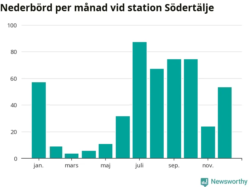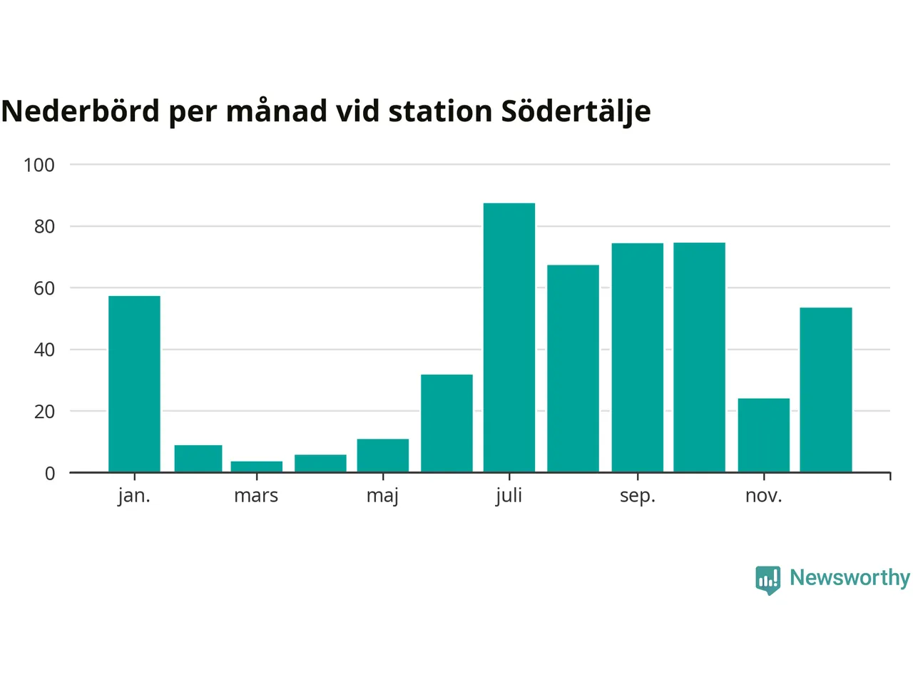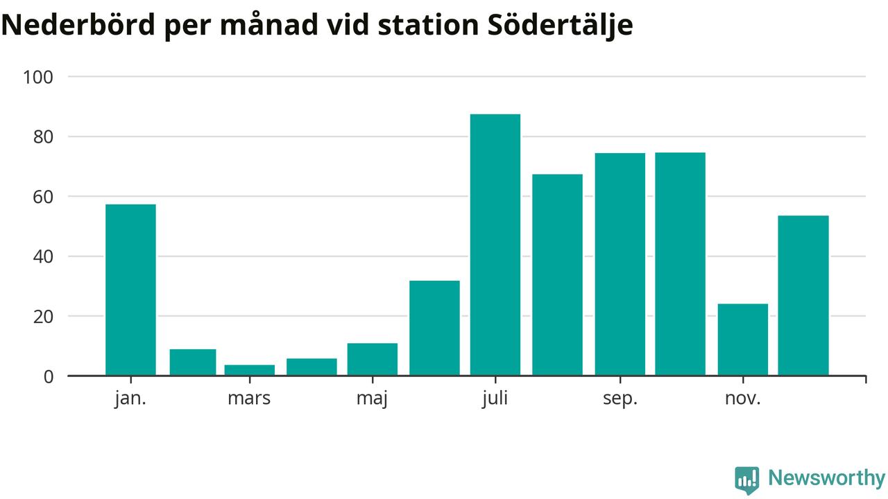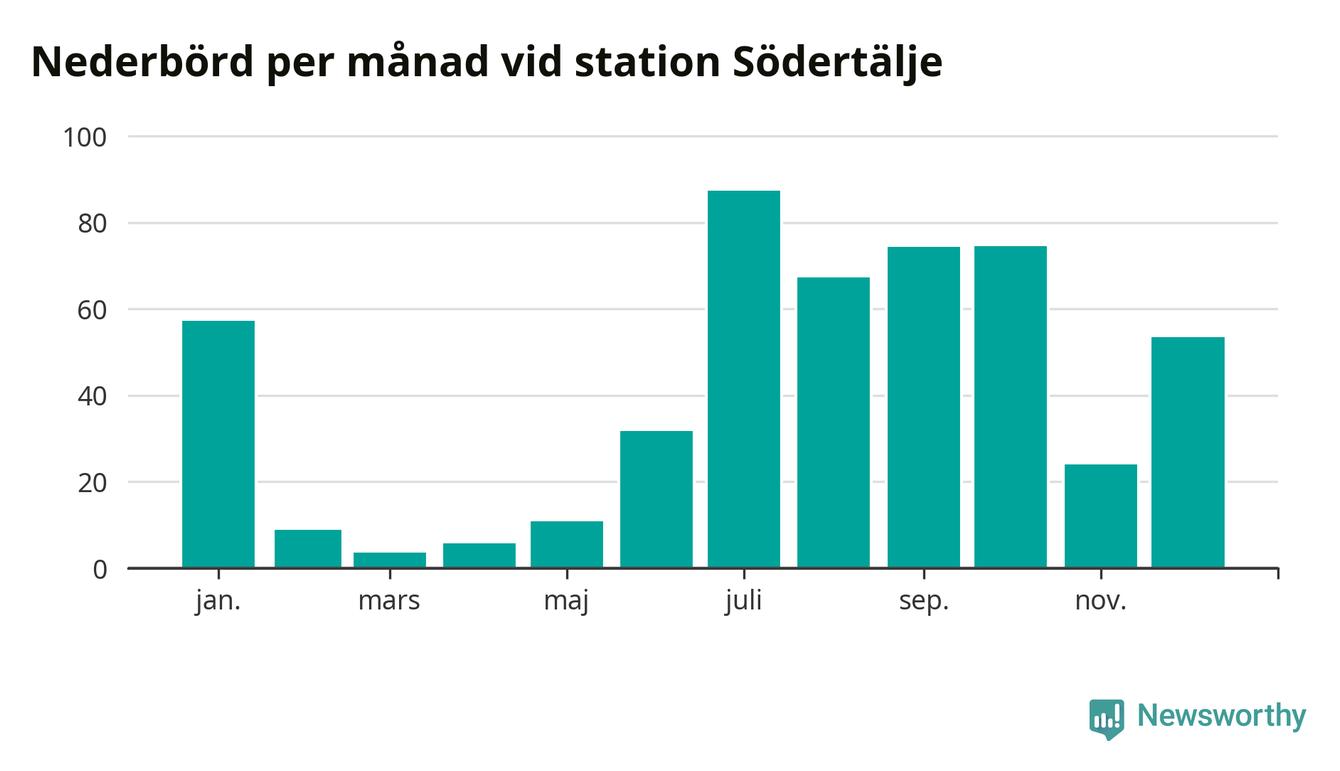 Nederbördsmässigt var 2025 ett torrare år än vanligt vid Södertälje. Totalt föll 499 millimeter nederbörd vid stationen, att jämföra med de senaste tre decenniernas genomsnitt på 640 millimeter. Månaden med mest nederbörd var juli, med 87 millimeter.