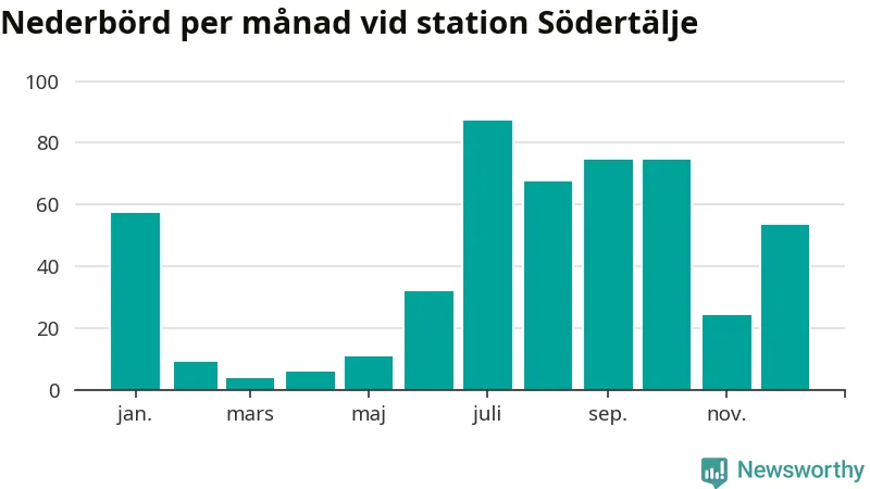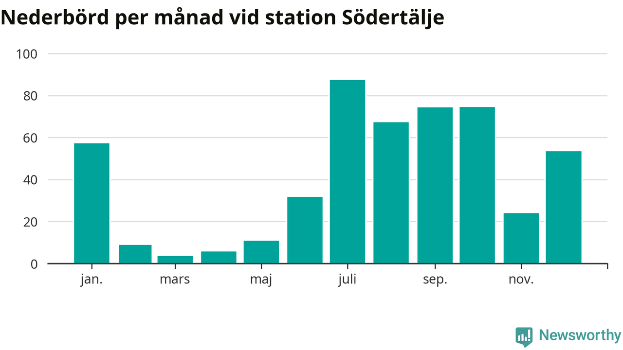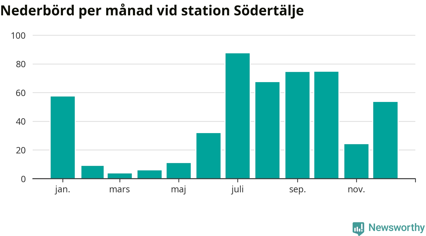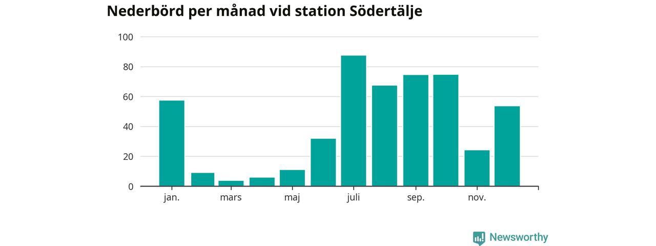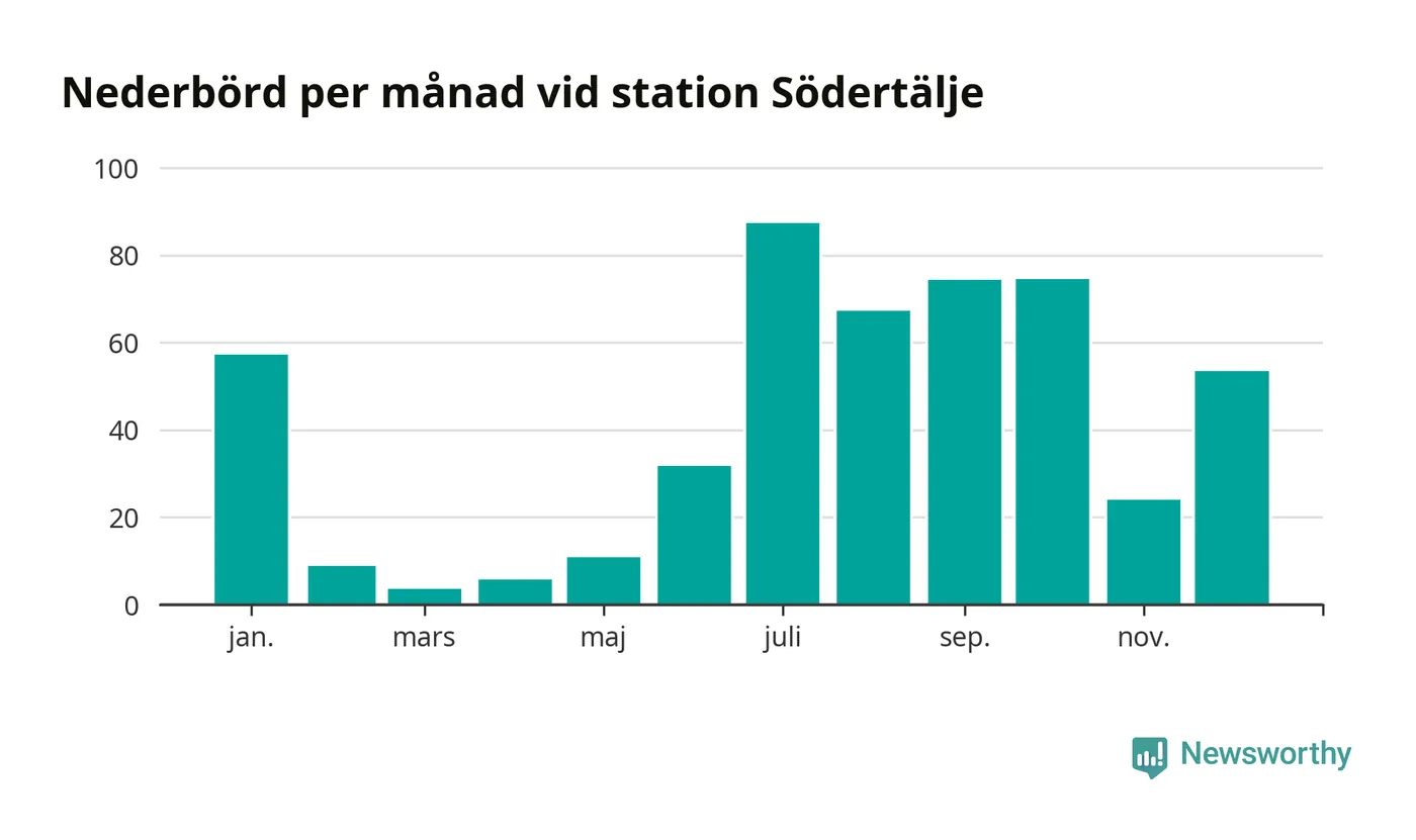 Nederbördsmässigt var 2025 ett torrare år än vanligt vid Södertälje. Totalt föll 499 millimeter nederbörd vid stationen, att jämföra med de senaste tre decenniernas genomsnitt på 640 millimeter. Månaden med mest nederbörd var juli, med 87 millimeter.