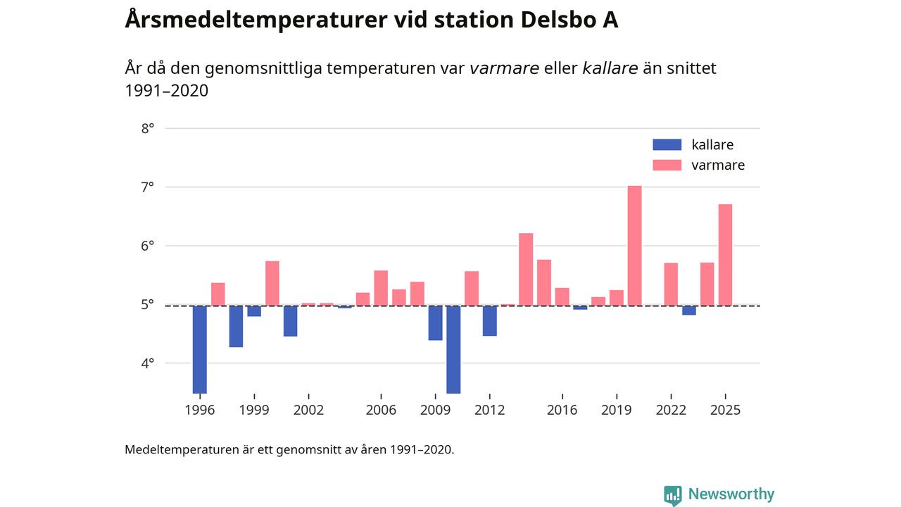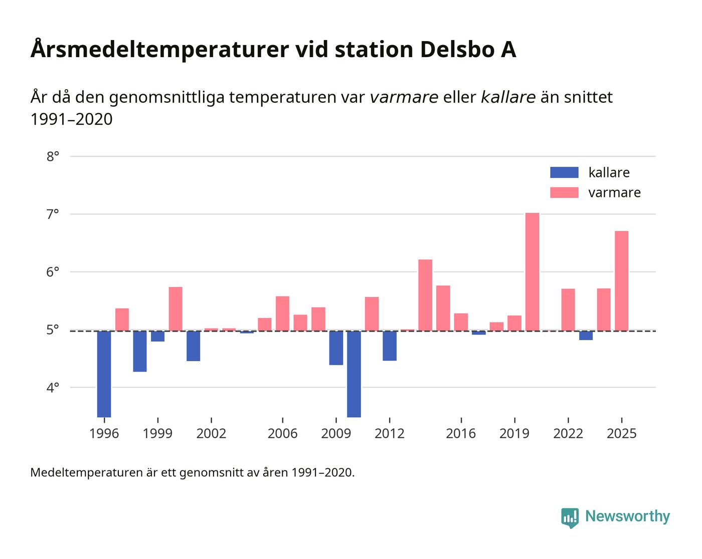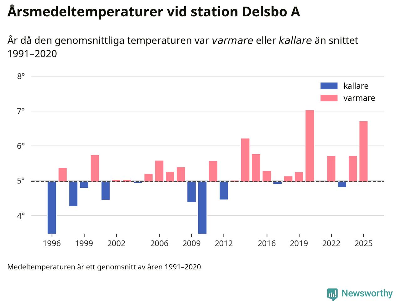 Årsmedeltemperaturen vid Delsbo A 2,5 mil öster om centrala Ljusdal var under 2025 6,7 grader, 1,7 grader högre än genomsnittet de senaste decennierna. Det är den näst högsta noteringen sedan 1996, visar Newsworthys beräkningar baserade på delvis preliminär observationsdata från SMHI.