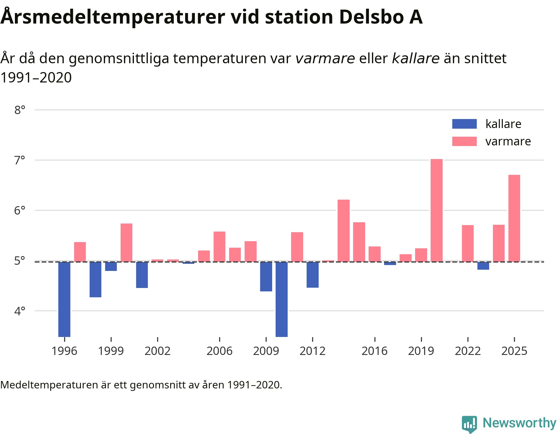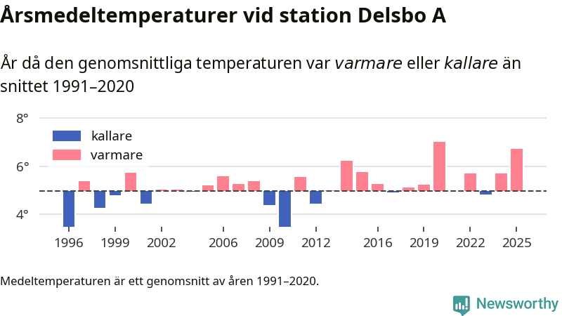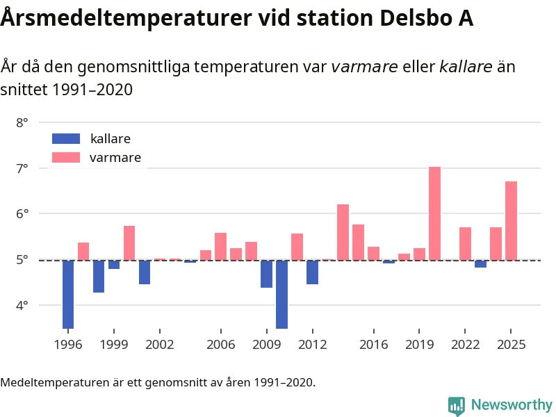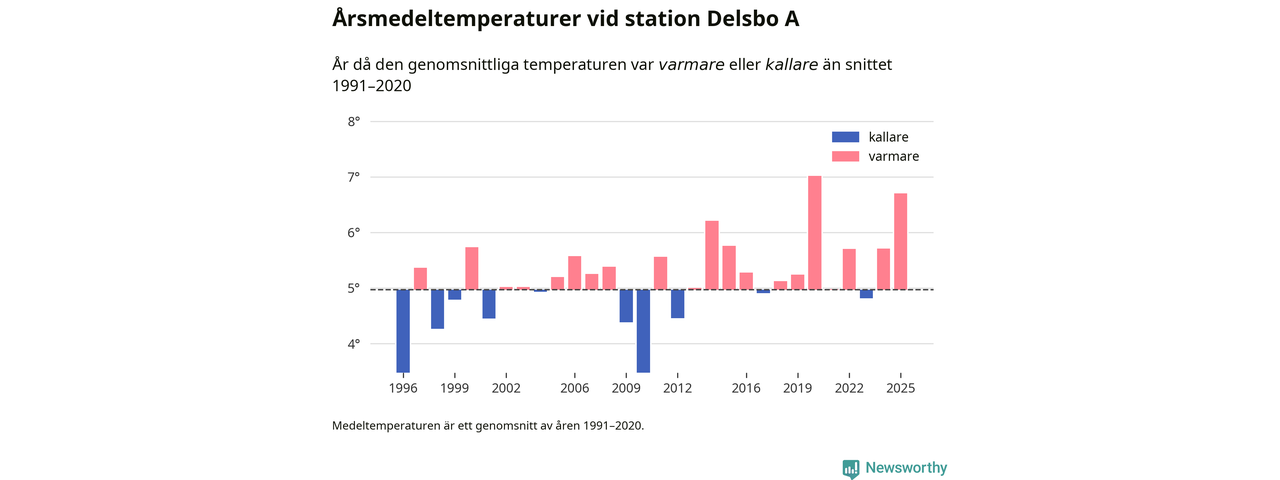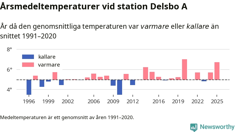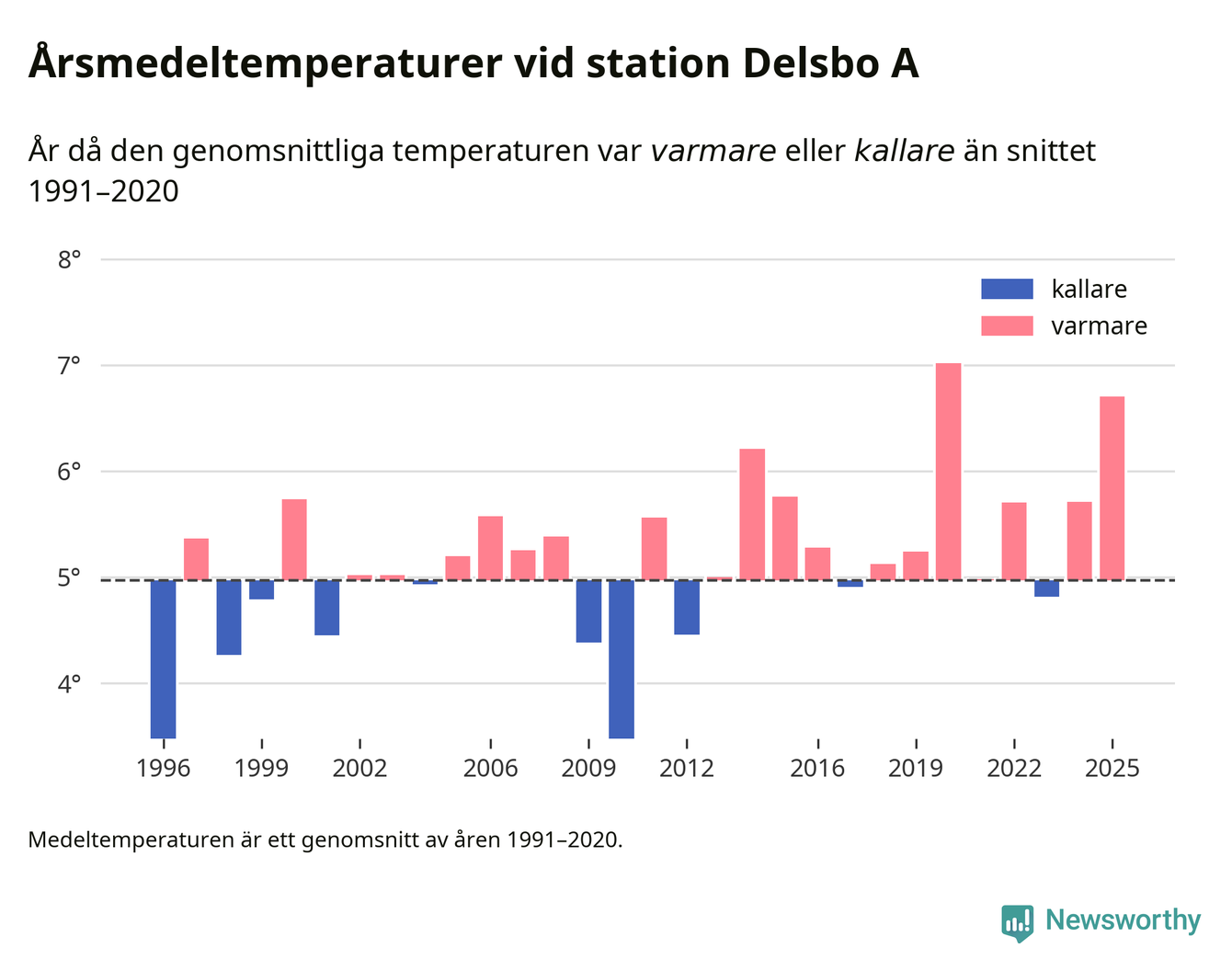 Årsmedeltemperaturen vid Delsbo A 2,5 mil öster om centrala Ljusdal var under 2025 6,7 grader, 1,7 grader högre än genomsnittet de senaste decennierna. Det är den näst högsta noteringen sedan 1996, visar Newsworthys beräkningar baserade på delvis preliminär observationsdata från SMHI.