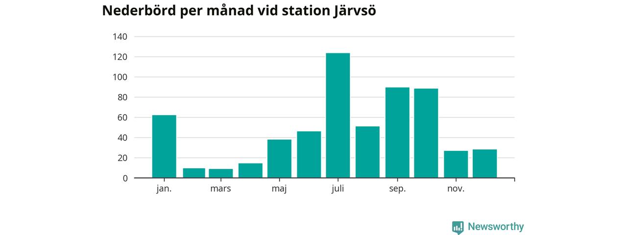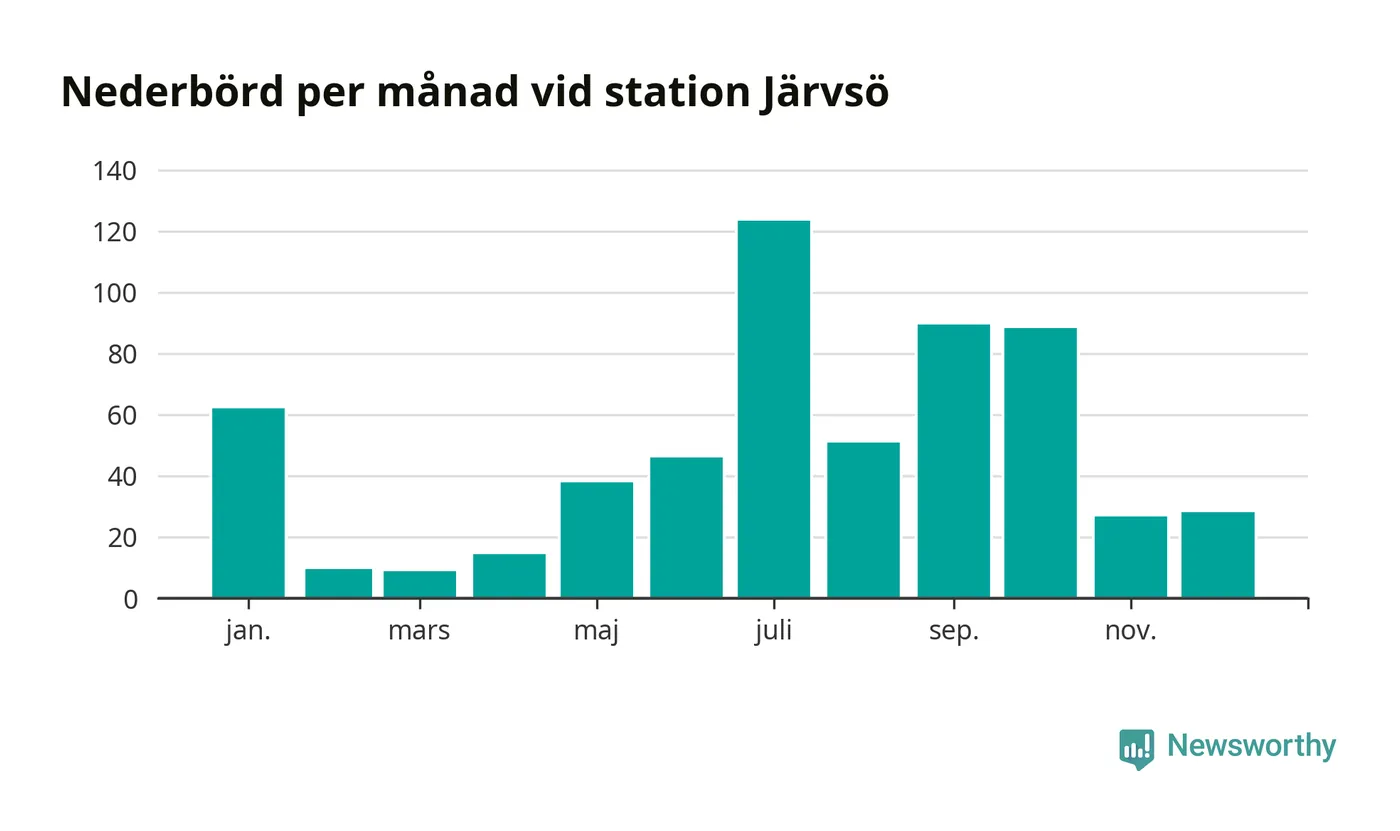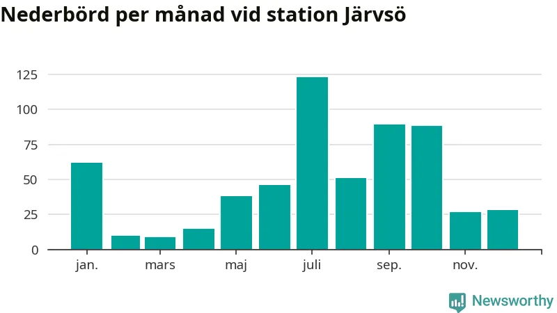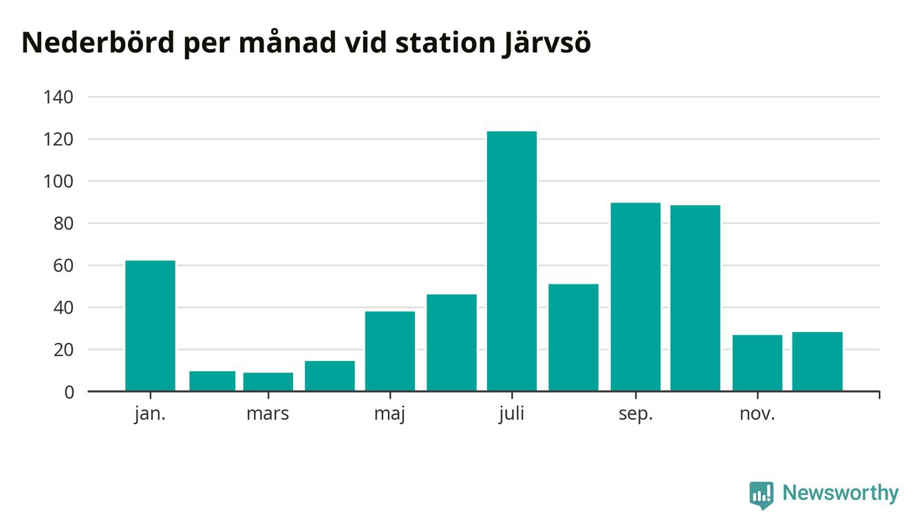 Nederbördsmässigt var 2025 ett ganska normalt år, åtminstone vid Järvsö, 15 kilometer söder om centrala Ljusdal2. Totalt föll 586 millimeter nederbörd vid stationen, att jämföra med de senaste tre decenniernas genomsnitt på 573 millimeter. Månaden med mest nederbörd var juli, med 123 millimeter.