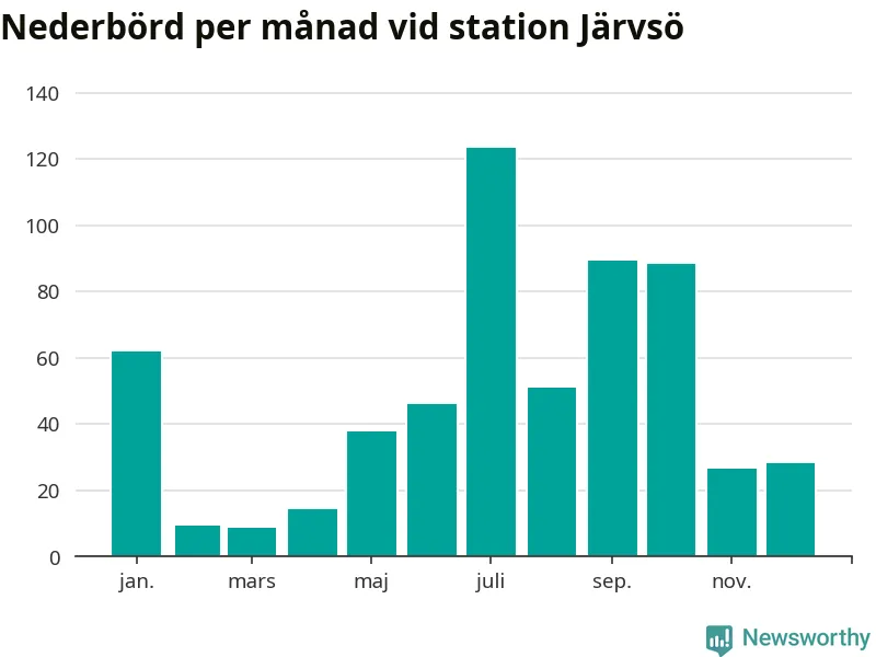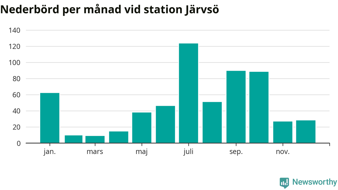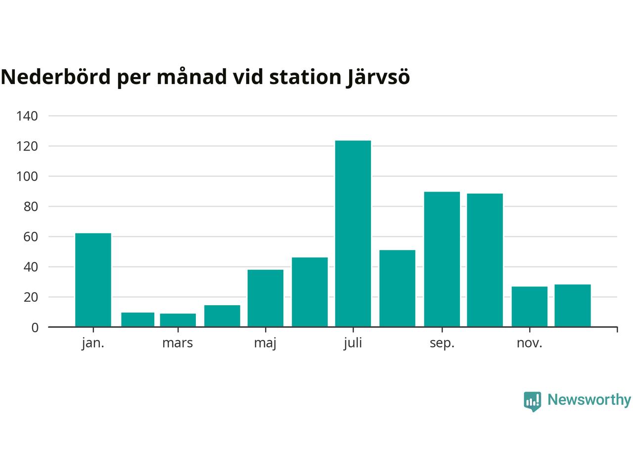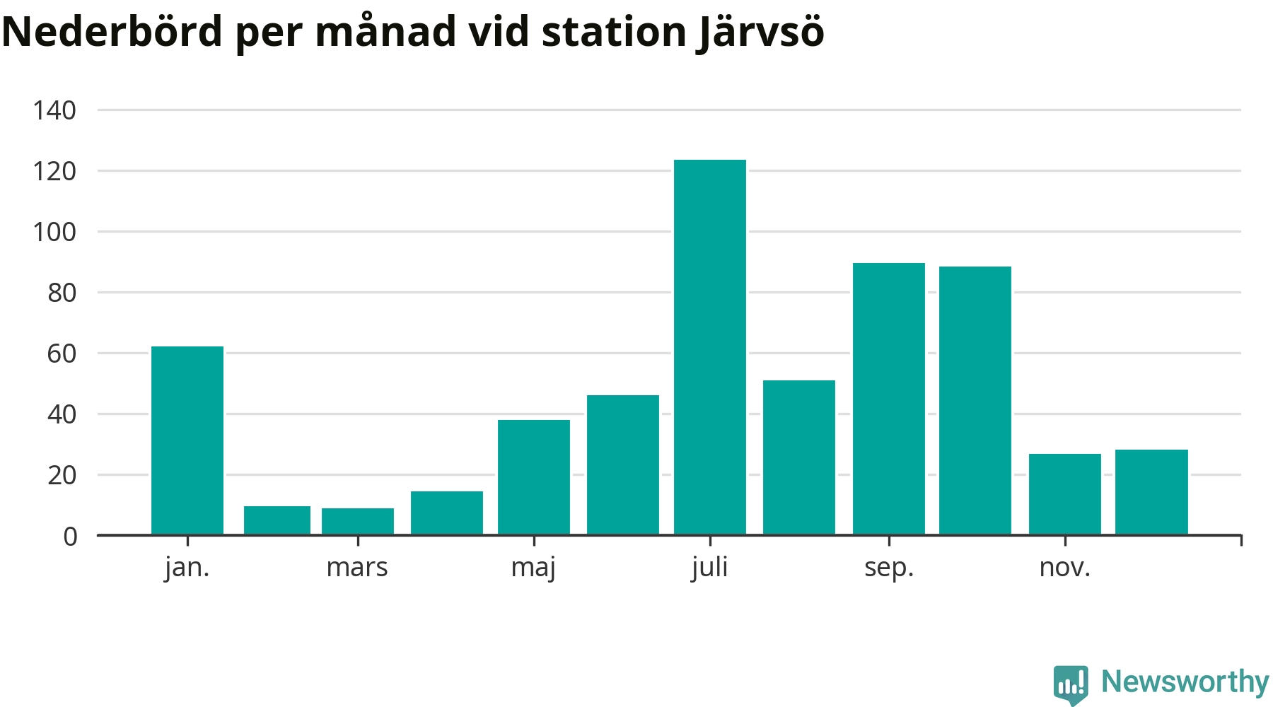 Nederbördsmässigt var 2025 ett ganska normalt år, åtminstone vid Järvsö, 15 kilometer söder om centrala Ljusdal2. Totalt föll 586 millimeter nederbörd vid stationen, att jämföra med de senaste tre decenniernas genomsnitt på 573 millimeter. Månaden med mest nederbörd var juli, med 123 millimeter.