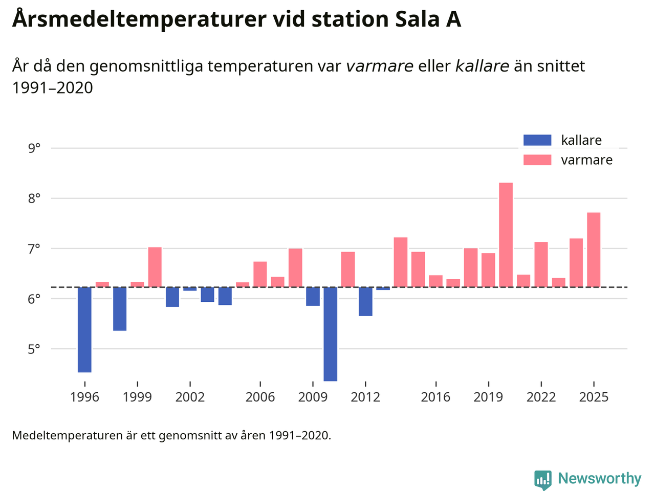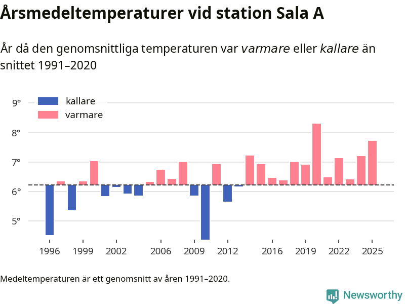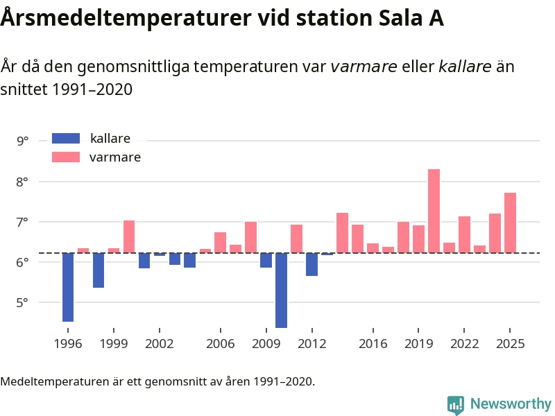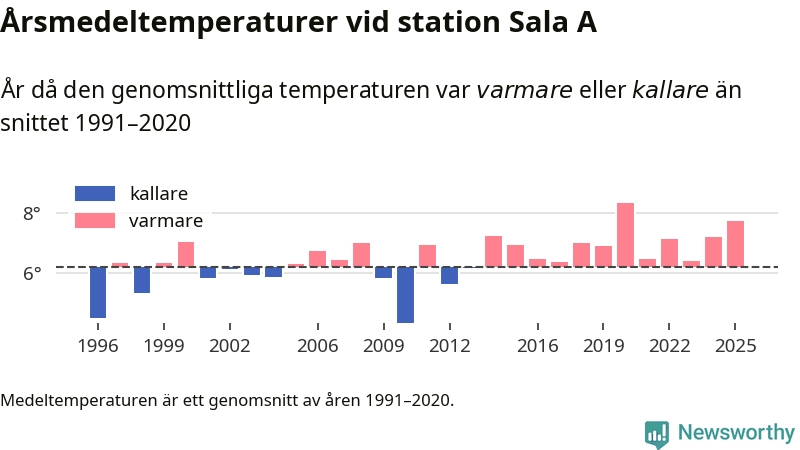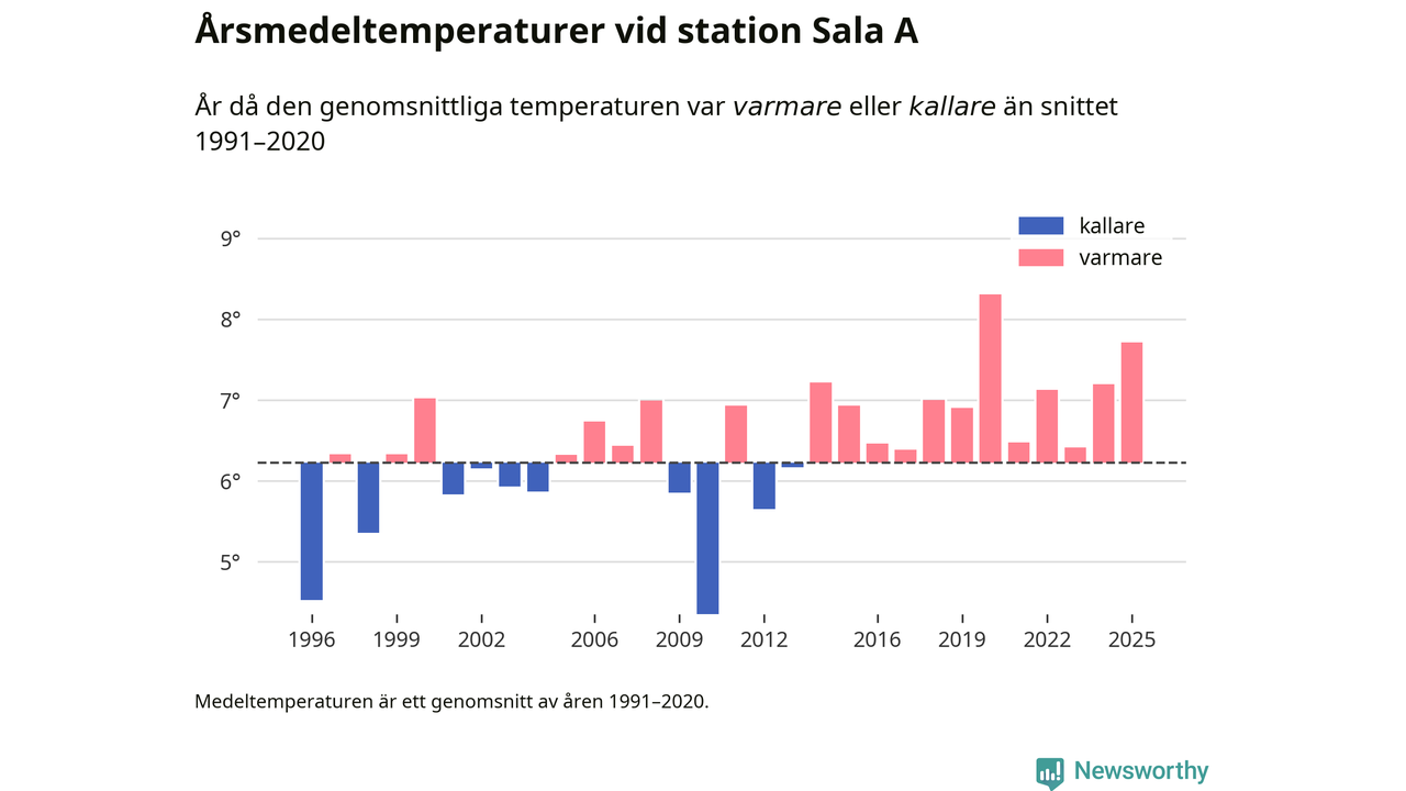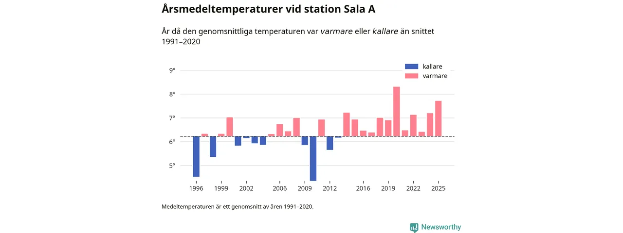 Årsmedeltemperaturen vid Sala A tio kilometer väster om centrala Heby var under 2025 7,7 grader, 1,5 grader högre än genomsnittet de senaste decennierna. Det är den näst högsta noteringen sedan 1996, visar Newsworthys beräkningar baserade på delvis preliminär observationsdata från SMHI.