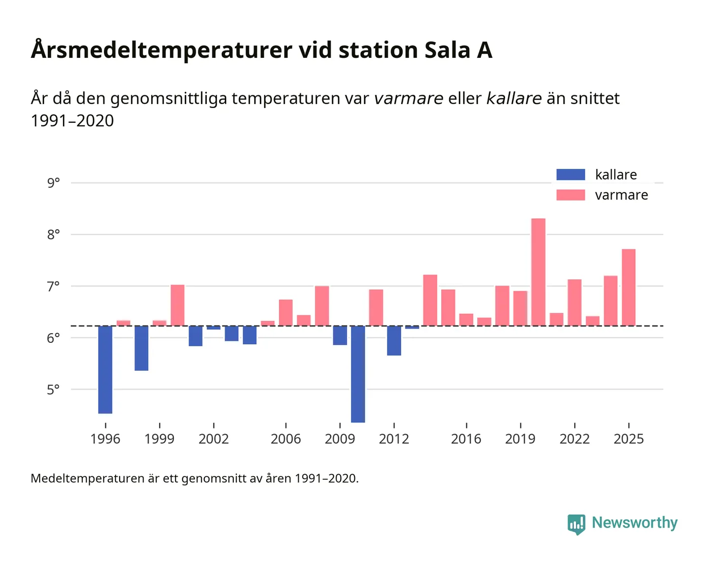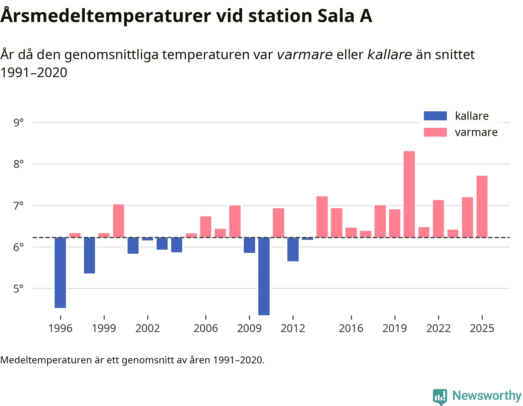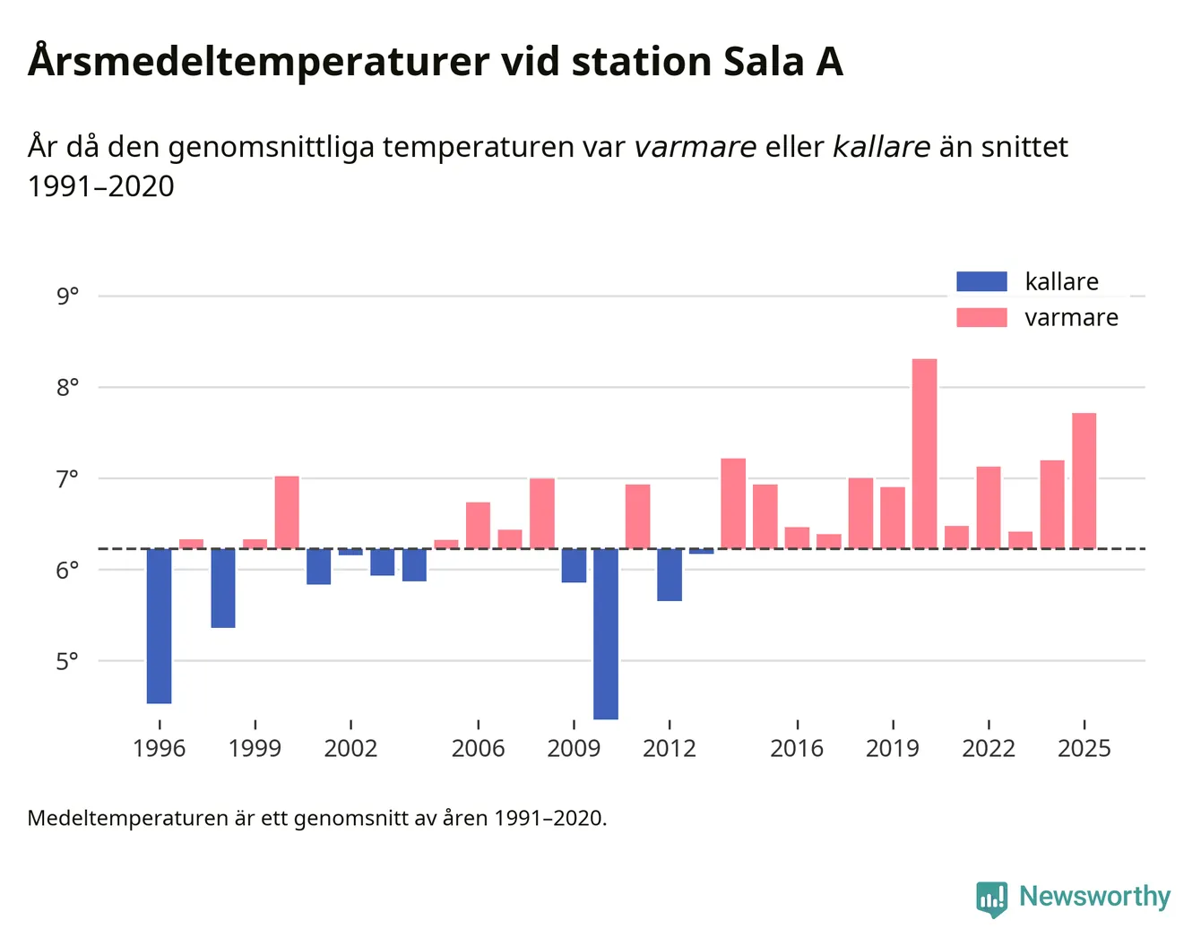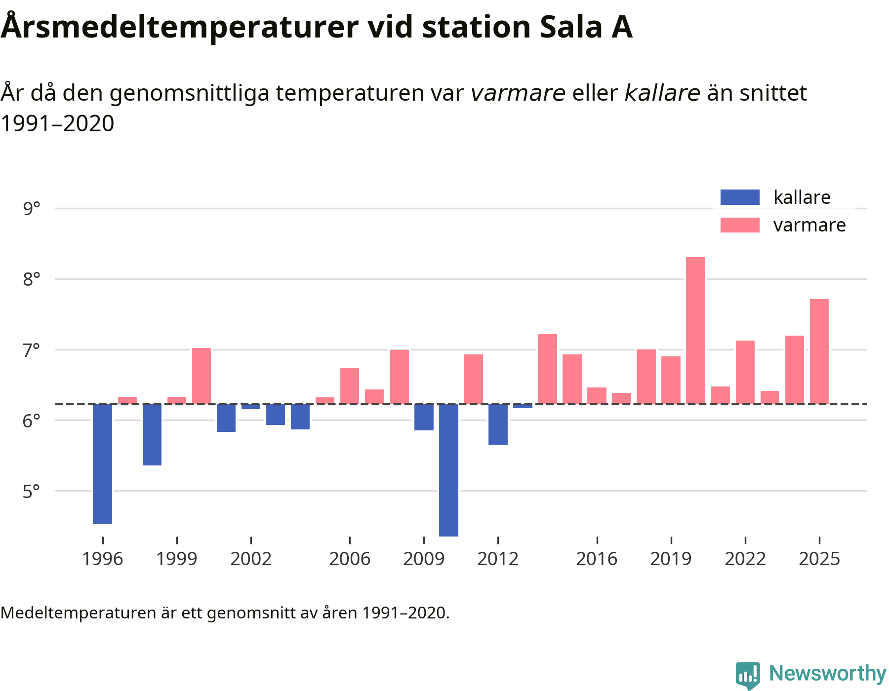 Årsmedeltemperaturen vid Sala A tio kilometer väster om centrala Heby var under 2025 7,7 grader, 1,5 grader högre än genomsnittet de senaste decennierna. Det är den näst högsta noteringen sedan 1996, visar Newsworthys beräkningar baserade på delvis preliminär observationsdata från SMHI.