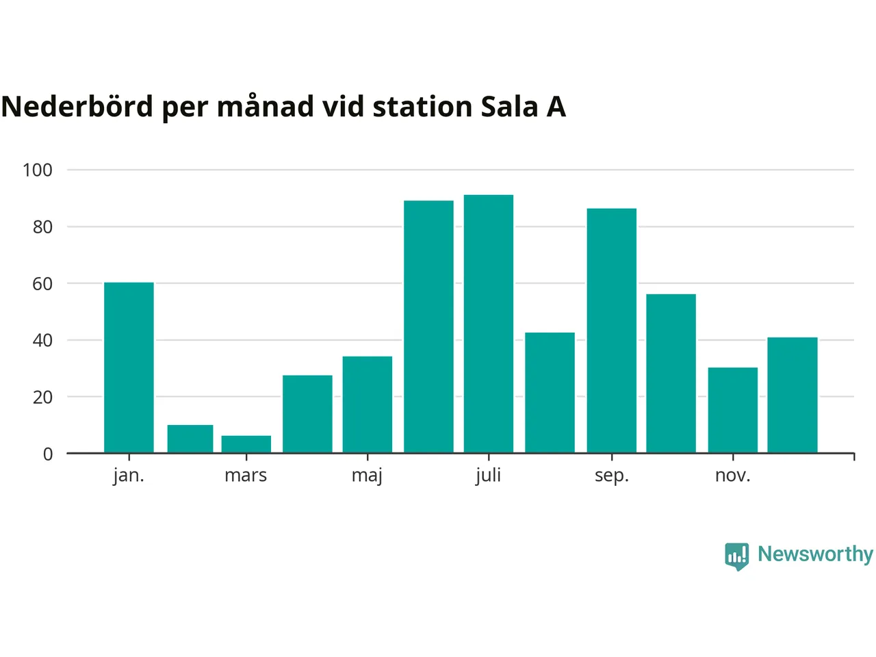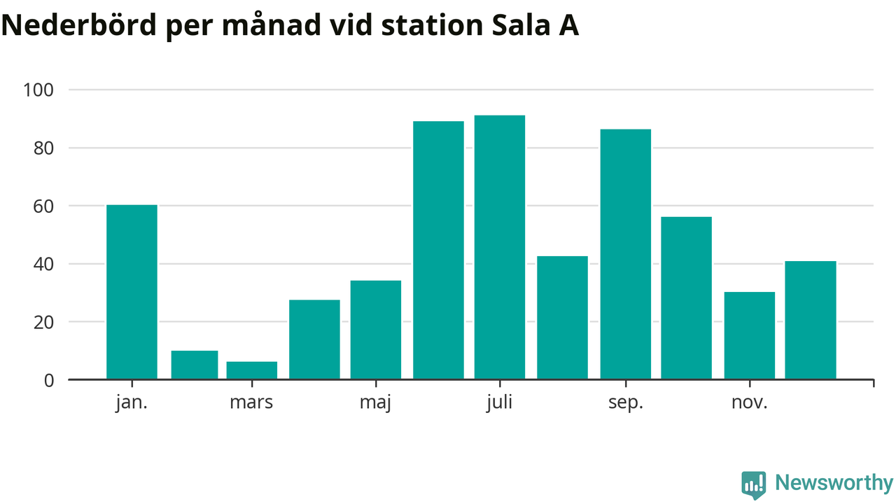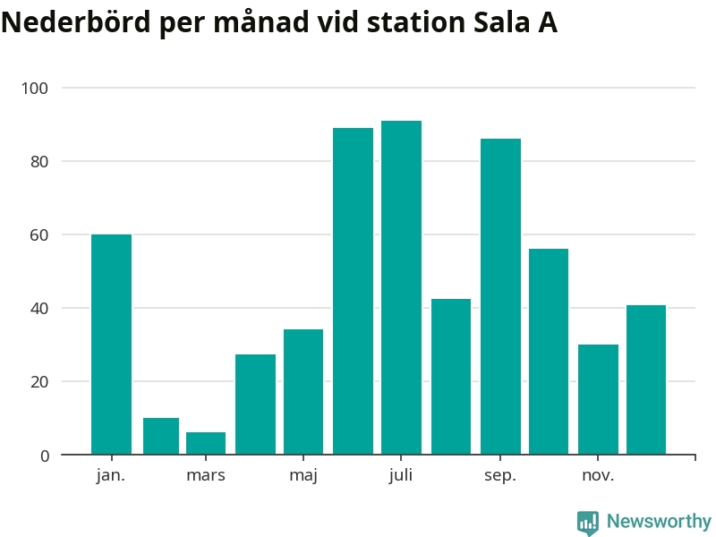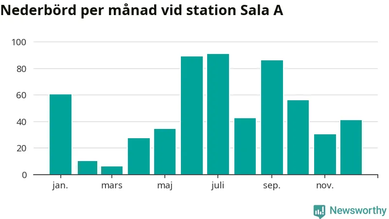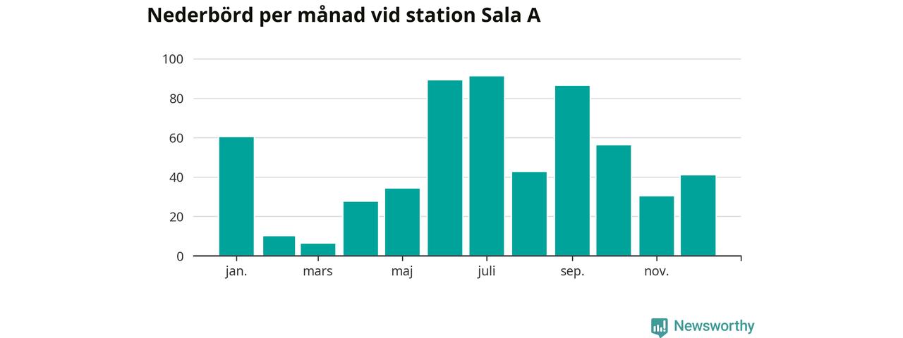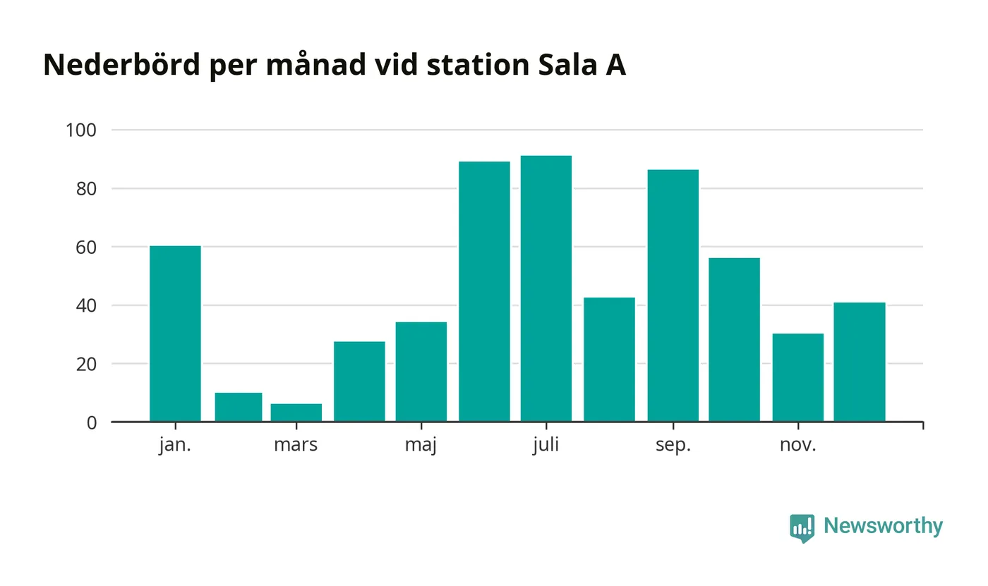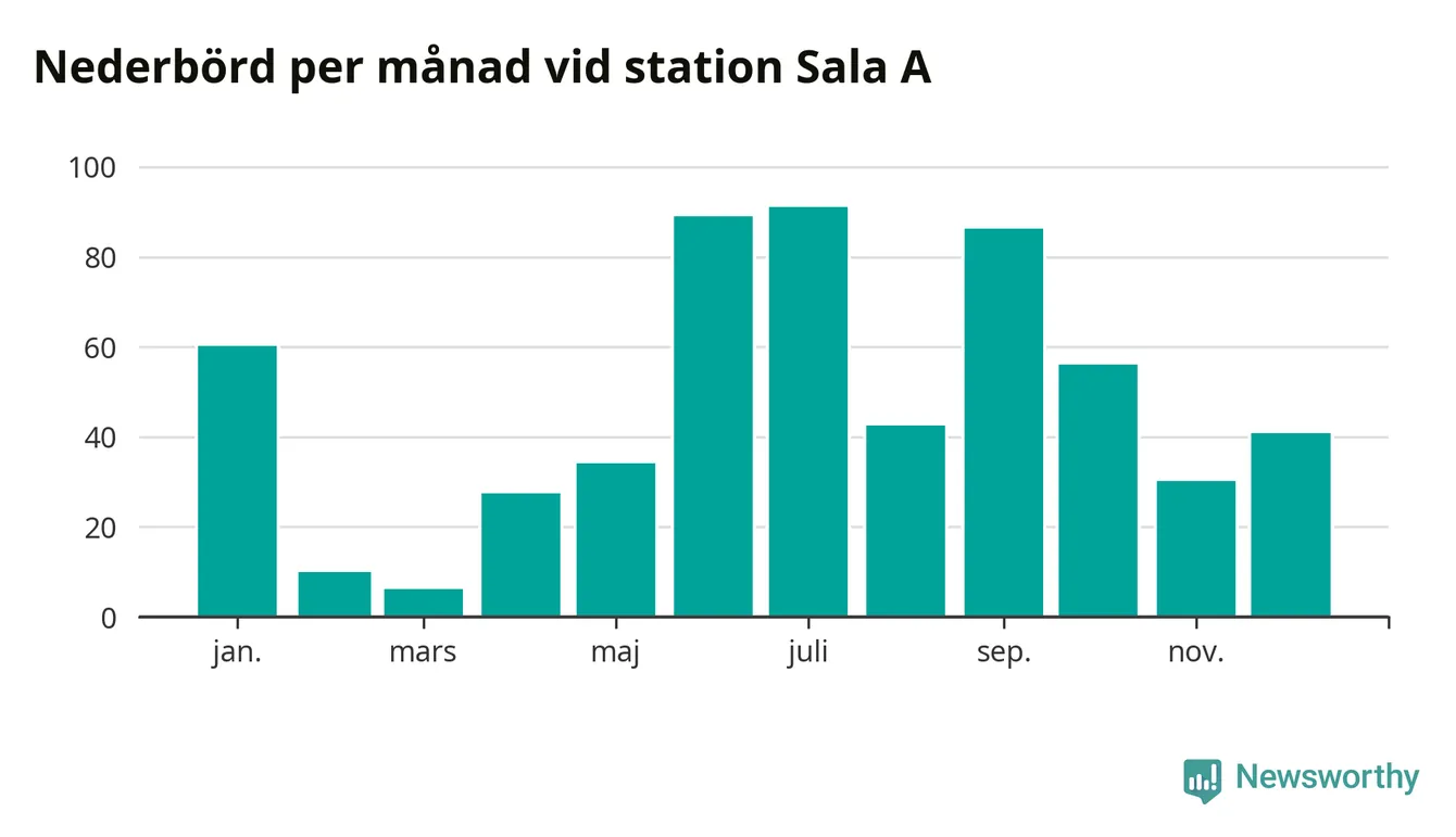 Nederbördsmässigt var 2025 ett ganska normalt år vid Sala A. Totalt föll 574 millimeter nederbörd vid stationen, att jämföra med de senaste tre decenniernas genomsnitt på 549 millimeter. Månaden med mest nederbörd var juli, med 91 millimeter.