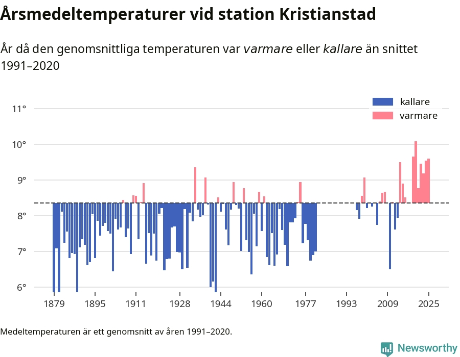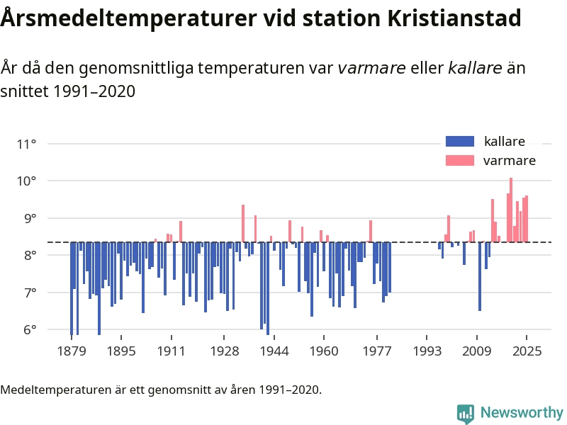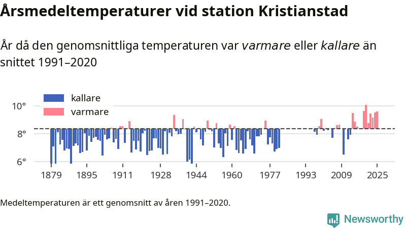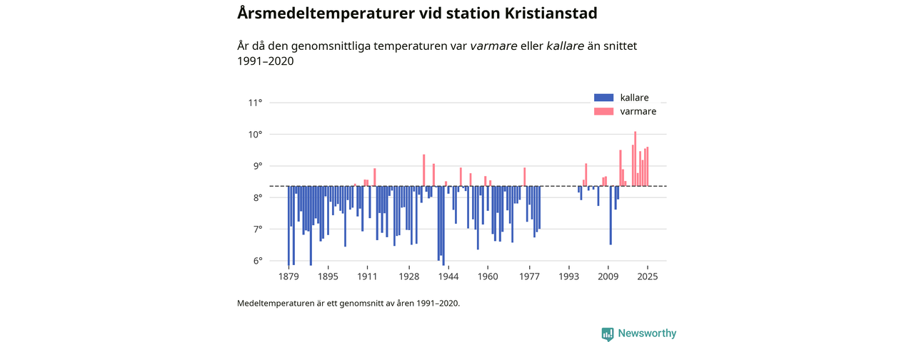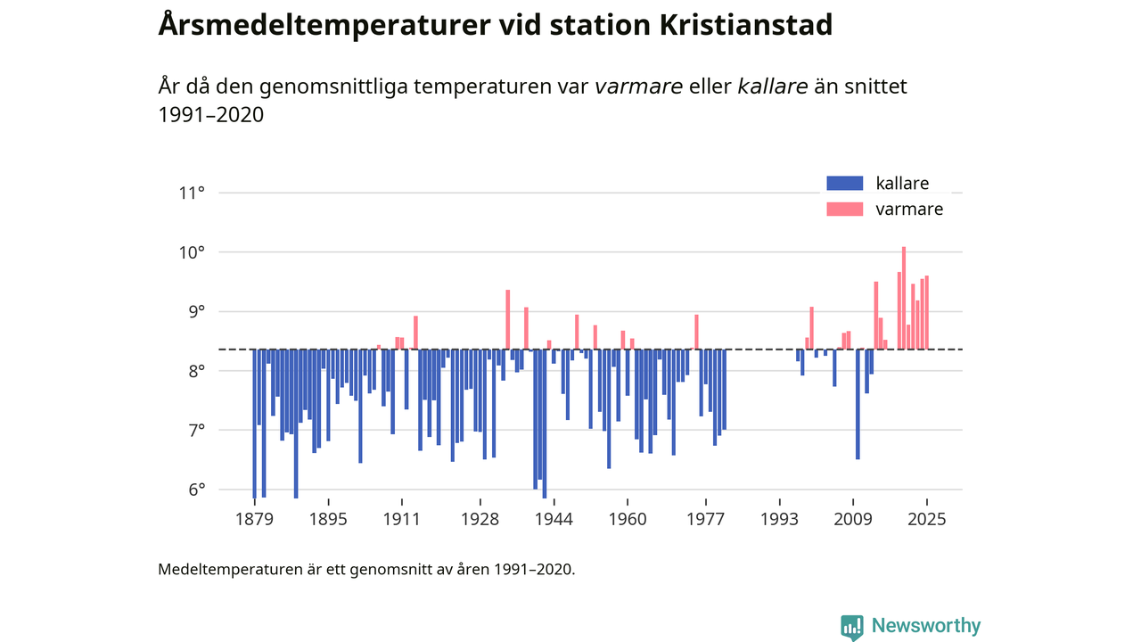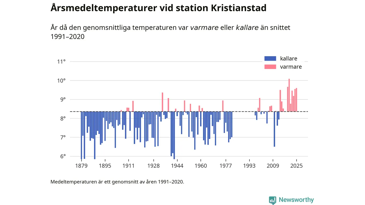 Årsmedeltemperaturen vid Kristianstad utanför centrala Kristianstad1 – den enda aktiva, SMHI-anslutna stationen som mäter medeltemperaturer i Kristianstads kommun – var under 2025 9,6 grader, 1,2 grader högre än genomsnittet de senaste decennierna. Det visar Newsworthys beräkningar, som bygger på delvis preliminär observationsdata från SMHI.