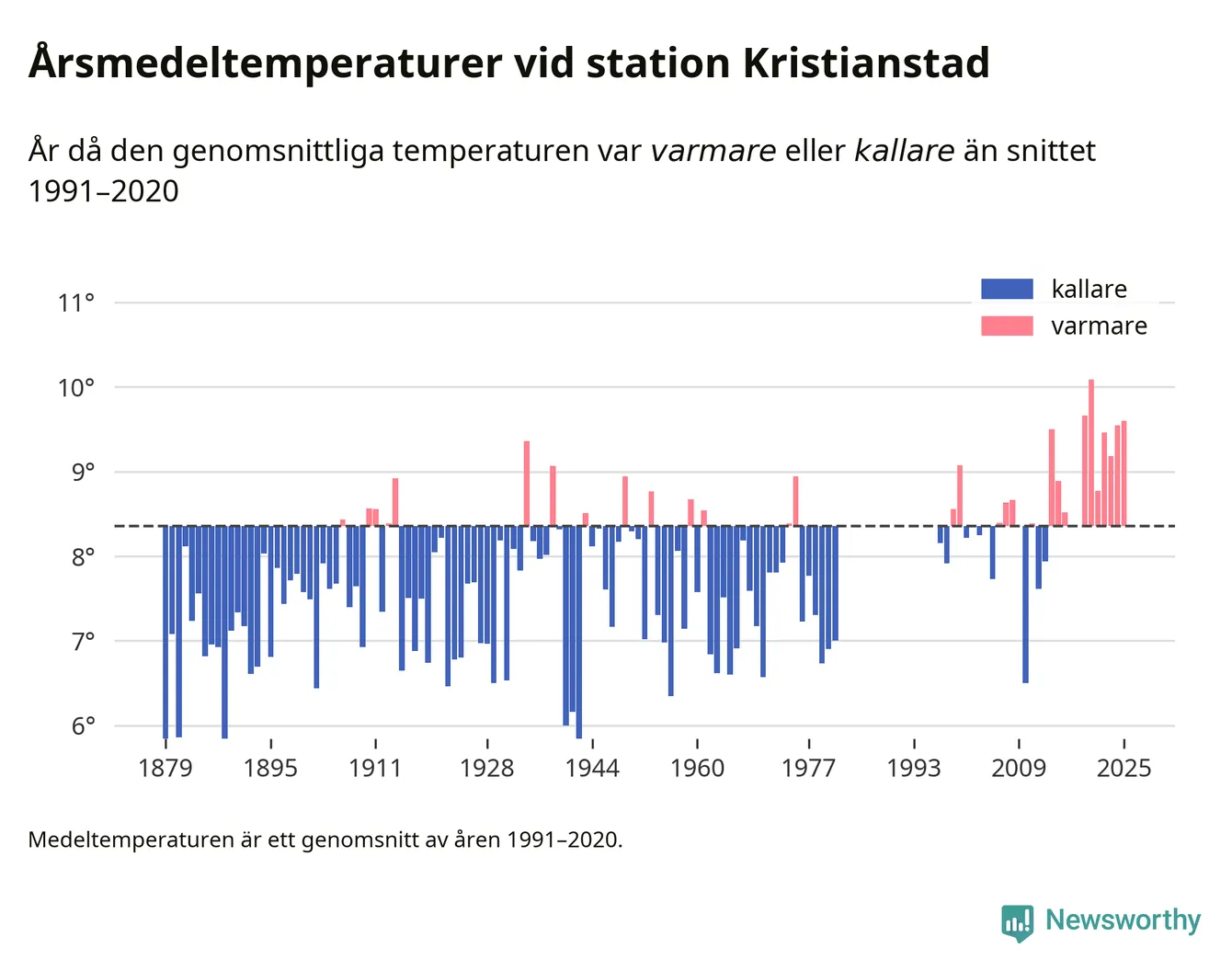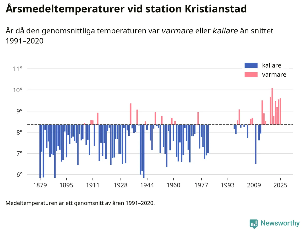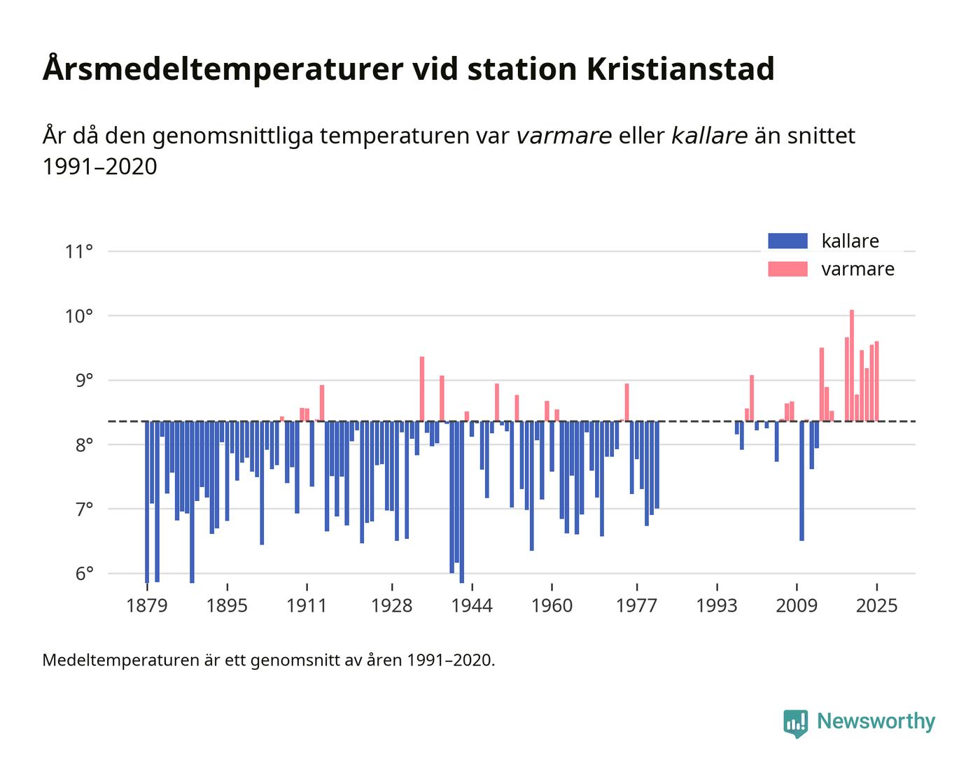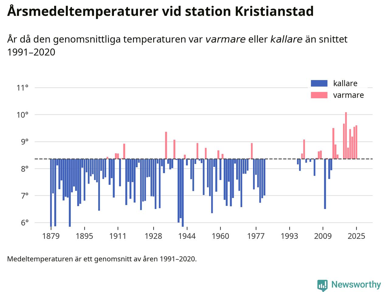 Årsmedeltemperaturen vid Kristianstad utanför centrala Kristianstad1 – den enda aktiva, SMHI-anslutna stationen som mäter medeltemperaturer i Kristianstads kommun – var under 2025 9,6 grader, 1,2 grader högre än genomsnittet de senaste decennierna. Det visar Newsworthys beräkningar, som bygger på delvis preliminär observationsdata från SMHI.