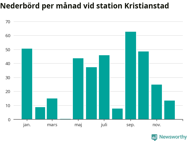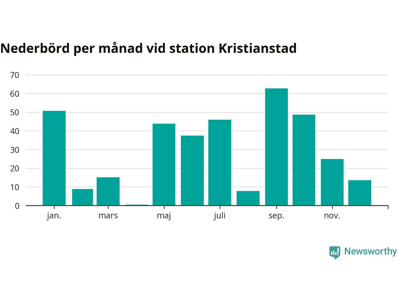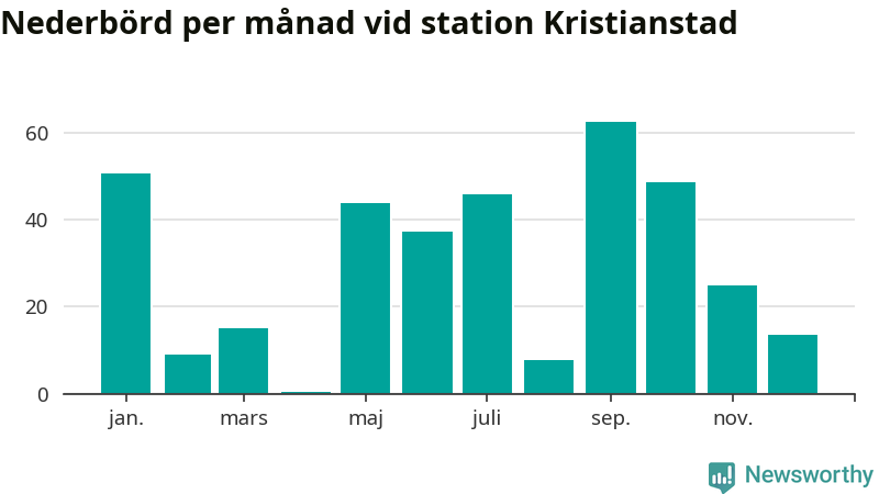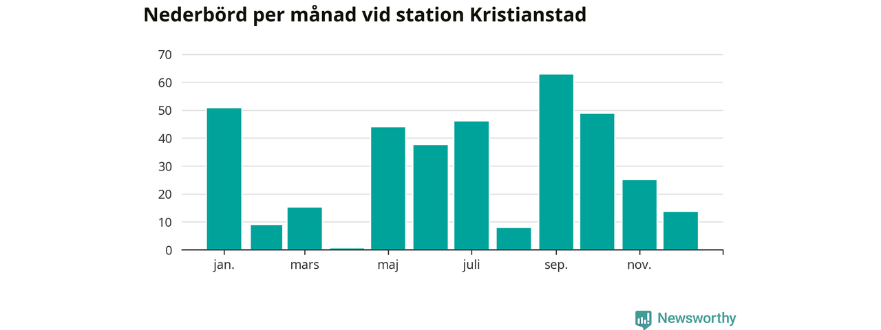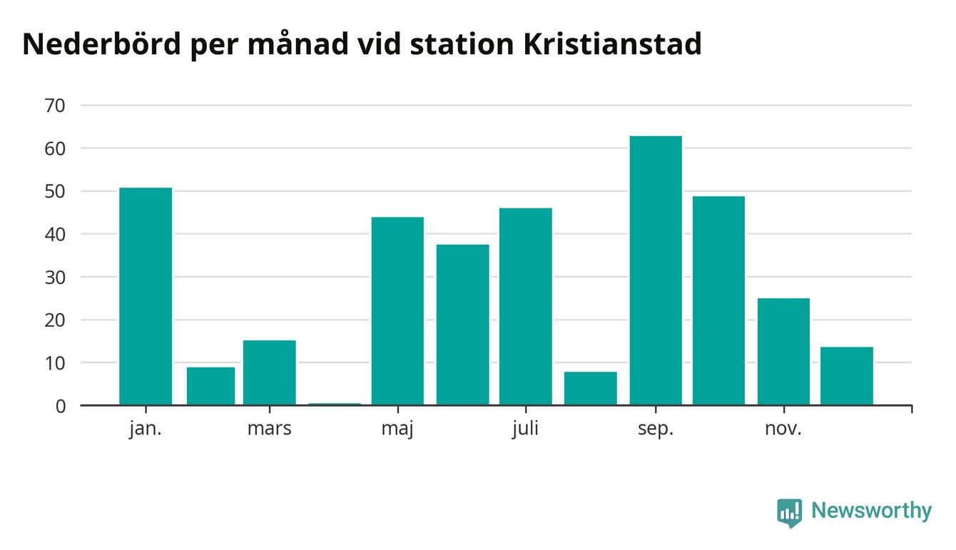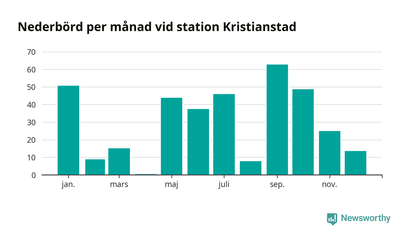 Nederbördsmässigt var 2025 ett torrare år än vanligt vid Kristianstad. Totalt föll 360 millimeter nederbörd vid stationen, att jämföra med de senaste tre decenniernas genomsnitt på 611 millimeter. Månaden med mest nederbörd var september, med 63 millimeter.