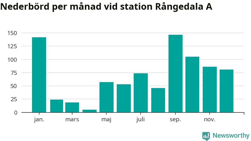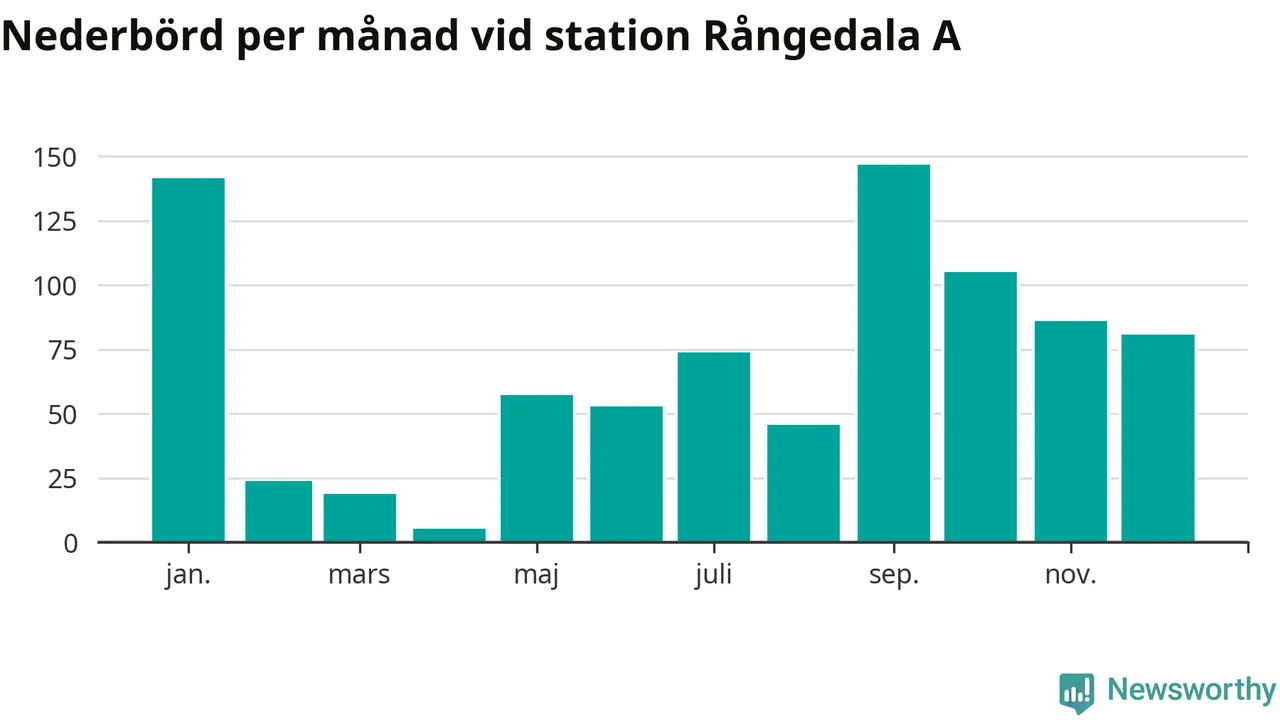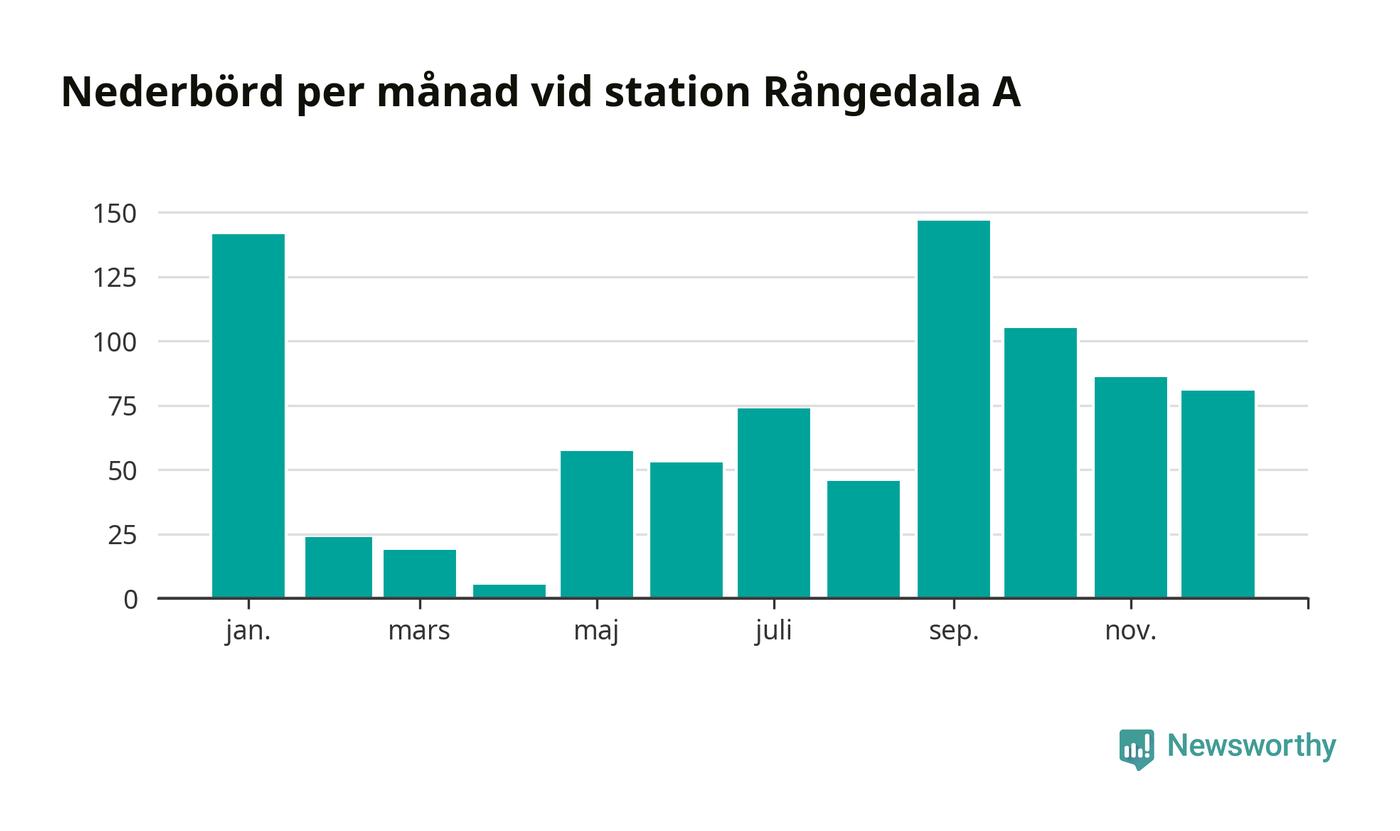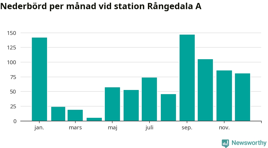 Nederbördsmässigt var 2025 ett torrare år än vanligt , åtminstone vid Rångedala A, 15 kilometer väster om centrala Ulricehamn. Totalt föll 837 millimeter nederbörd vid stationen, att jämföra med de senaste tre decenniernas genomsnitt på 968 millimeter. Månaden med mest nederbörd var september, med 147 millimeter.