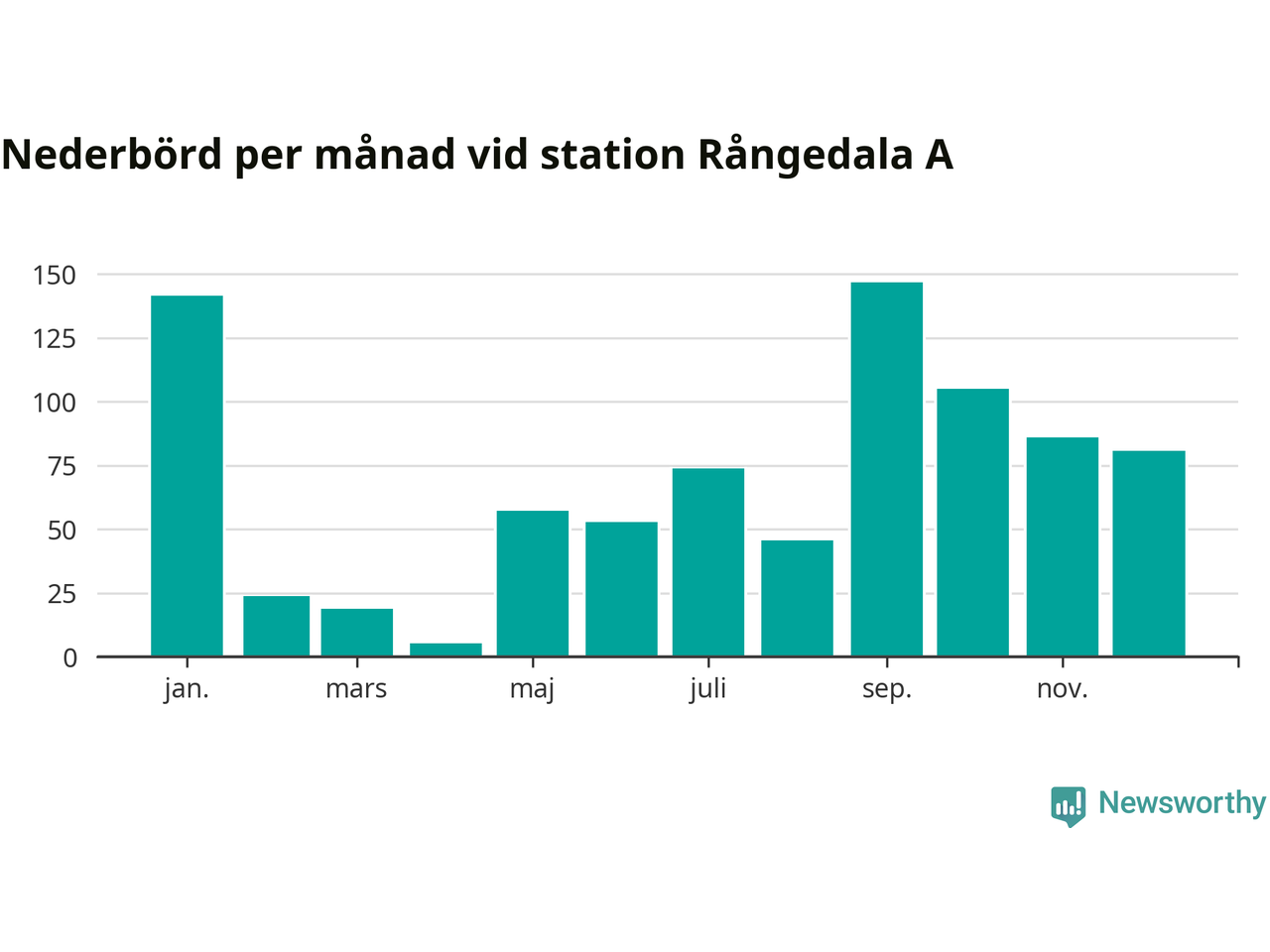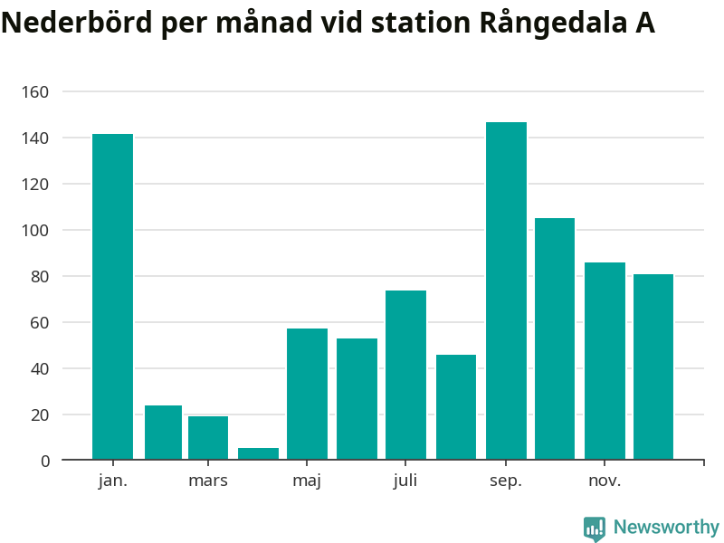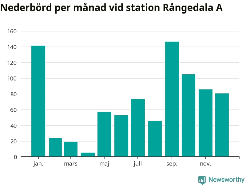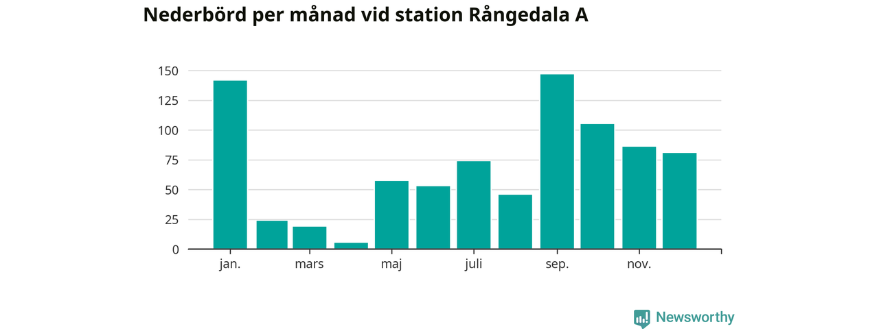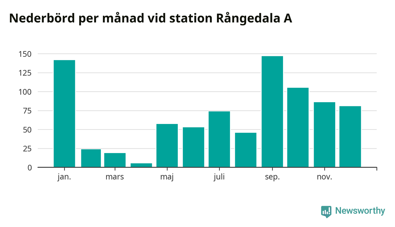 Nederbördsmässigt var 2025 ett torrare år än vanligt , åtminstone vid Rångedala A, 15 kilometer väster om centrala Ulricehamn. Totalt föll 837 millimeter nederbörd vid stationen, att jämföra med de senaste tre decenniernas genomsnitt på 968 millimeter. Månaden med mest nederbörd var september, med 147 millimeter.