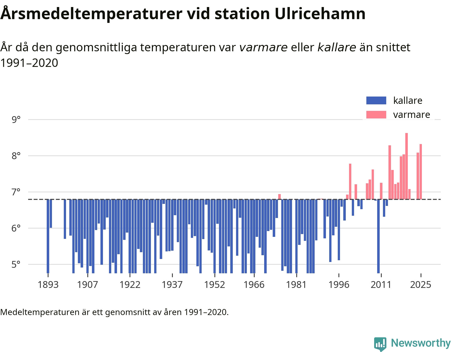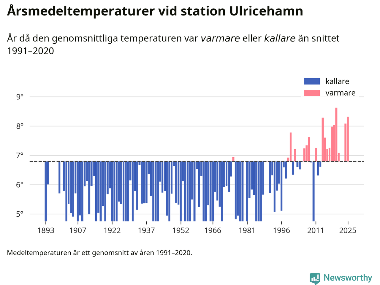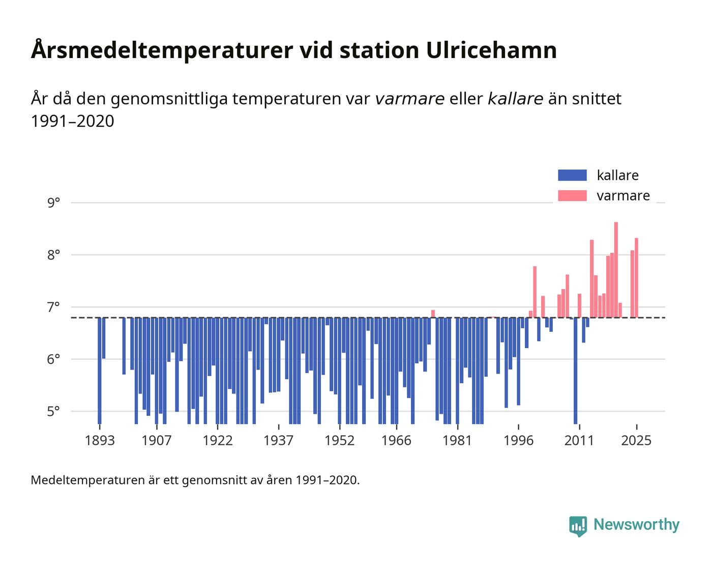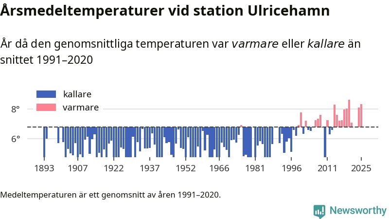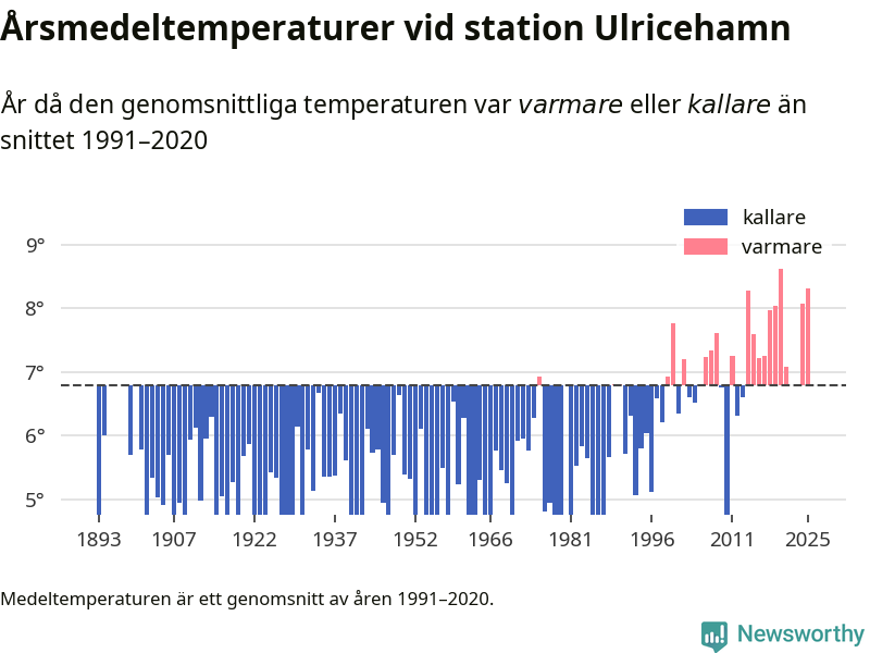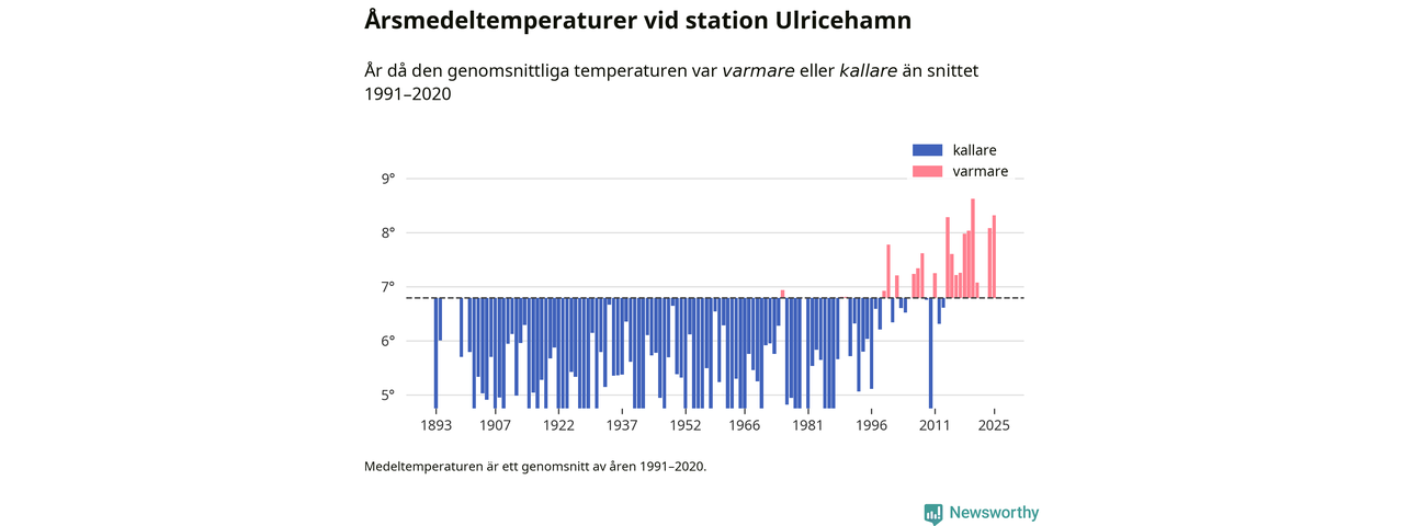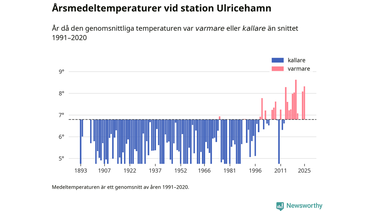 Årsmedeltemperaturen vid Ulricehamn i centrala Ulricehamn1 – den enda aktiva, SMHI-anslutna stationen som mäter medeltemperaturer i Ulricehamns kommun – var under 2025 8,3 grader, 1,5 grader högre än genomsnittet de senaste decennierna. Det visar Newsworthys beräkningar, som bygger på delvis preliminär observationsdata från SMHI.