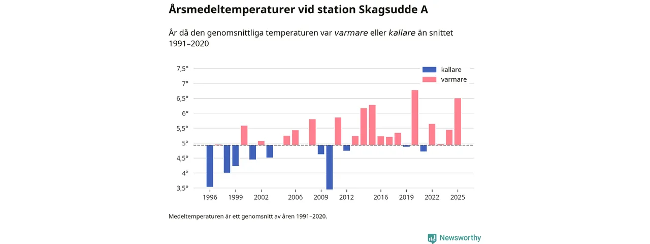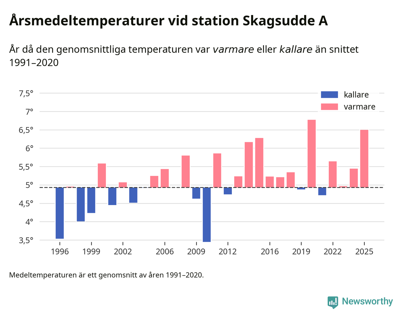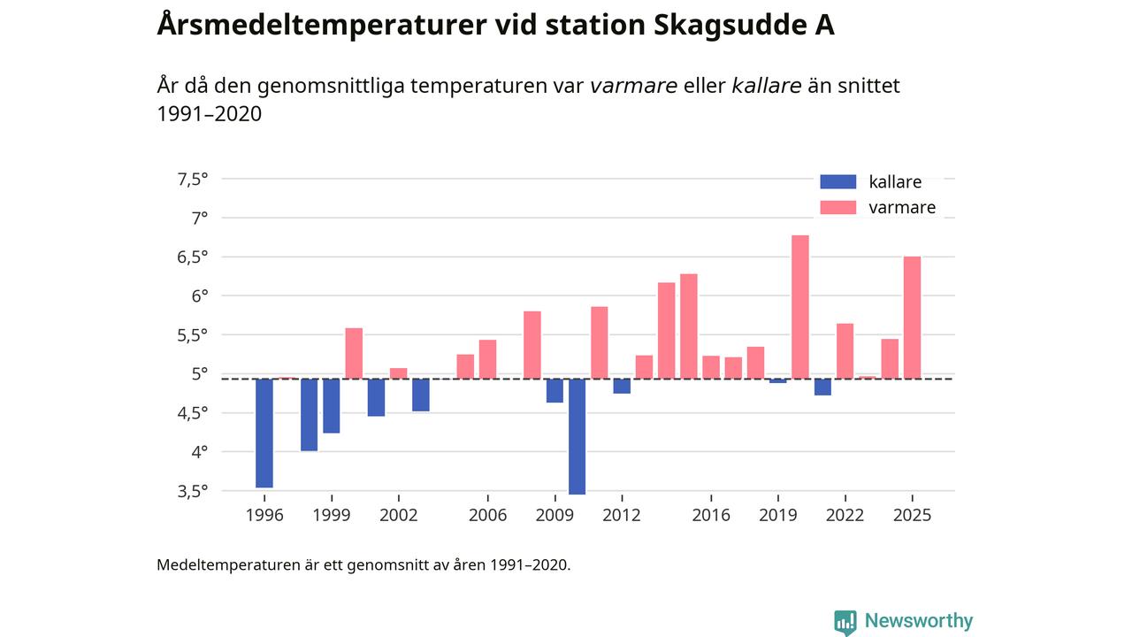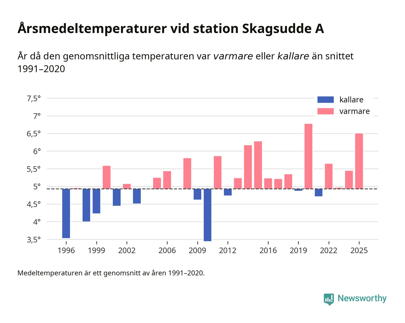 Årsmedeltemperaturen vid Skagsudde A 19 kilometer sydöst om centrala Örnsköldsvik var under 2025 6,5 grader, 1,6 grader högre än genomsnittet de senaste decennierna. Det är den näst högsta noteringen sedan 1996, visar Newsworthys beräkningar baserade på delvis preliminär observationsdata från SMHI.