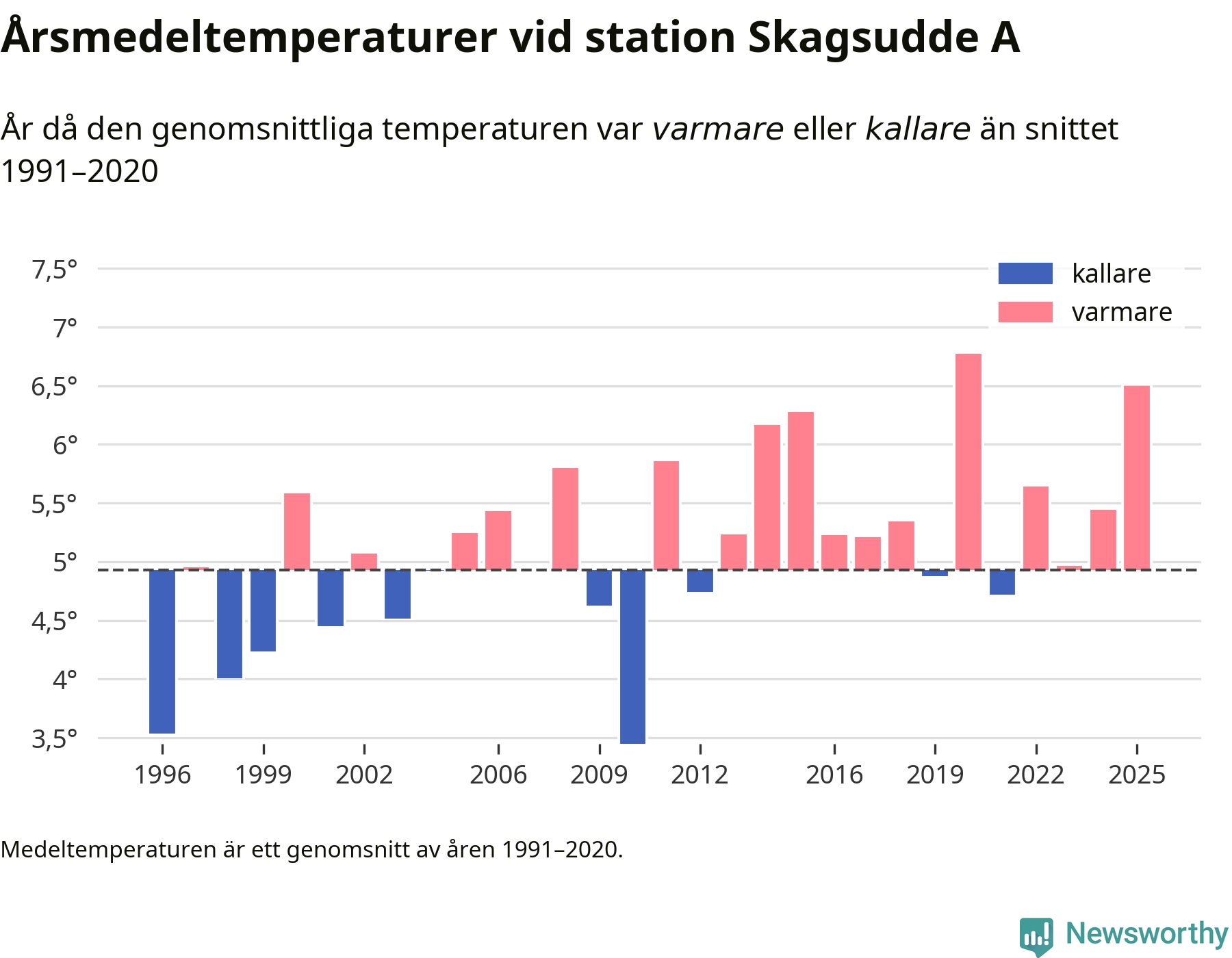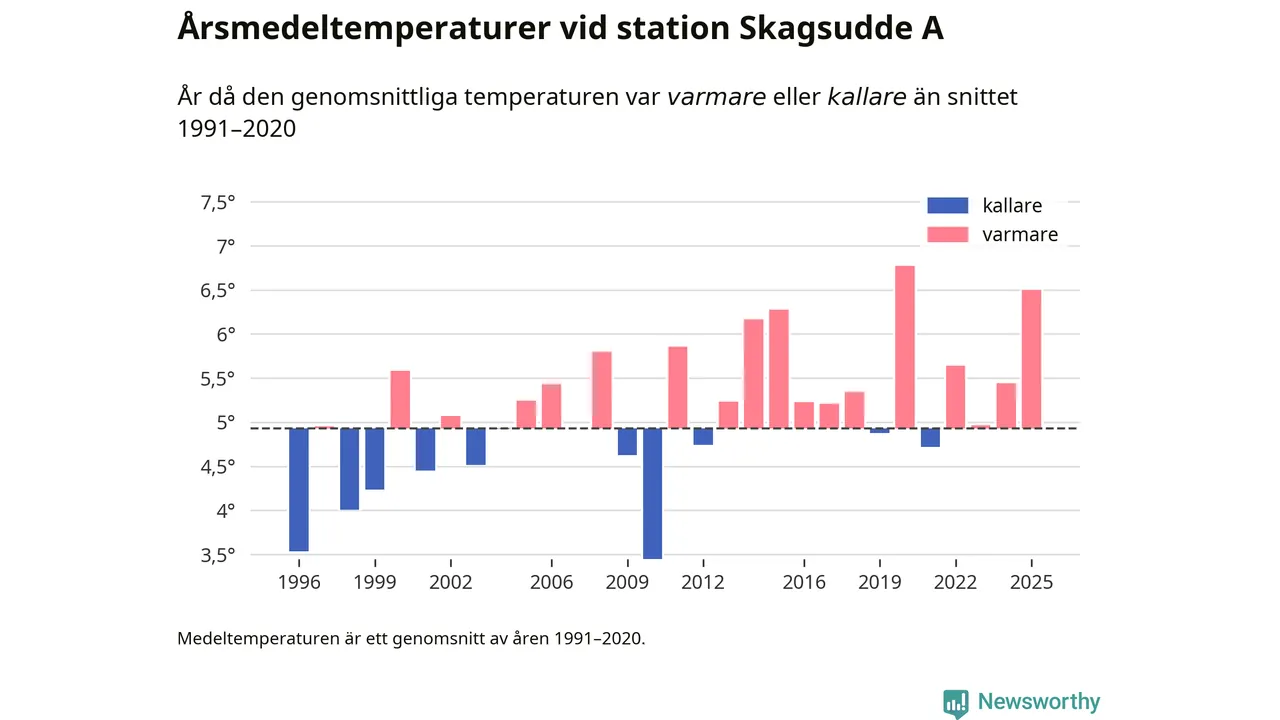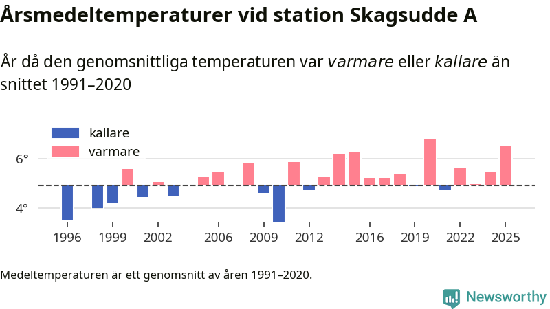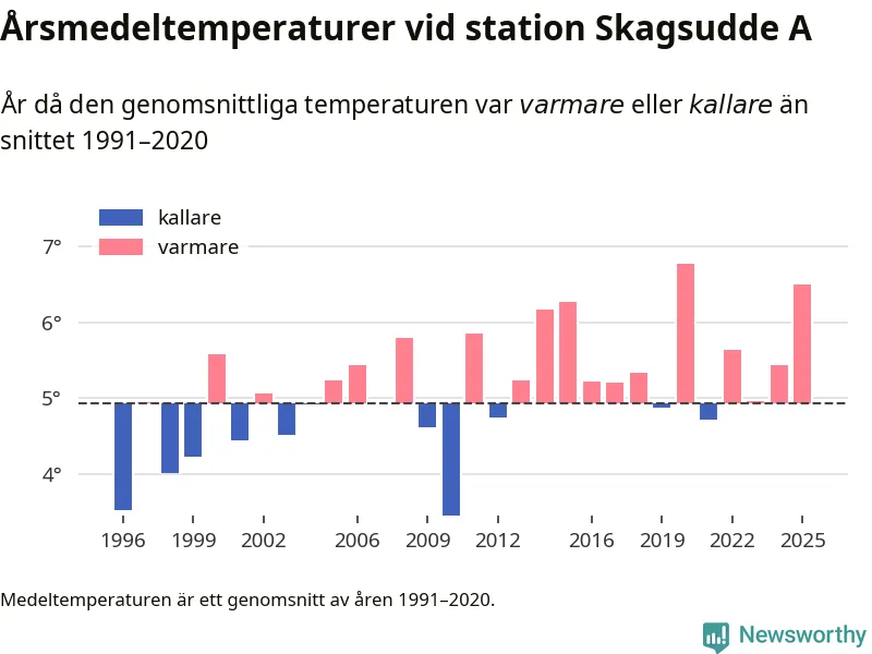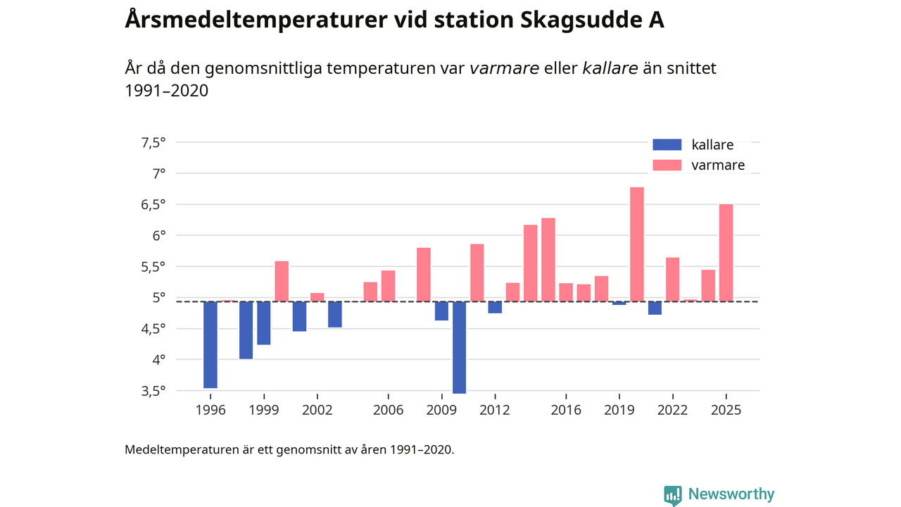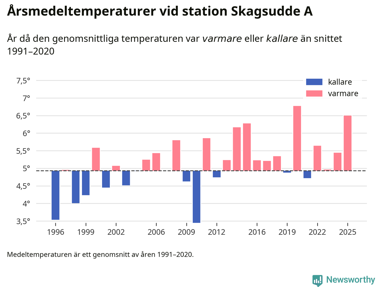 Årsmedeltemperaturen vid Skagsudde A 19 kilometer sydöst om centrala Örnsköldsvik var under 2025 6,5 grader, 1,6 grader högre än genomsnittet de senaste decennierna. Det är den näst högsta noteringen sedan 1996, visar Newsworthys beräkningar baserade på delvis preliminär observationsdata från SMHI.
