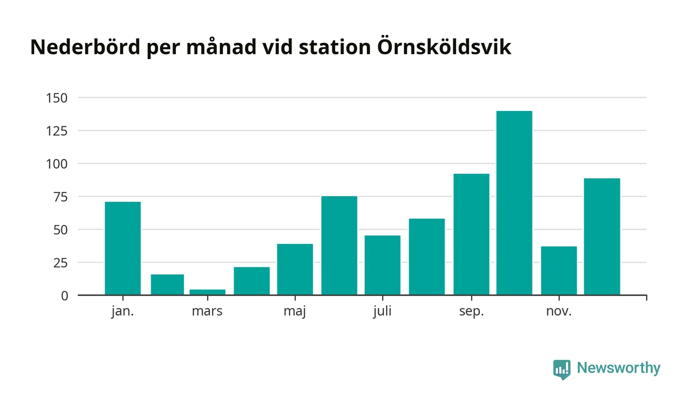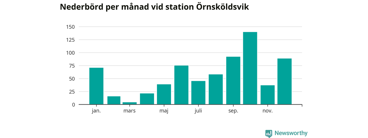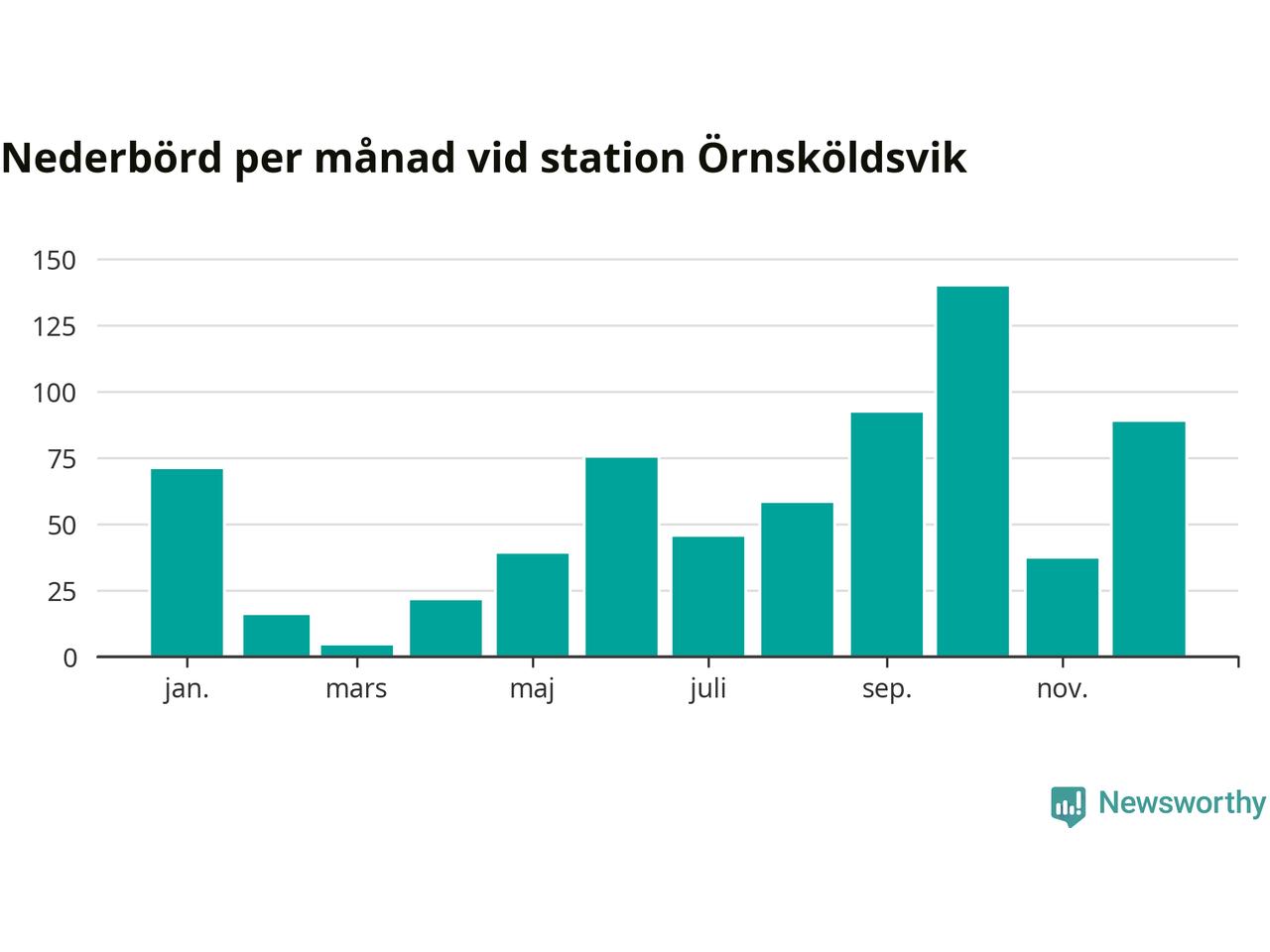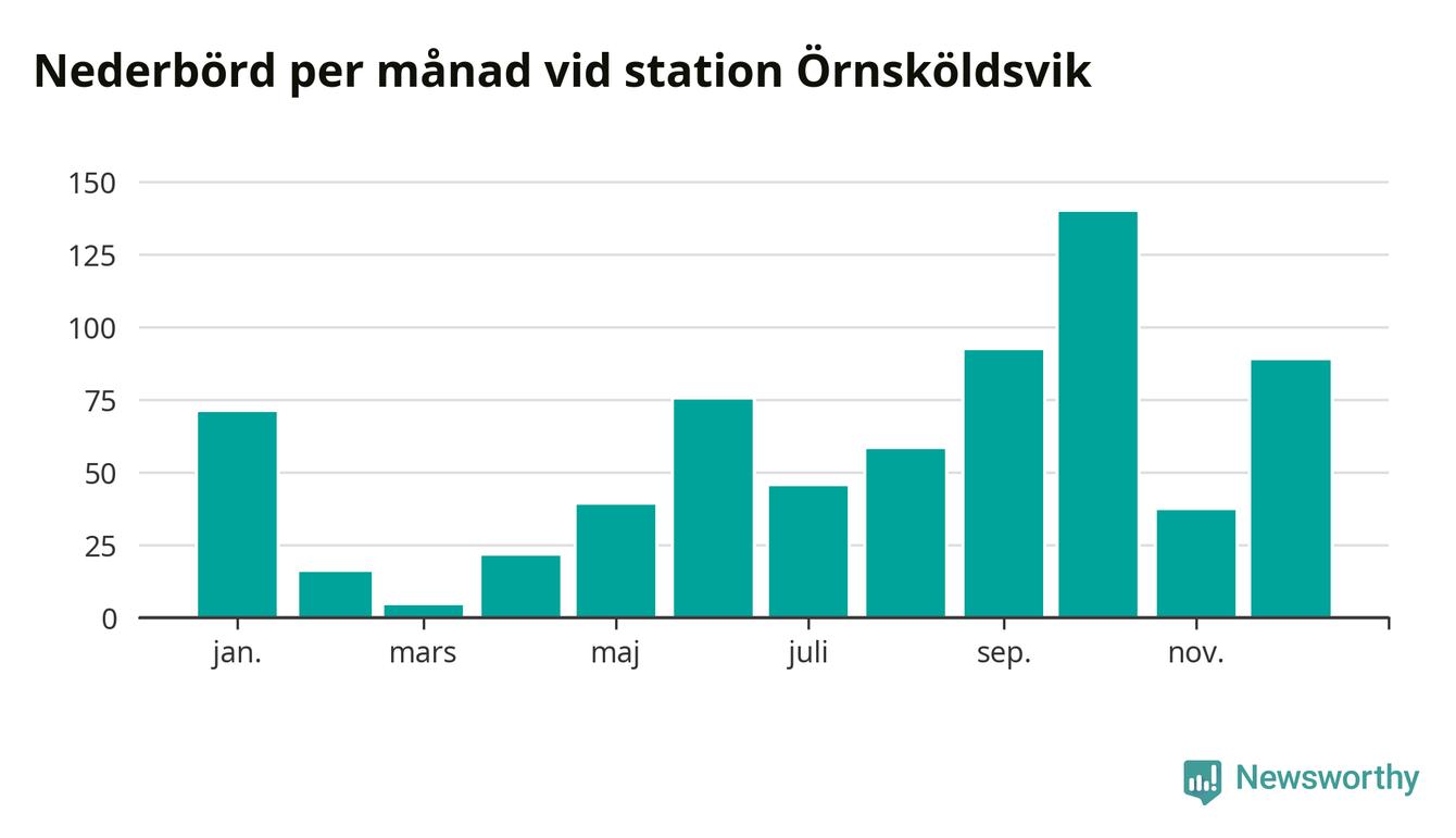 Nederbördsmässigt var 2025 ett ganska normalt år, åtminstone vid Örnsköldsvik, fem kilometer nordöst om centrala Örnsköldsvik2. Totalt föll 686 millimeter nederbörd vid stationen, att jämföra med de senaste tre decenniernas genomsnitt på 655 millimeter. Månaden med mest nederbörd var oktober, med 140 millimeter.