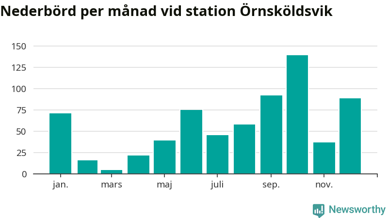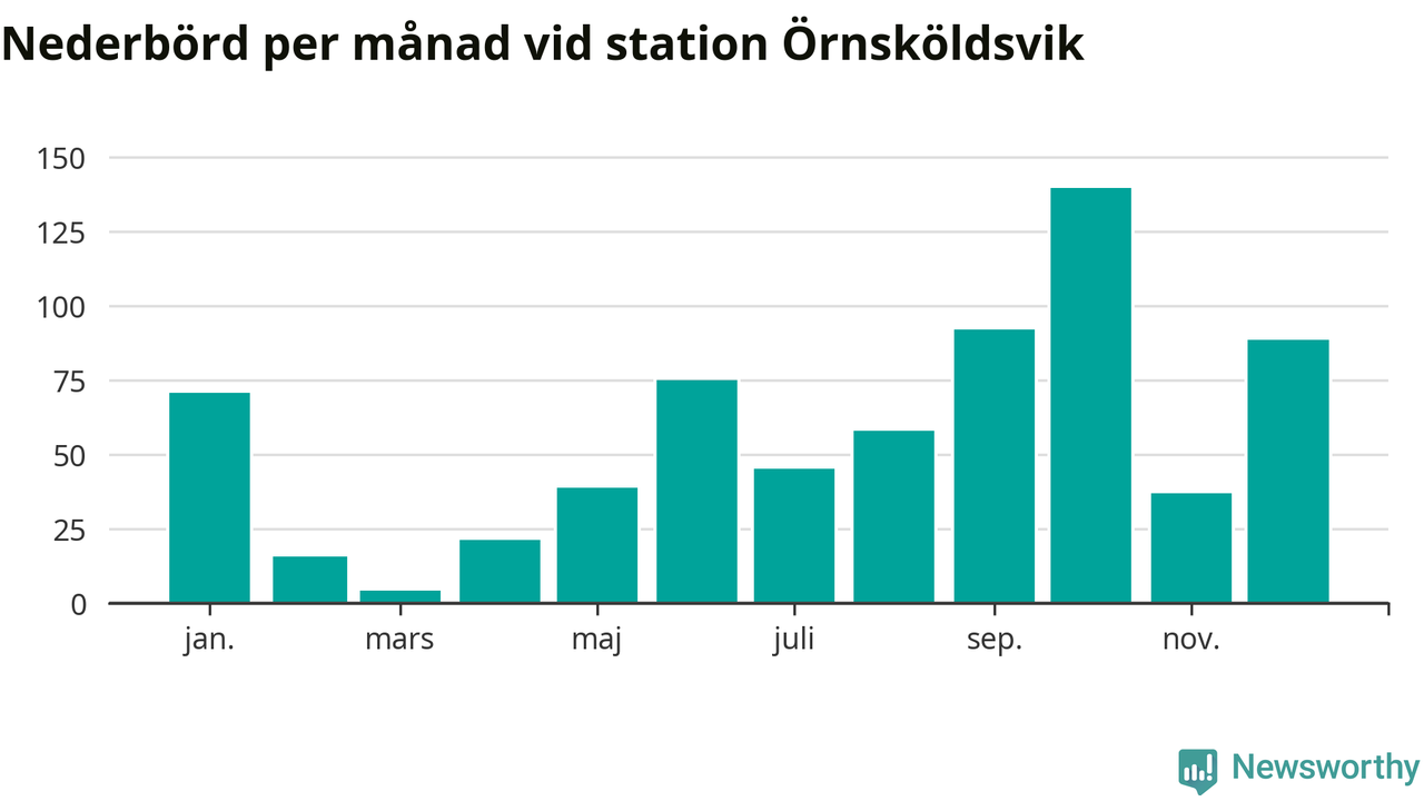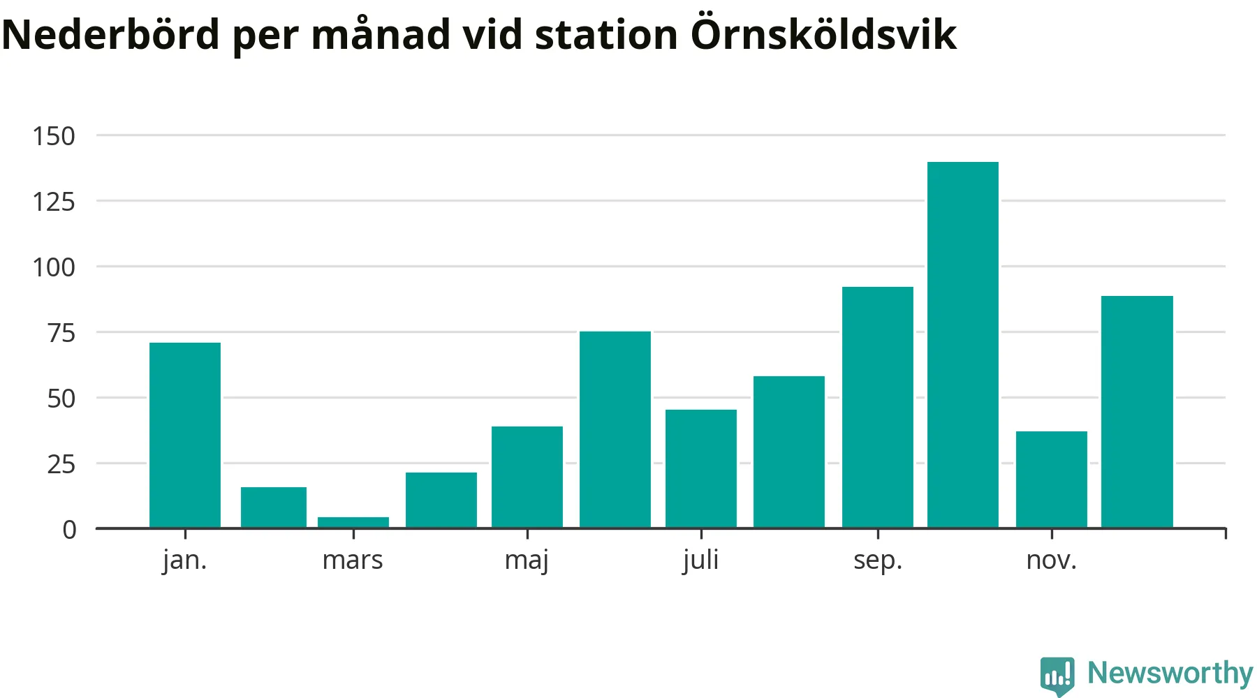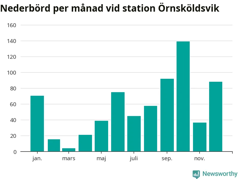 Nederbördsmässigt var 2025 ett ganska normalt år, åtminstone vid Örnsköldsvik, fem kilometer nordöst om centrala Örnsköldsvik2. Totalt föll 686 millimeter nederbörd vid stationen, att jämföra med de senaste tre decenniernas genomsnitt på 655 millimeter. Månaden med mest nederbörd var oktober, med 140 millimeter.