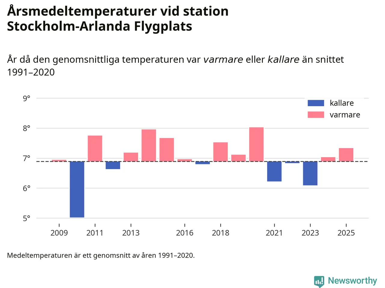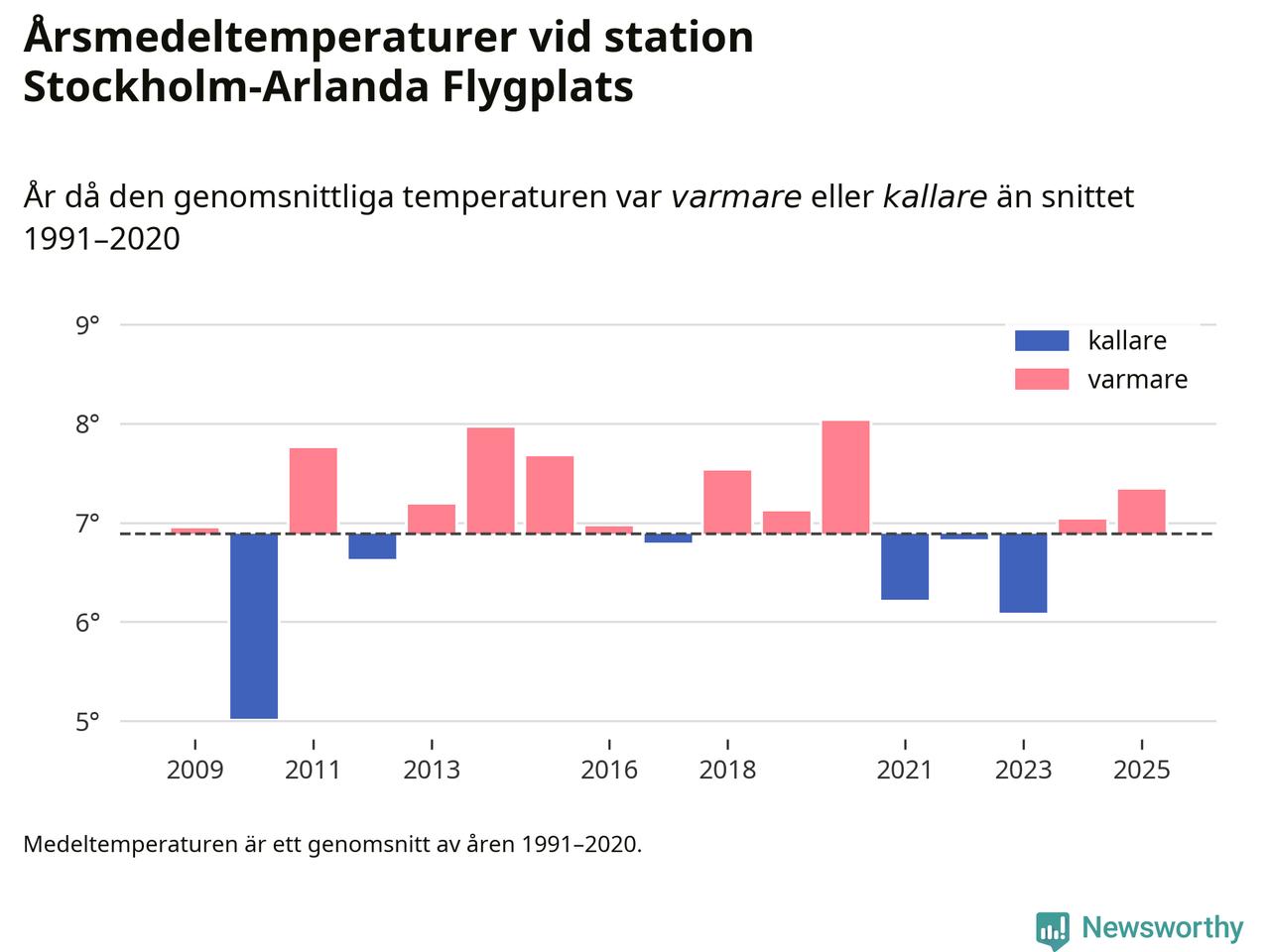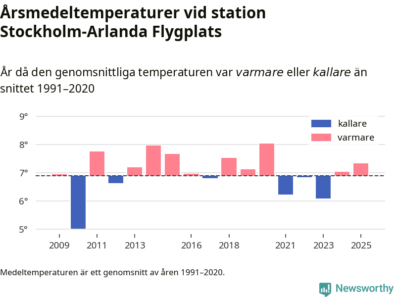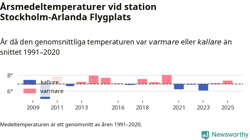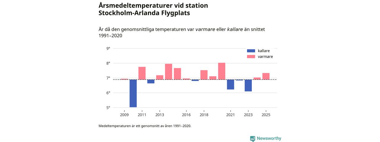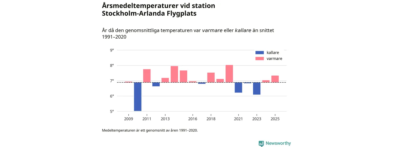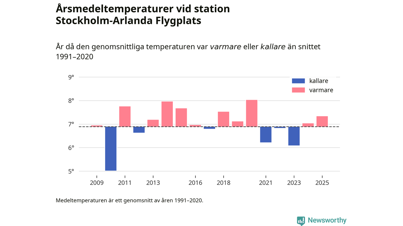 Årsmedeltemperaturen vid Stockholm-Arlanda Flygplats sju kilometer öster om Märsta – den enda aktiva, SMHI-anslutna stationen som mäter medeltemperaturer i Sigtuna kommun – var under 2025 7,3 grader, 0,4 grader högre än genomsnittet de senaste decennierna. Det visar Newsworthys beräkningar, som bygger på delvis preliminär observationsdata från SMHI.