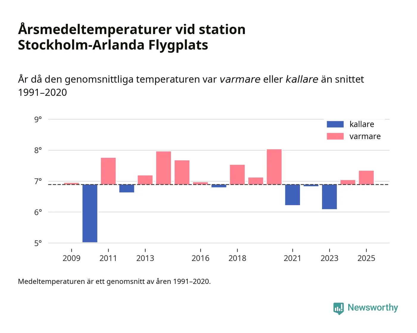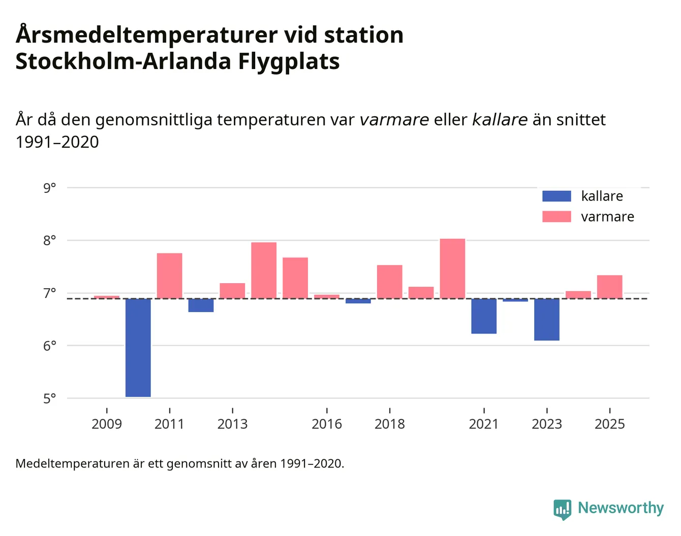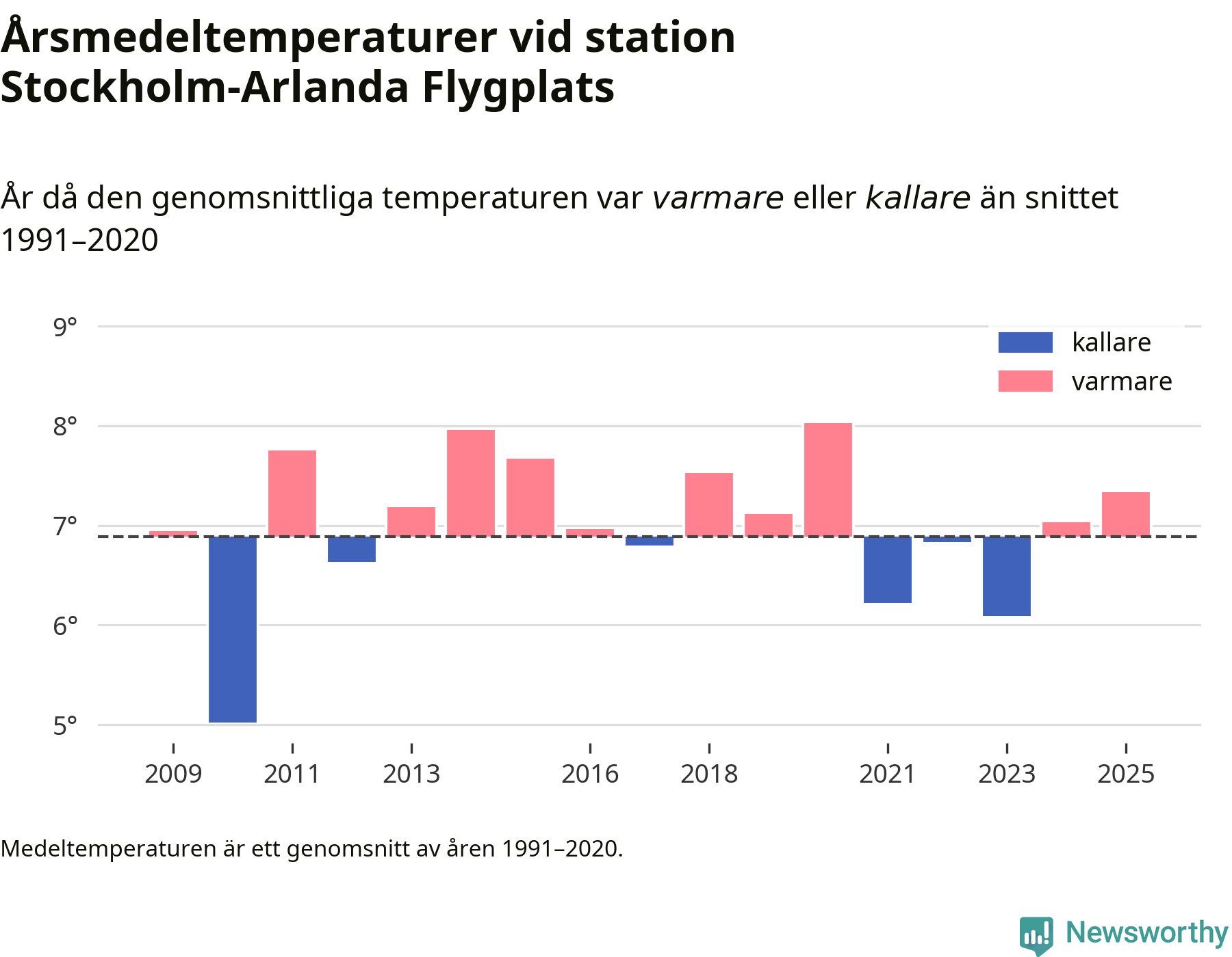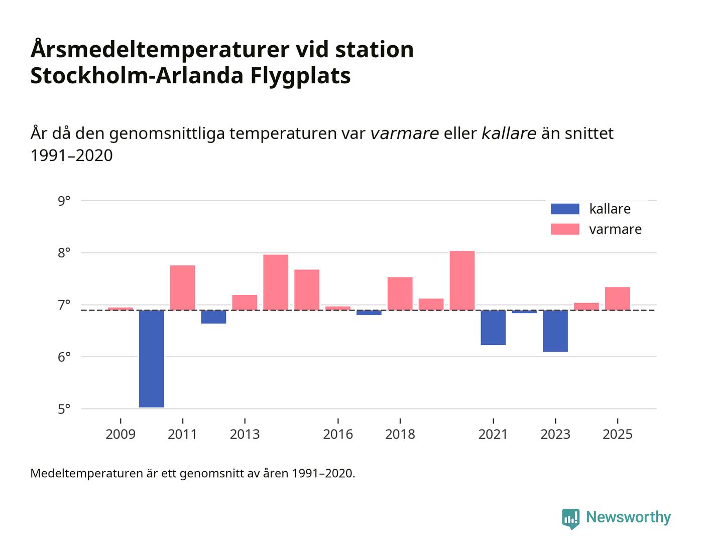Årsmedeltemperaturen vid Stockholm-Arlanda Flygplats sju kilometer öster om Märsta – den enda aktiva, SMHI-anslutna stationen som mäter medeltemperaturer i Sigtuna kommun – var under 2025 7,3 grader, 0,4 grader högre än genomsnittet de senaste decennierna. Det visar Newsworthys beräkningar, som bygger på delvis preliminär observationsdata från SMHI.