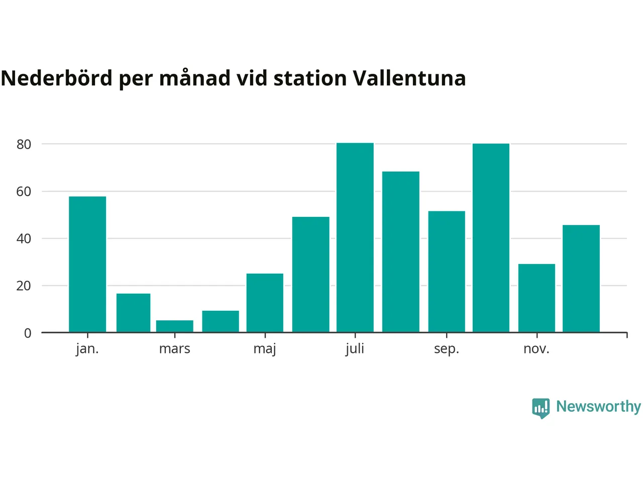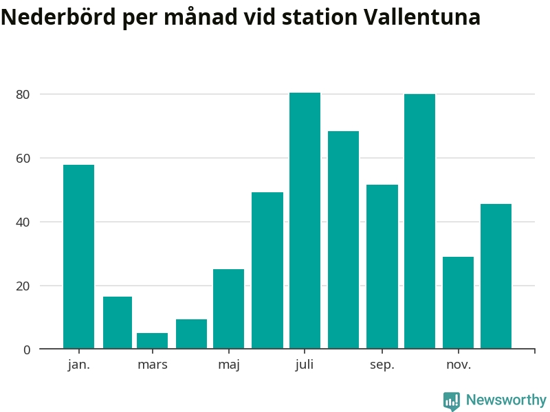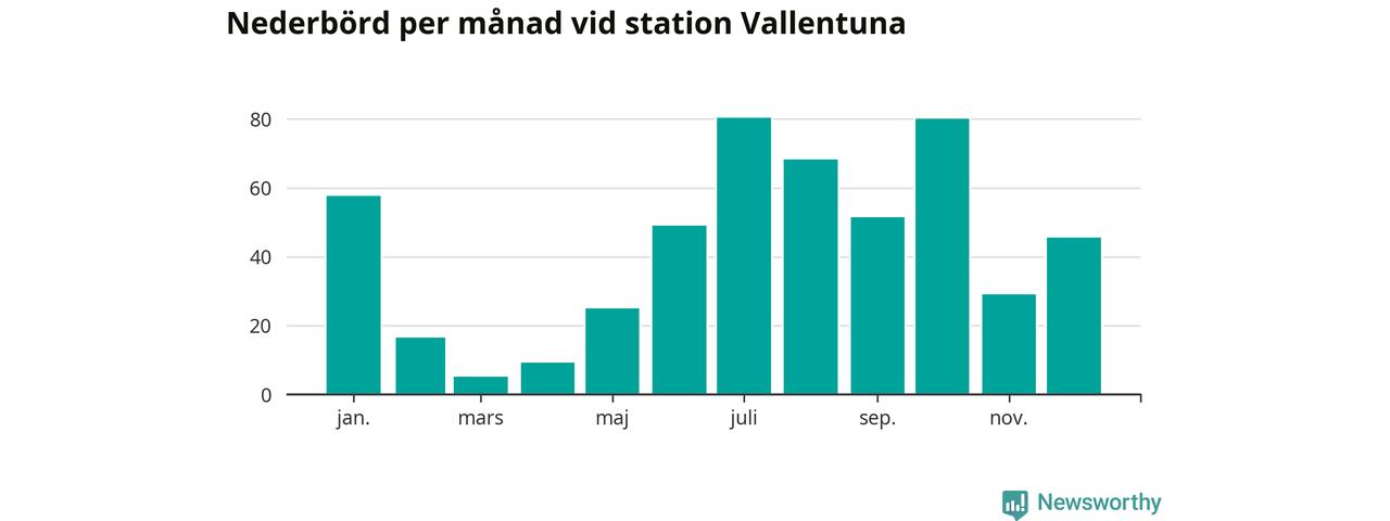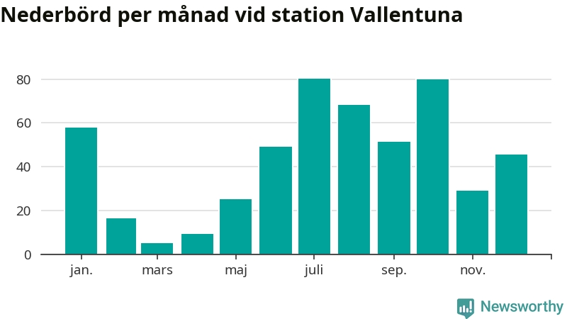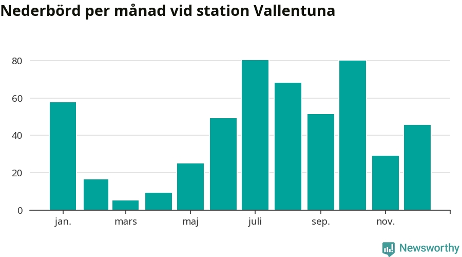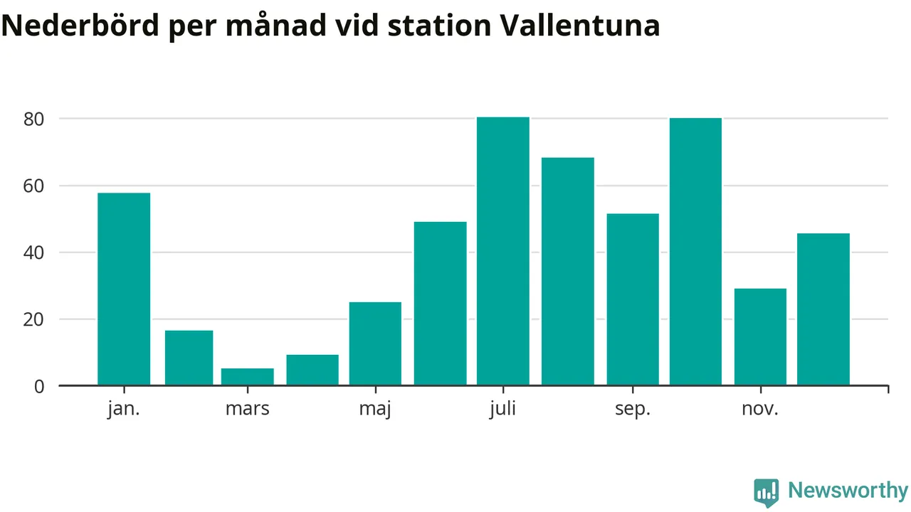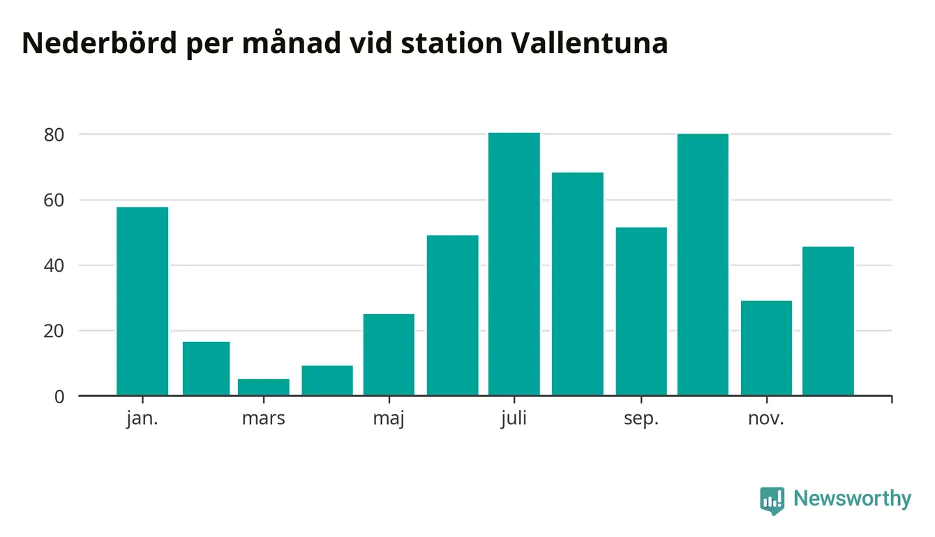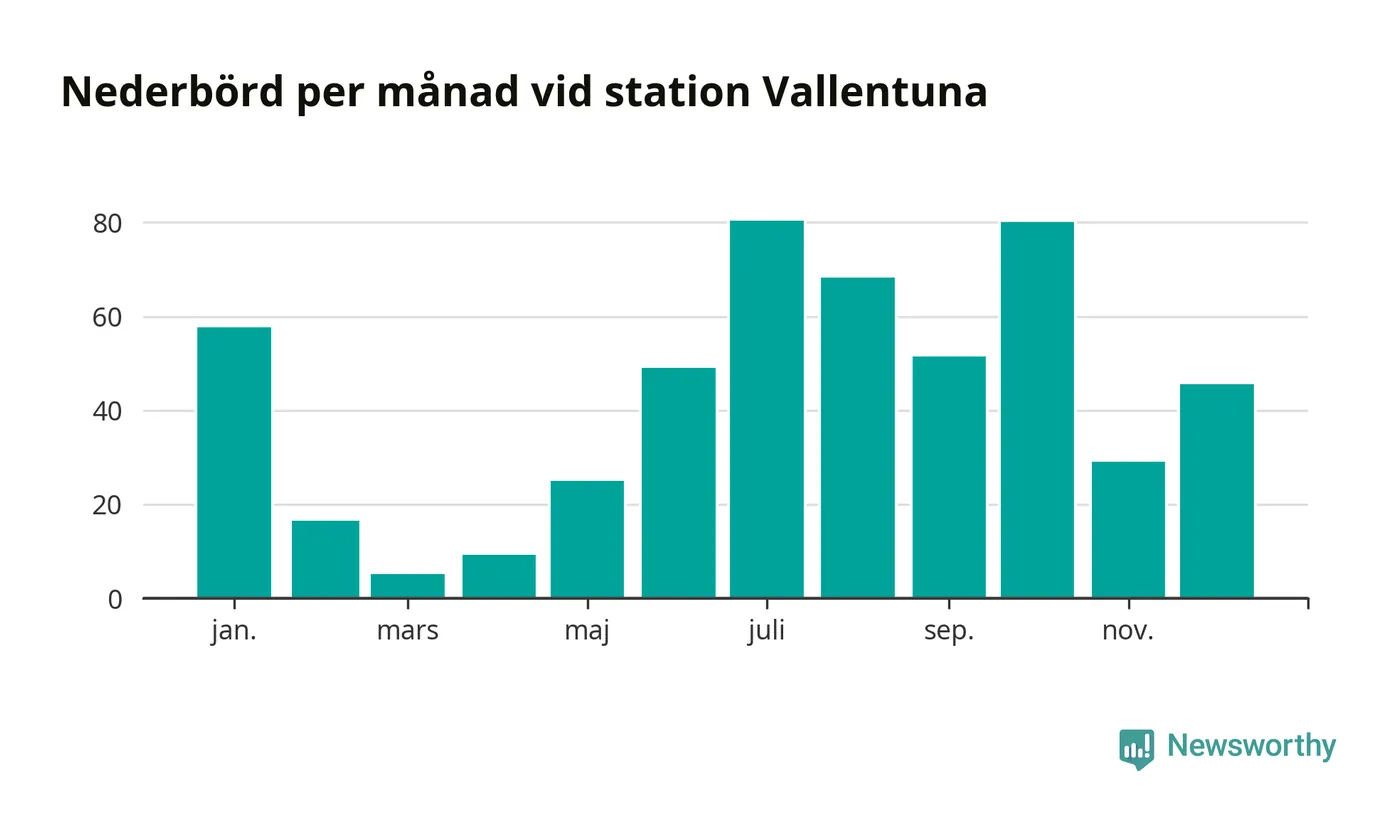 Nederbördsmässigt var 2025 ett ganska normalt år, åtminstone vid Vallentuna, 18 kilometer sydöst om Märsta2. Totalt föll 517 millimeter nederbörd vid stationen, att jämföra med de senaste tre decenniernas genomsnitt på 564 millimeter. Månaden med mest nederbörd var juli, med 80 millimeter.