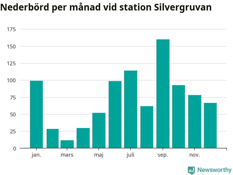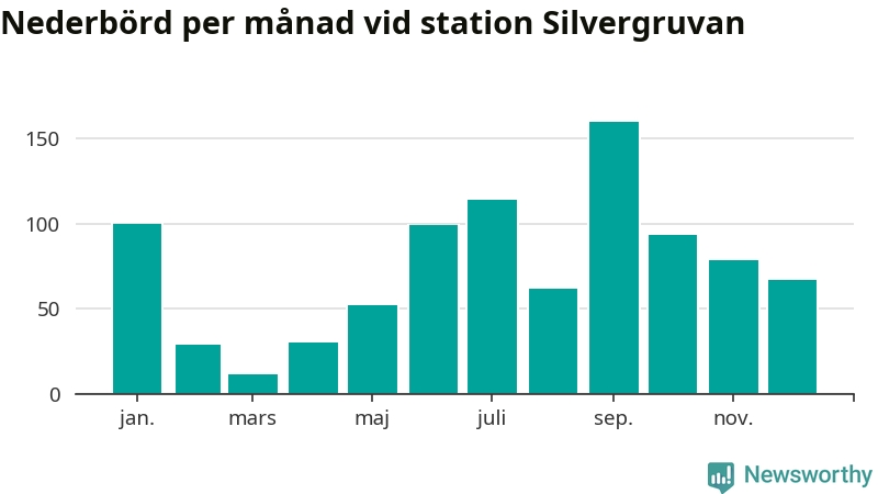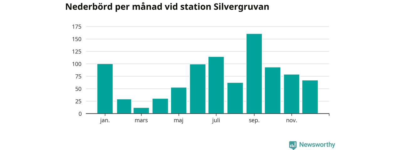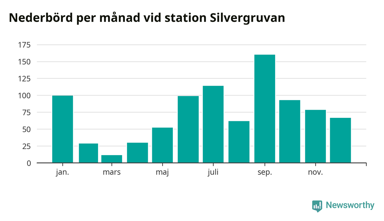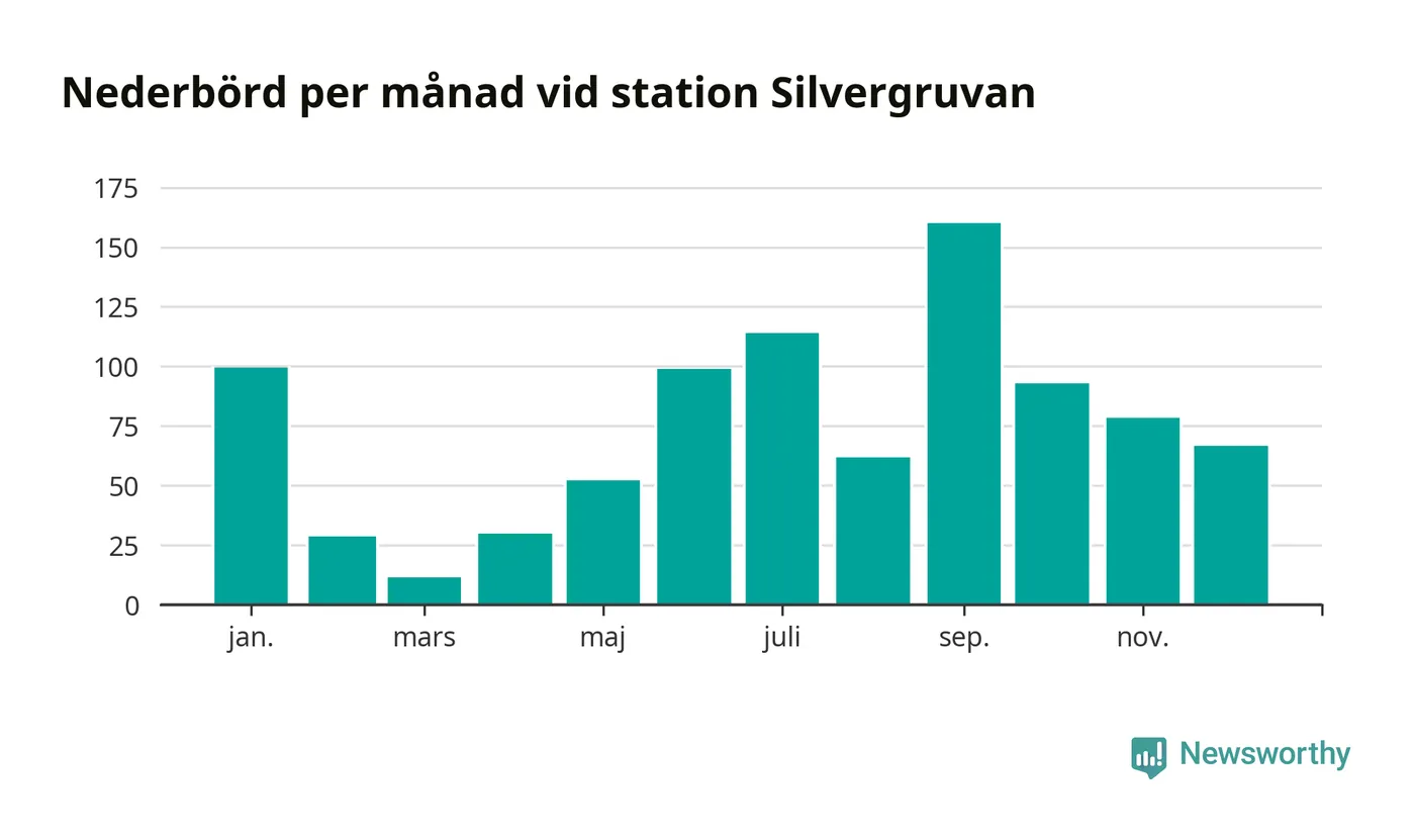Nederbördsmässigt var 2025 ett blötare år än vanligt, åtminstone vid Silvergruvan, åtta kilometer nordväst om centrala Hällefors2. Totalt föll 895 millimeter nederbörd vid stationen, att jämföra med de senaste tre decenniernas genomsnitt på 841 millimeter. Månaden med mest nederbörd var september, med 160 millimeter.