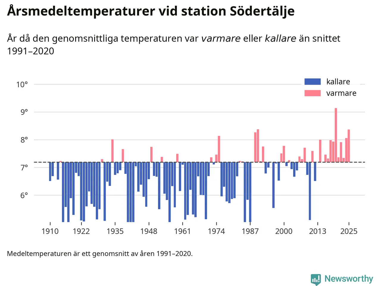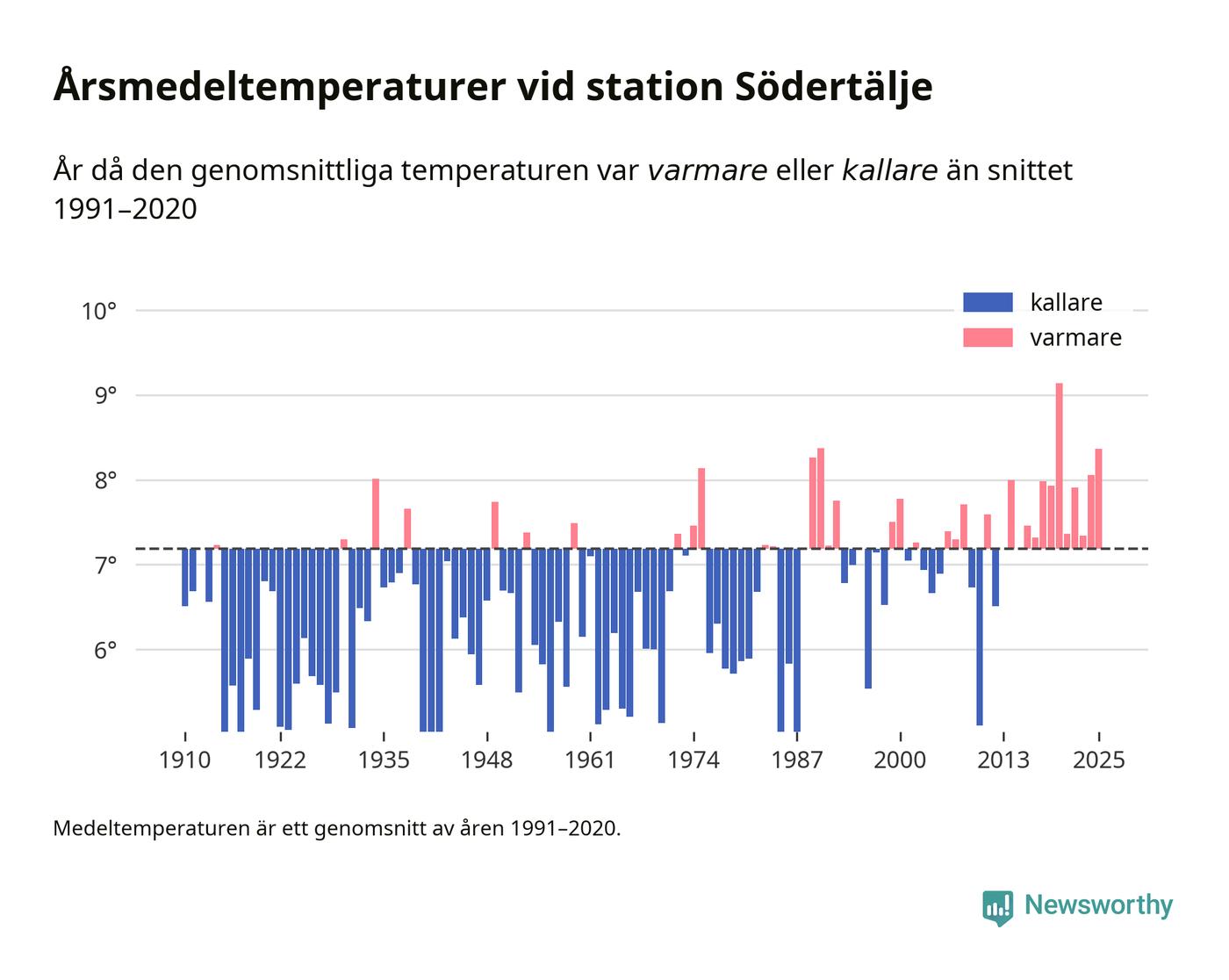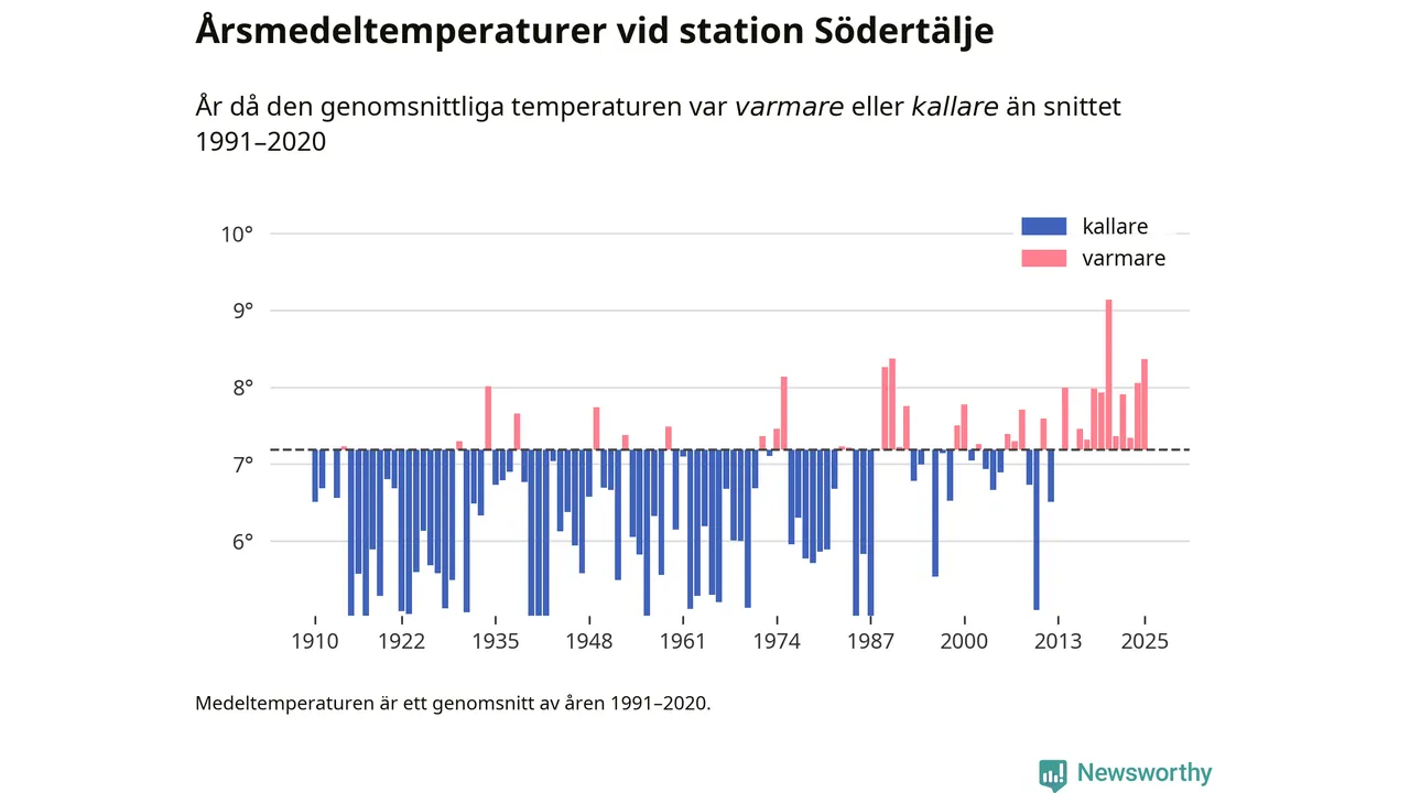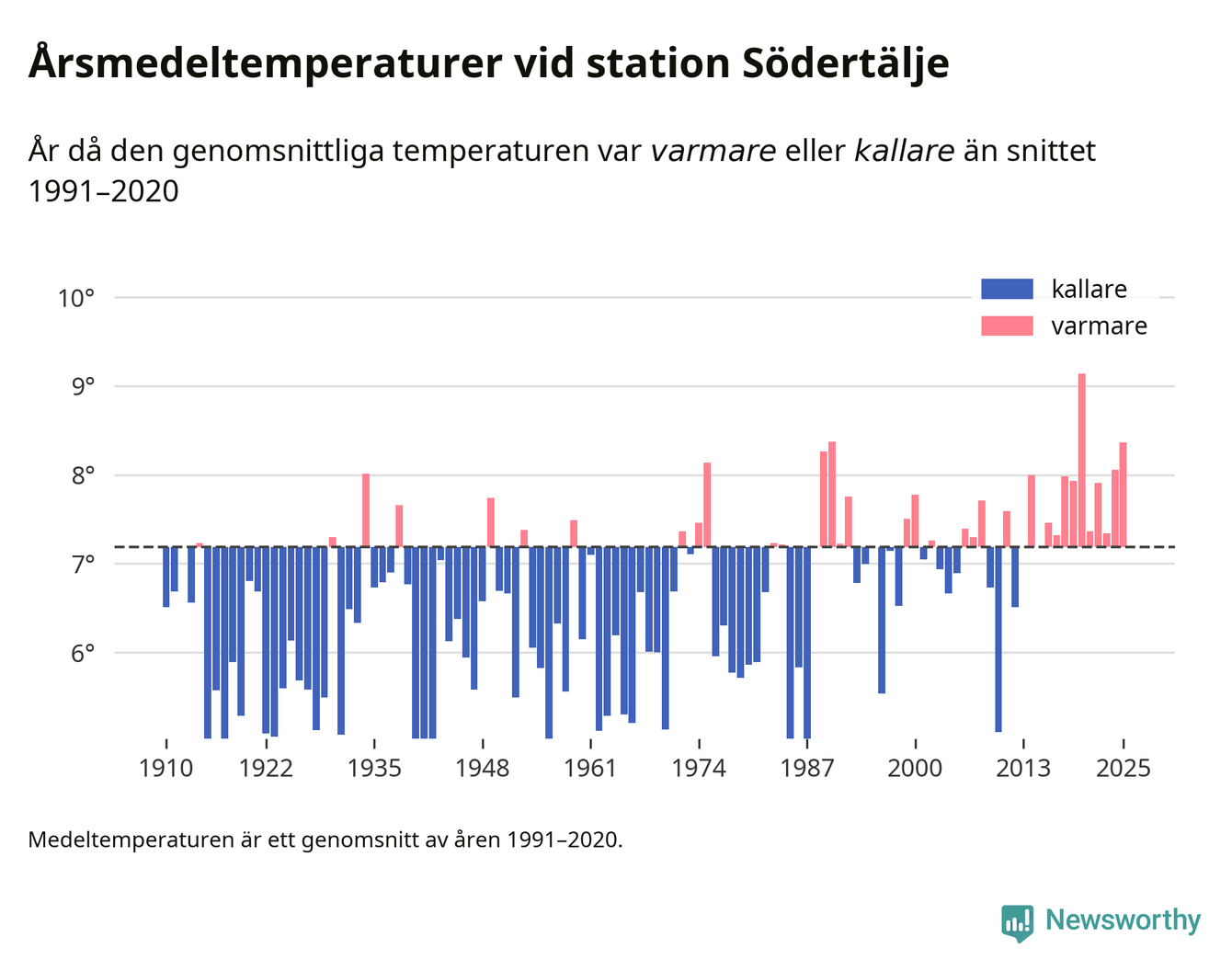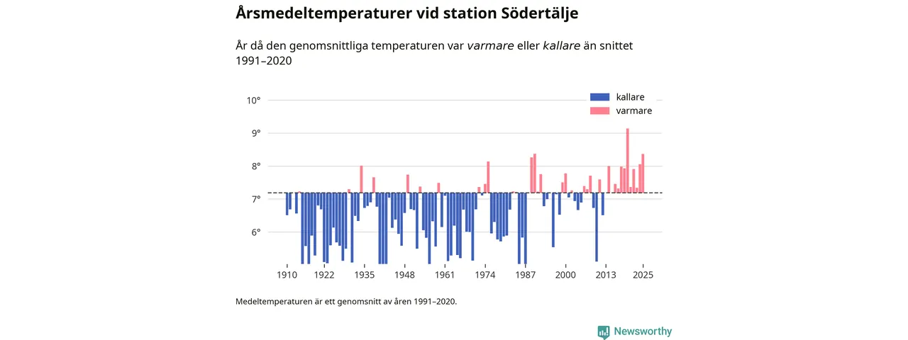 Årsmedeltemperaturen vid Södertälje tolv kilometer sydväst om centrala Ekerö1 var under 2025 8,4 grader, 1,2 grader högre än genomsnittet de senaste decennierna. Det är den tredje högsta noteringen sedan 1910, visar Newsworthys beräkningar baserade på delvis preliminär observationsdata från SMHI.