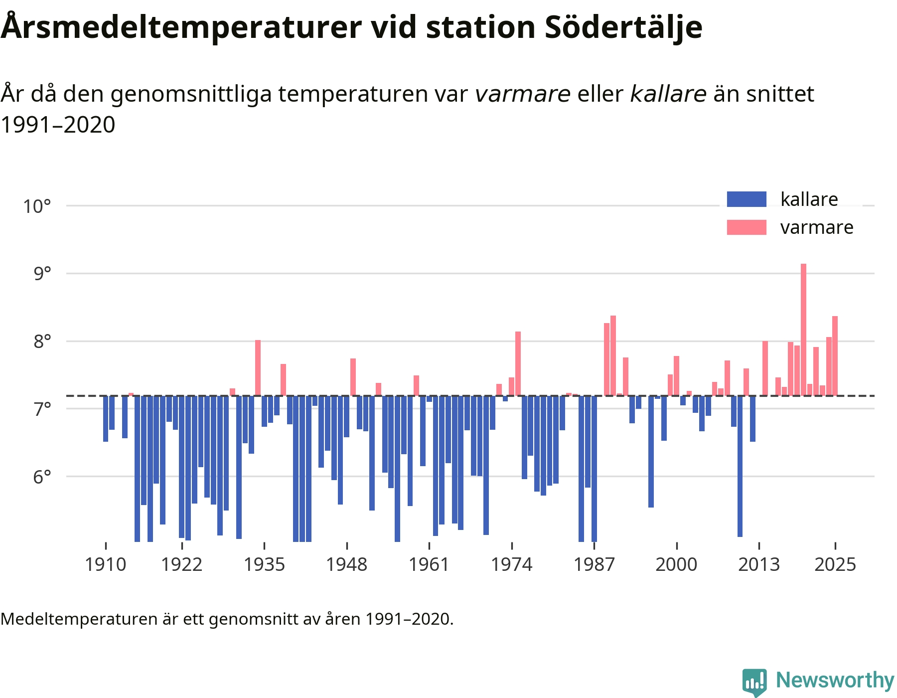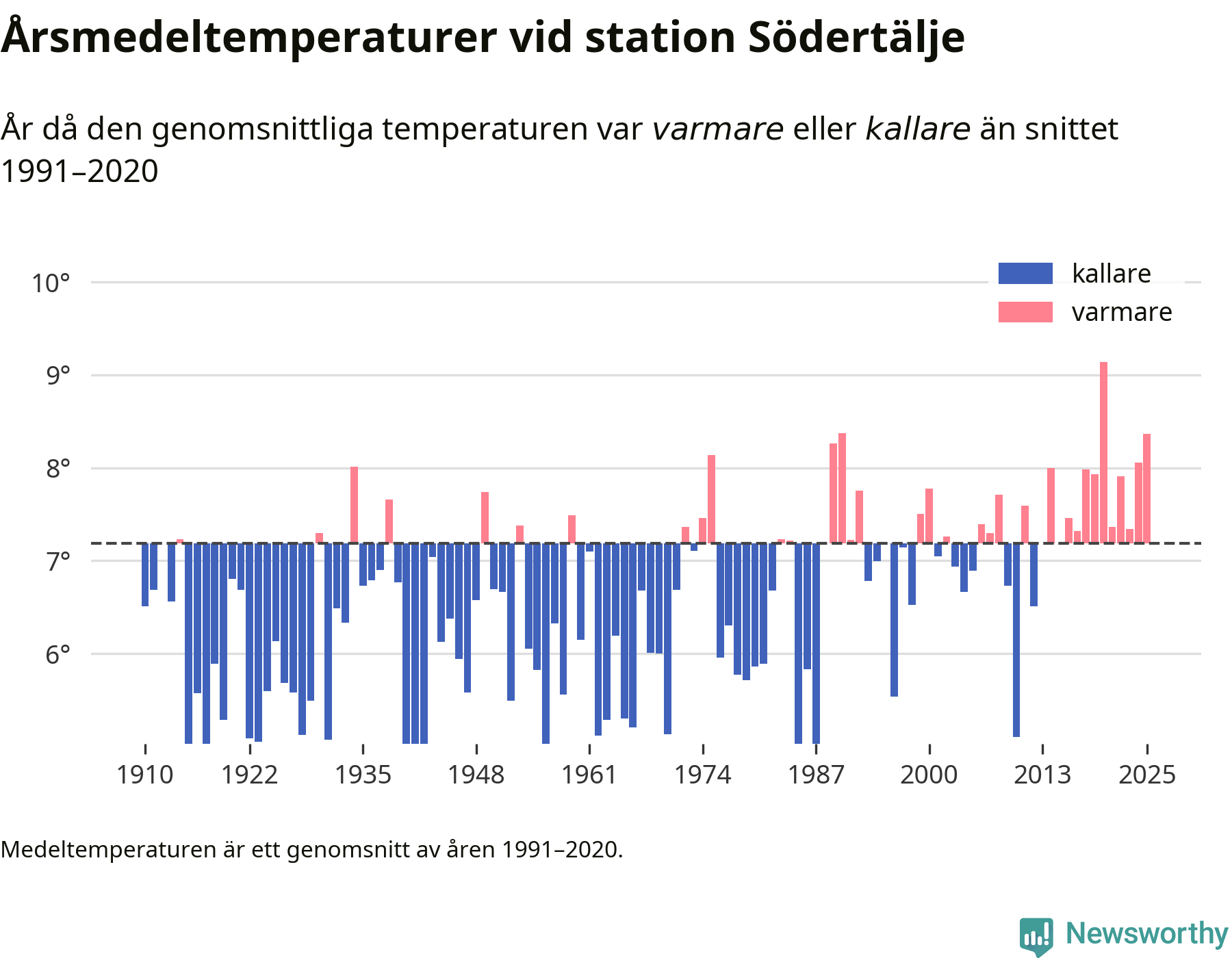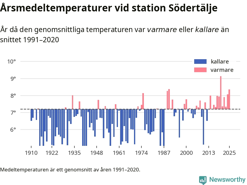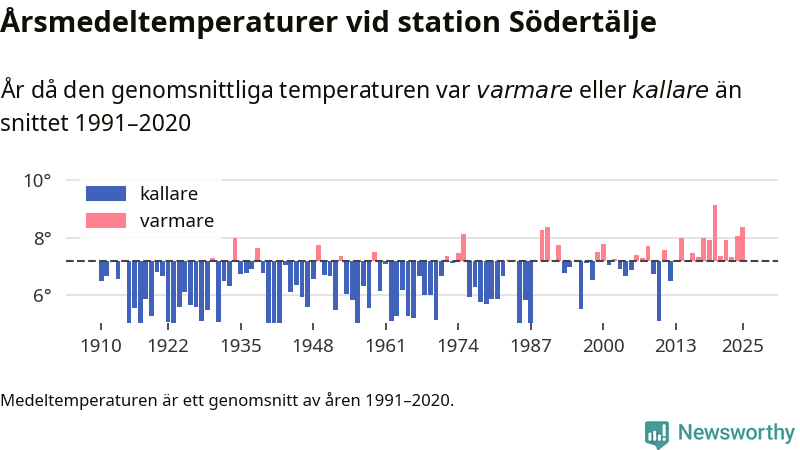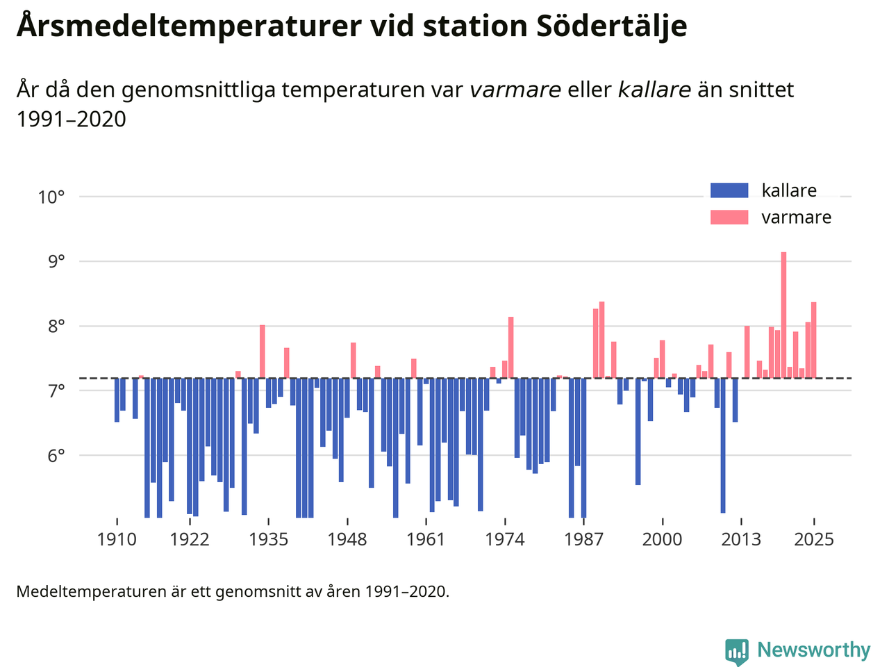Årsmedeltemperaturen vid Södertälje tolv kilometer sydväst om centrala Ekerö1 var under 2025 8,4 grader, 1,2 grader högre än genomsnittet de senaste decennierna. Det är den tredje högsta noteringen sedan 1910, visar Newsworthys beräkningar baserade på delvis preliminär observationsdata från SMHI.