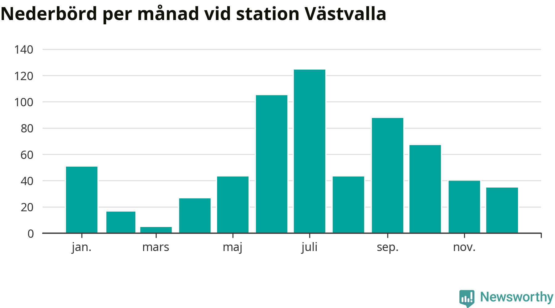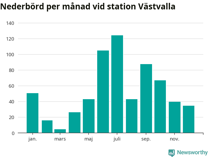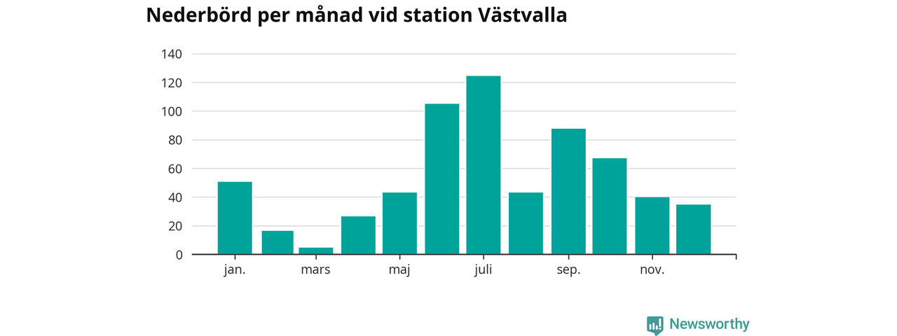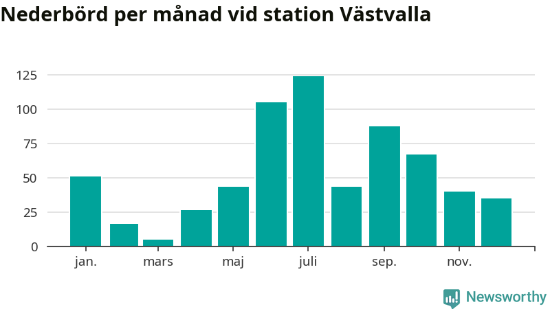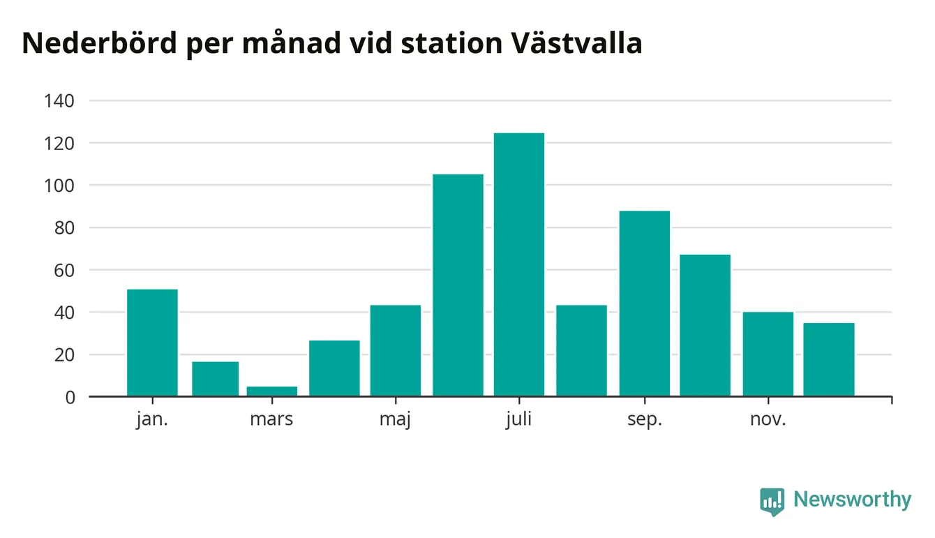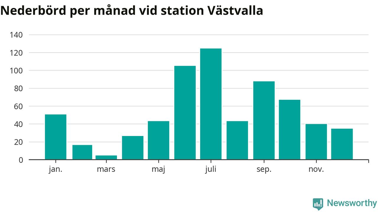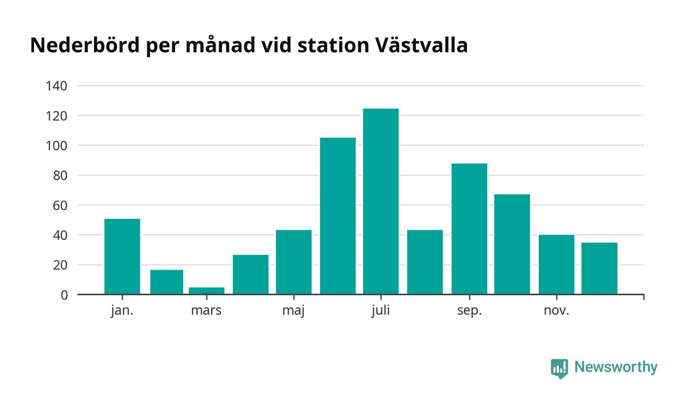 Nederbördsmässigt var 2025 ett ganska normalt år, åtminstone vid Västvalla, tolv kilometer väster om centrala Arboga. Totalt föll 643 millimeter nederbörd vid stationen, att jämföra med de senaste tre decenniernas genomsnitt på 633 millimeter. Månaden med mest nederbörd var juli, med 124 millimeter.