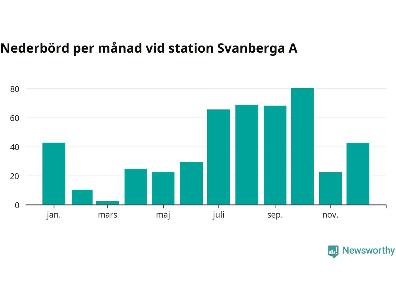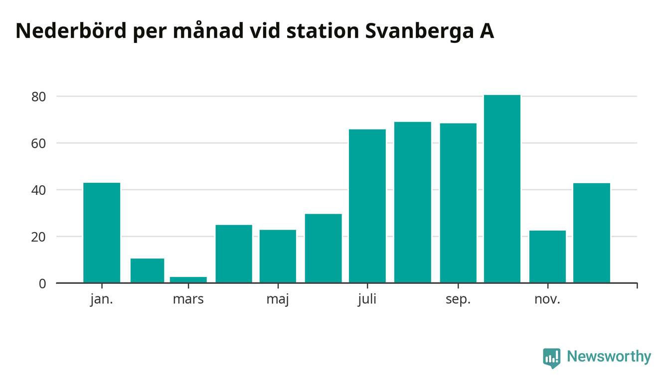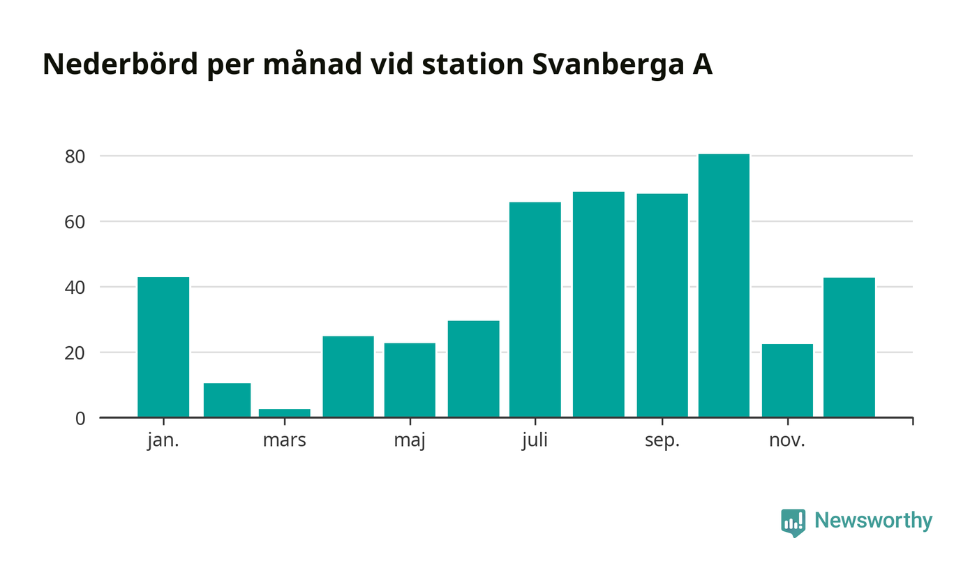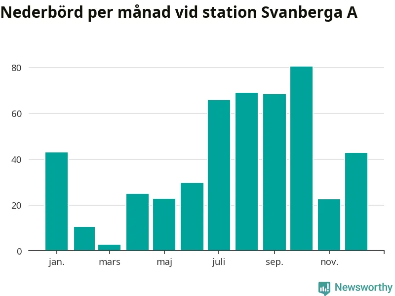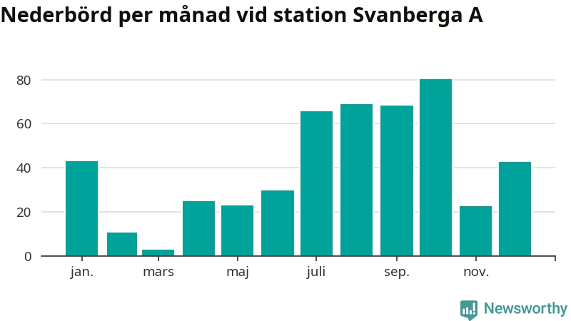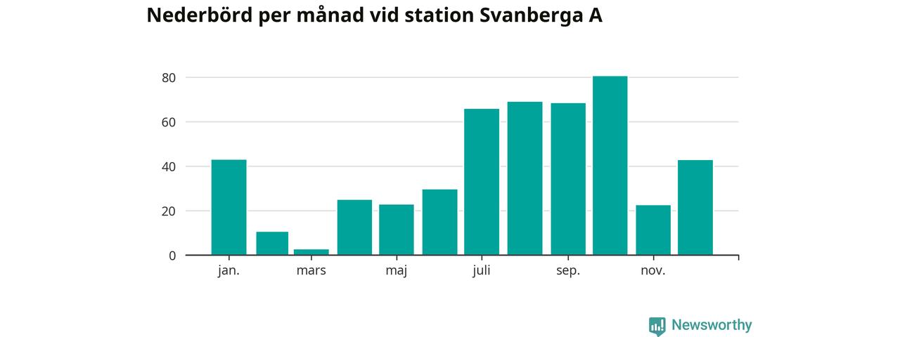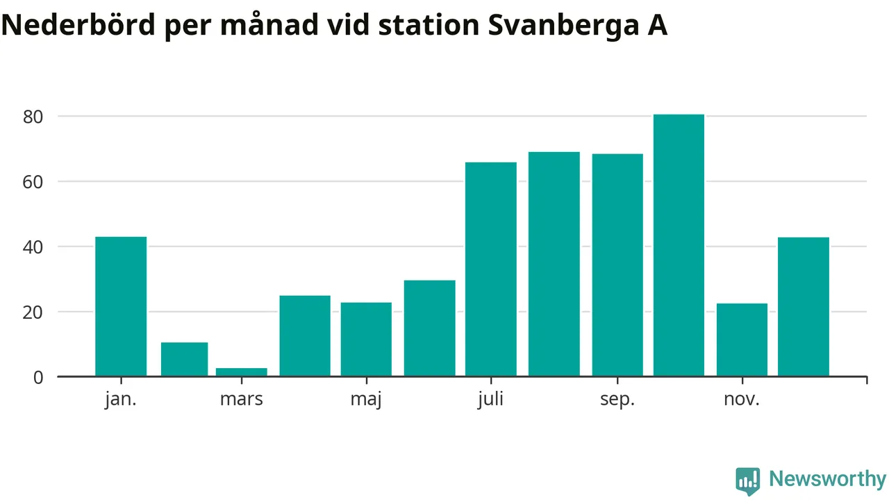 Nederbördsmässigt var 2025 ett torrare år än vanligt vid Svanberga A. Totalt föll 482 millimeter nederbörd vid stationen, att jämföra med de senaste tre decenniernas genomsnitt på 562 millimeter. Månaden med mest nederbörd var oktober, med 80 millimeter.