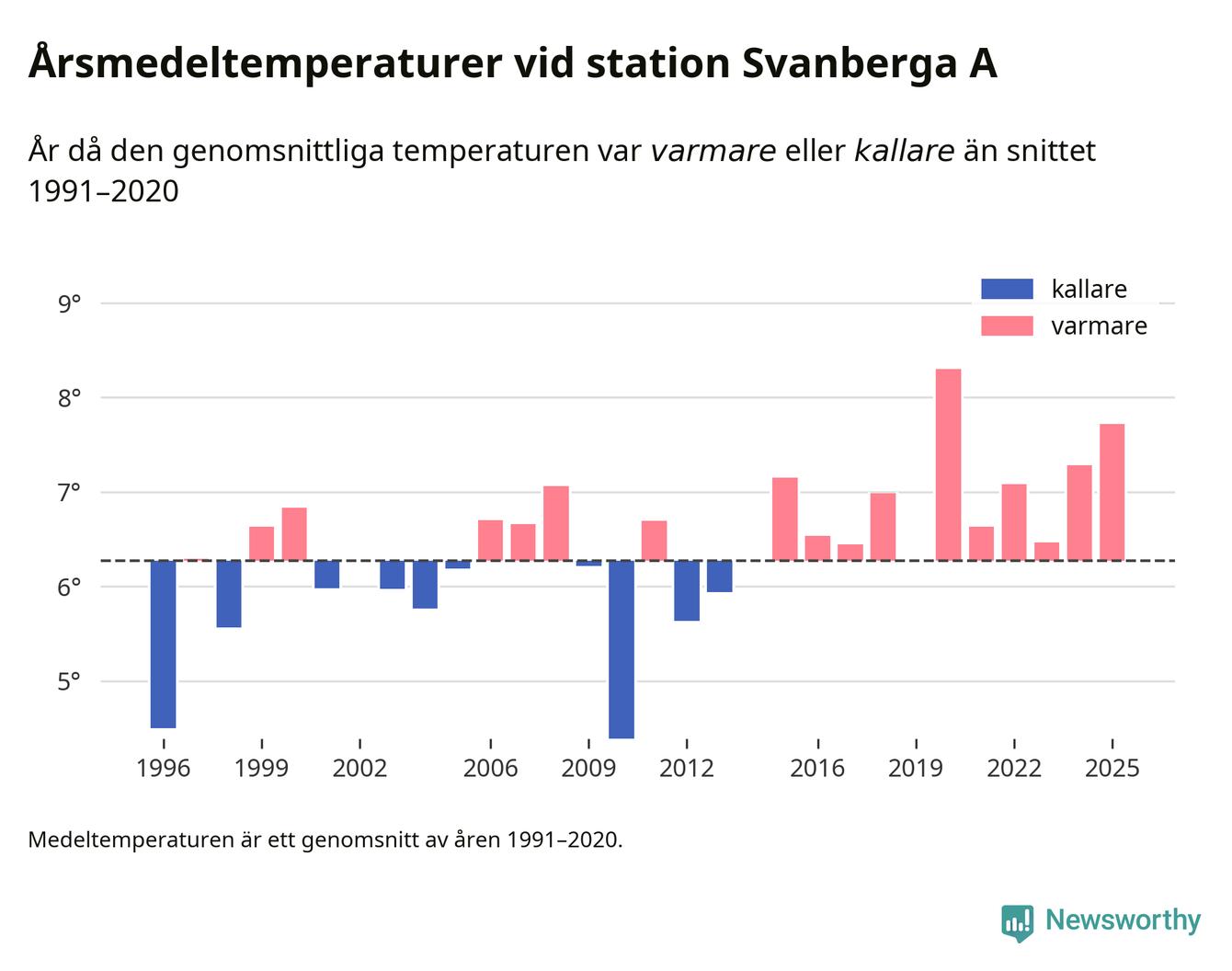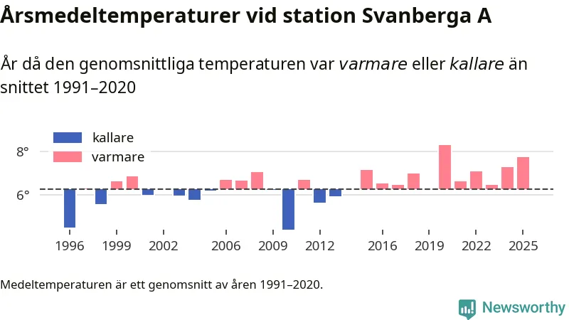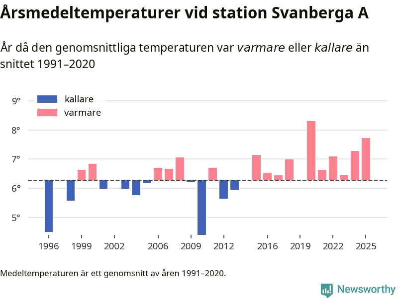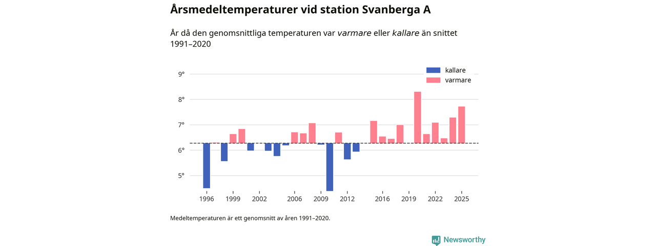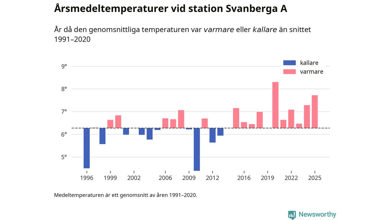 Årsmedeltemperaturen vid Svanberga A nio kilometer nordväst om centrala Norrtälje – den enda aktiva, SMHI-anslutna stationen som mäter medeltemperaturer i Norrtälje kommun – var under 2025 7,7 grader, 1,4 grader högre än genomsnittet de senaste decennierna. Det är den näst högsta noteringen sedan 1996, visar Newsworthys beräkningar baserade på delvis preliminär observationsdata från SMHI.