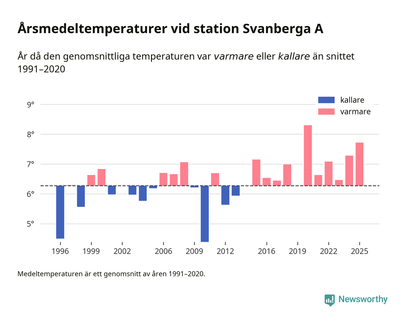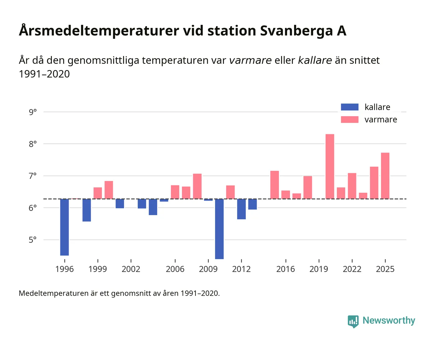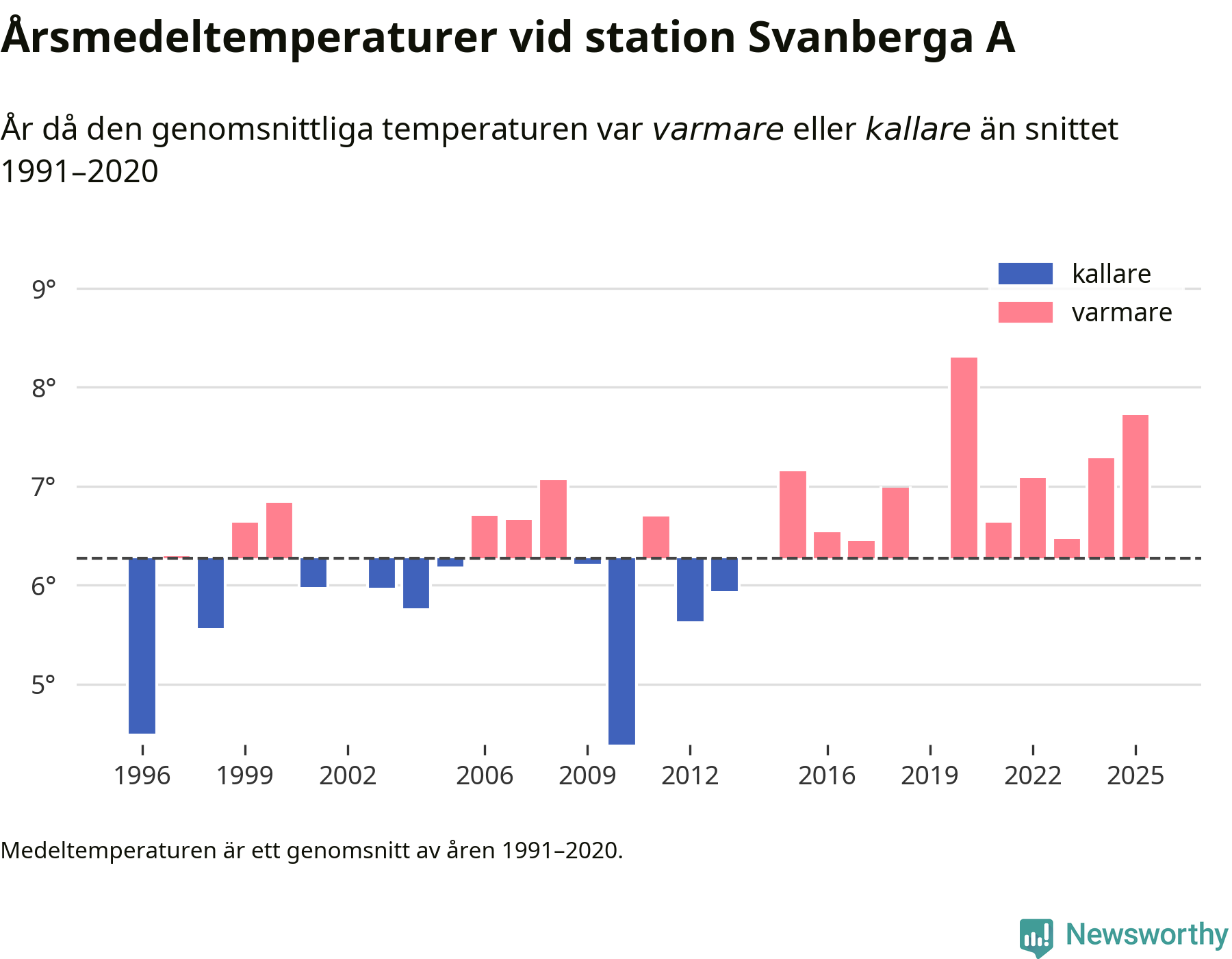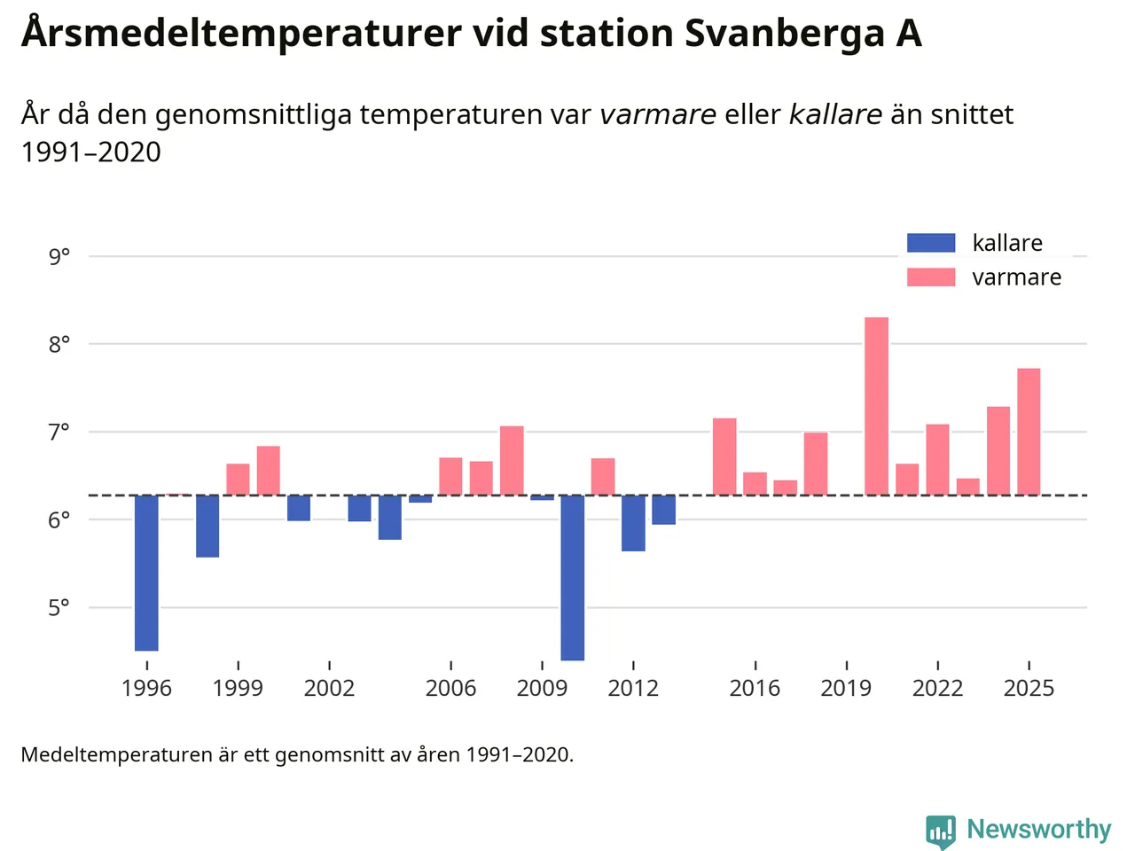 Årsmedeltemperaturen vid Svanberga A nio kilometer nordväst om centrala Norrtälje – den enda aktiva, SMHI-anslutna stationen som mäter medeltemperaturer i Norrtälje kommun – var under 2025 7,7 grader, 1,4 grader högre än genomsnittet de senaste decennierna. Det är den näst högsta noteringen sedan 1996, visar Newsworthys beräkningar baserade på delvis preliminär observationsdata från SMHI.