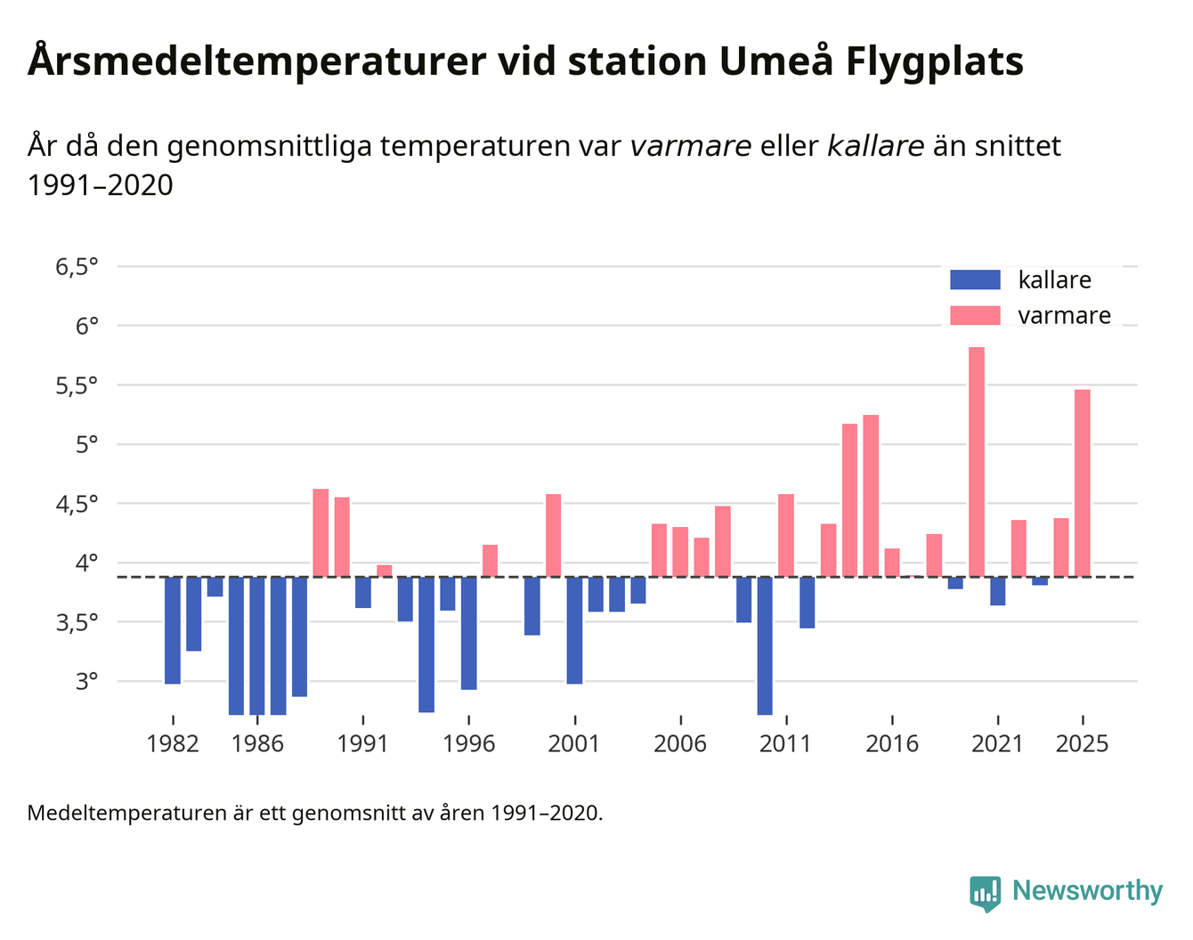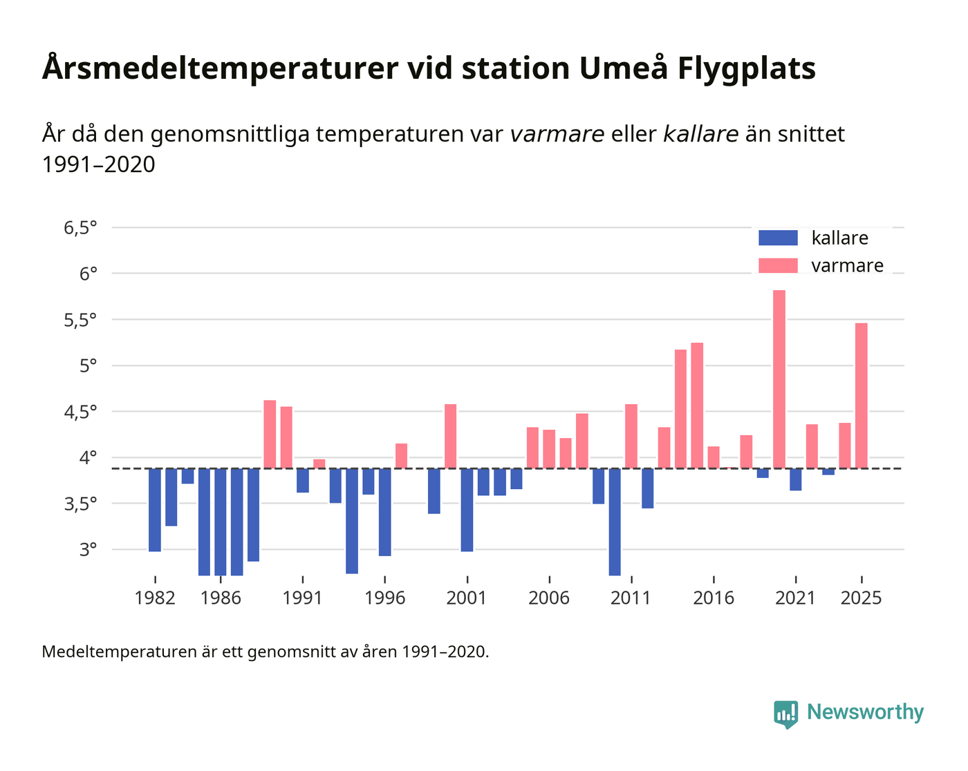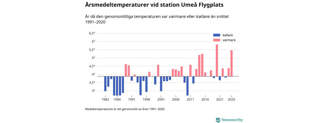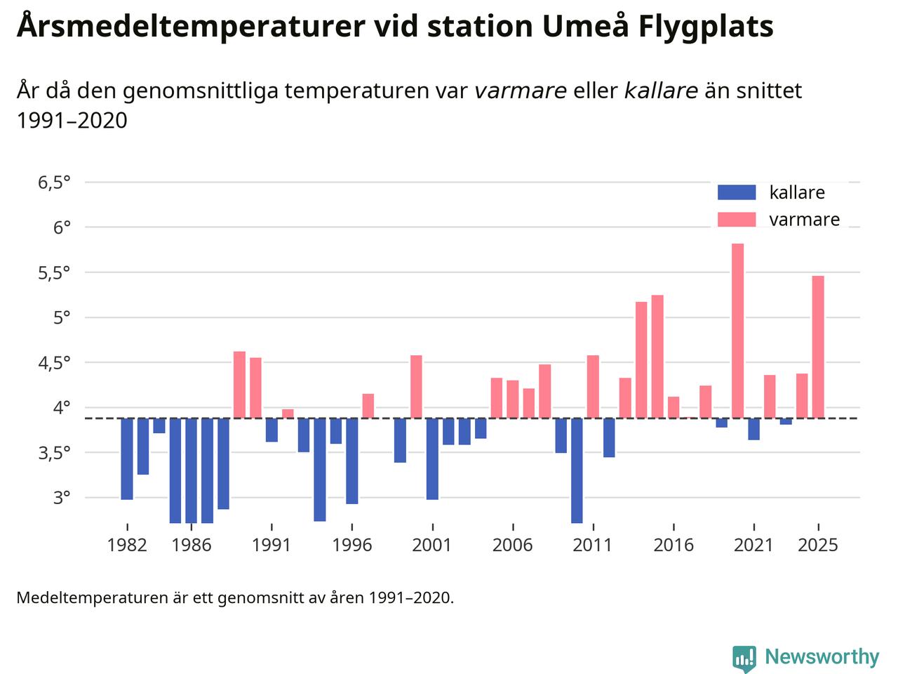 Årsmedeltemperaturen vid Umeå Flygplats fyra kilometer söder om centrala Umeå1 var under 2025 5,5 grader, 1,6 grader högre än genomsnittet de senaste decennierna. Det är den näst högsta noteringen sedan 1965, visar Newsworthys beräkningar baserade på delvis preliminär observationsdata från SMHI.