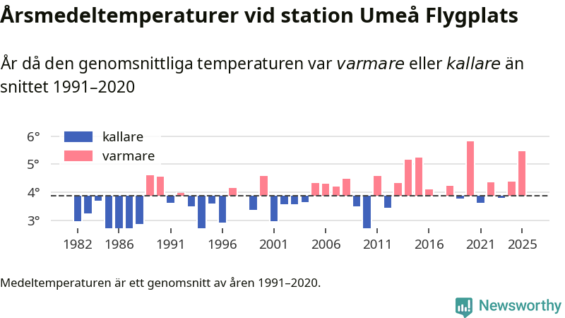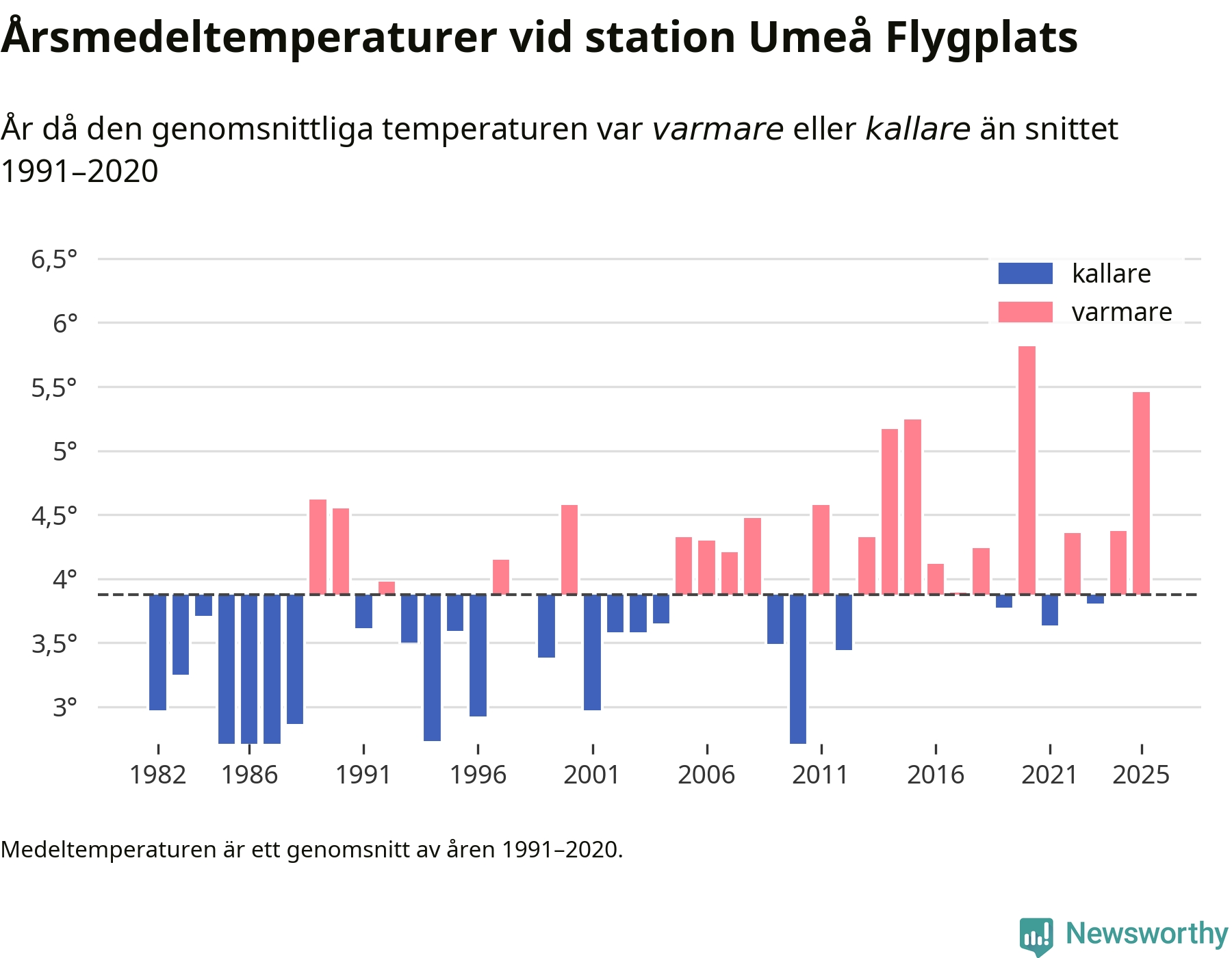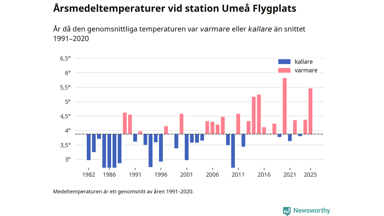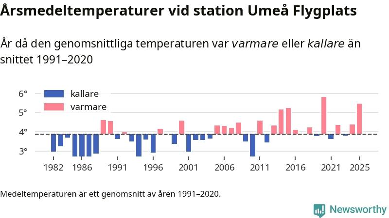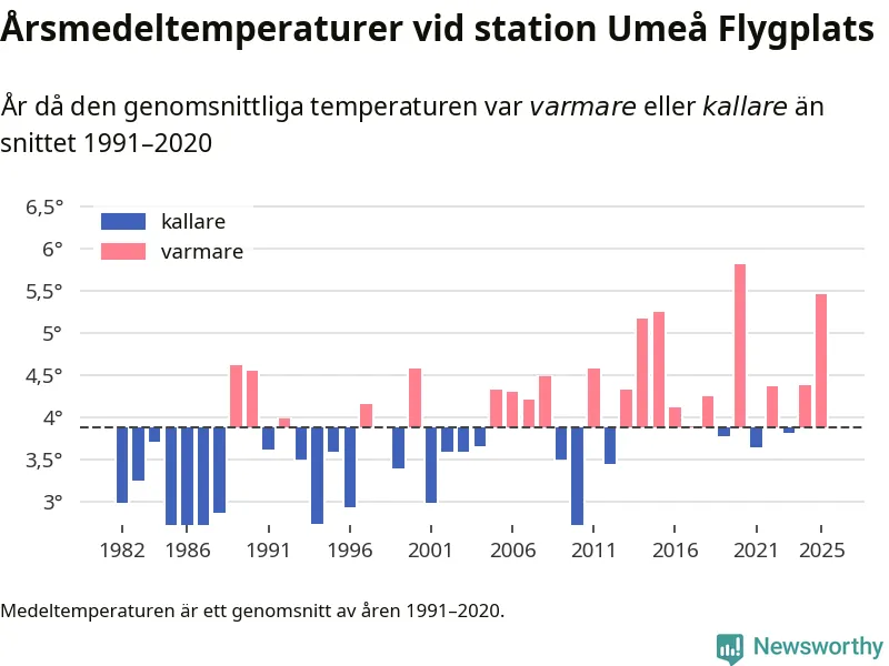 Årsmedeltemperaturen vid Umeå Flygplats fyra kilometer söder om centrala Umeå1 var under 2025 5,5 grader, 1,6 grader högre än genomsnittet de senaste decennierna. Det är den näst högsta noteringen sedan 1965, visar Newsworthys beräkningar baserade på delvis preliminär observationsdata från SMHI.