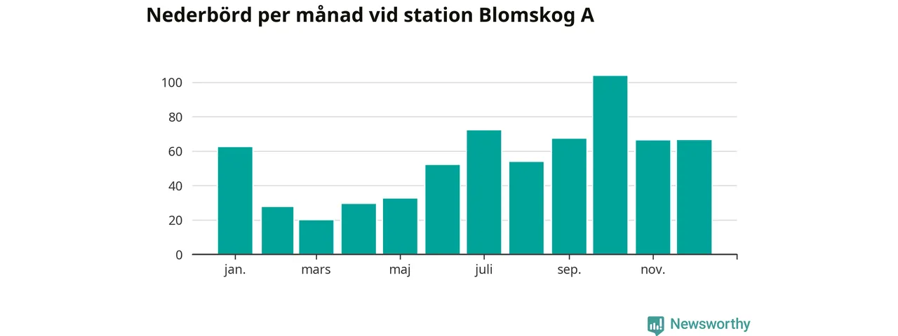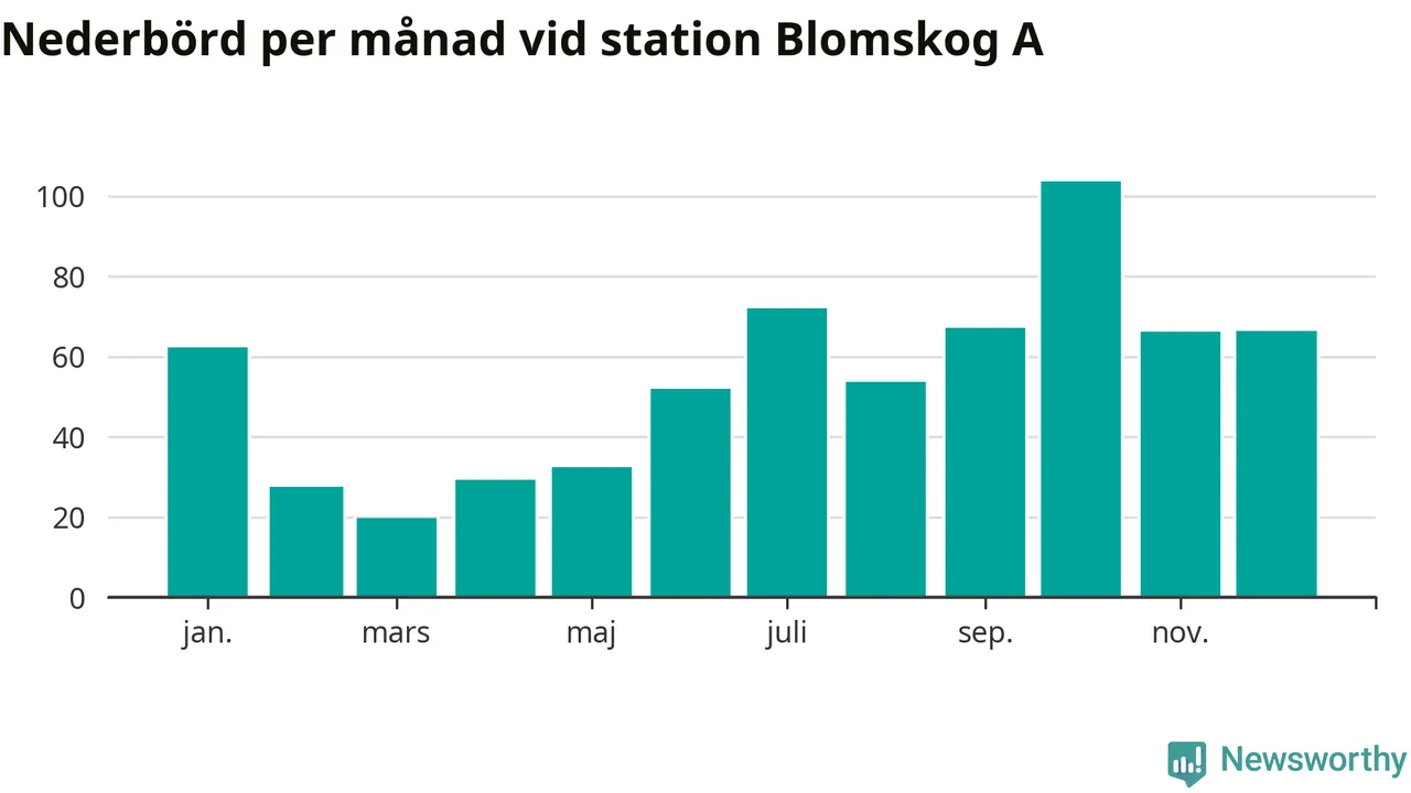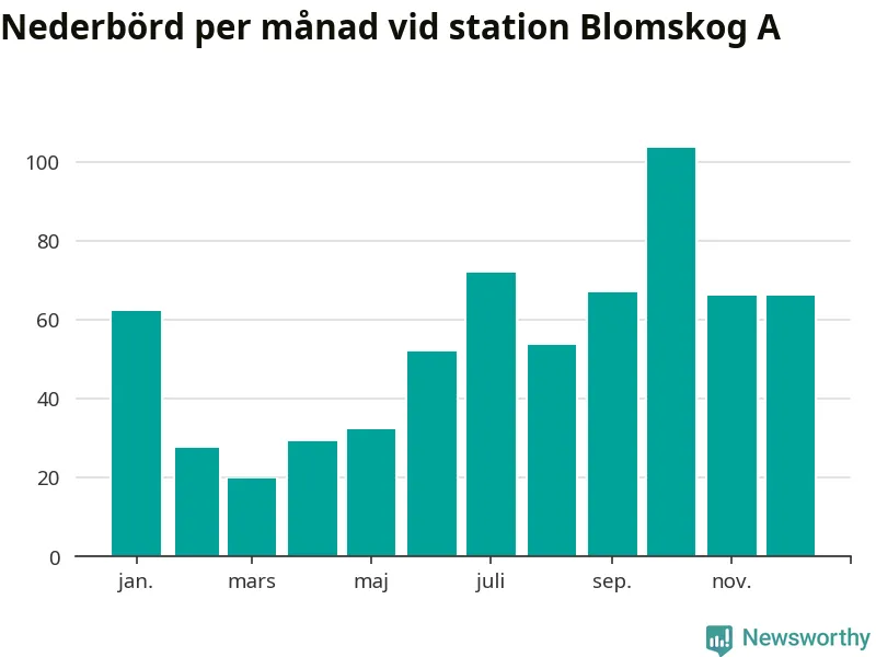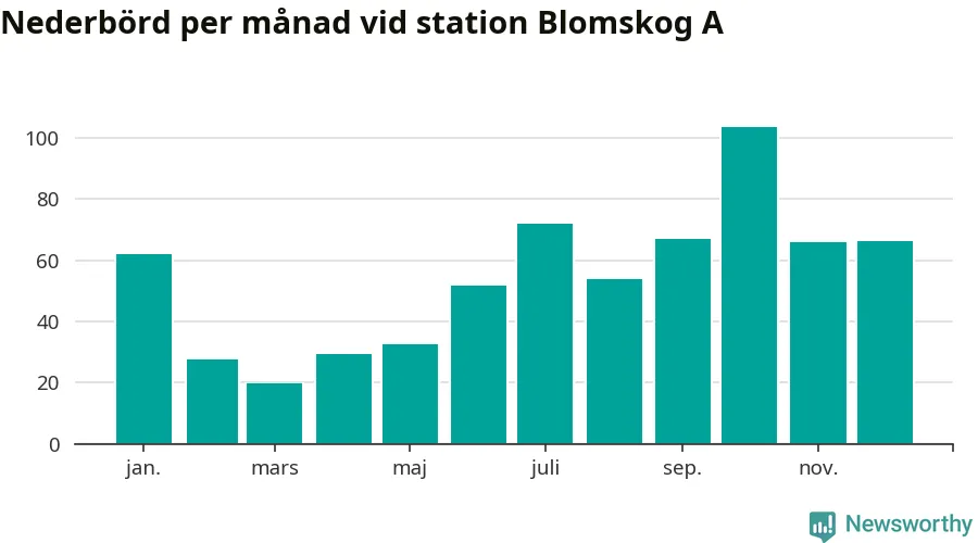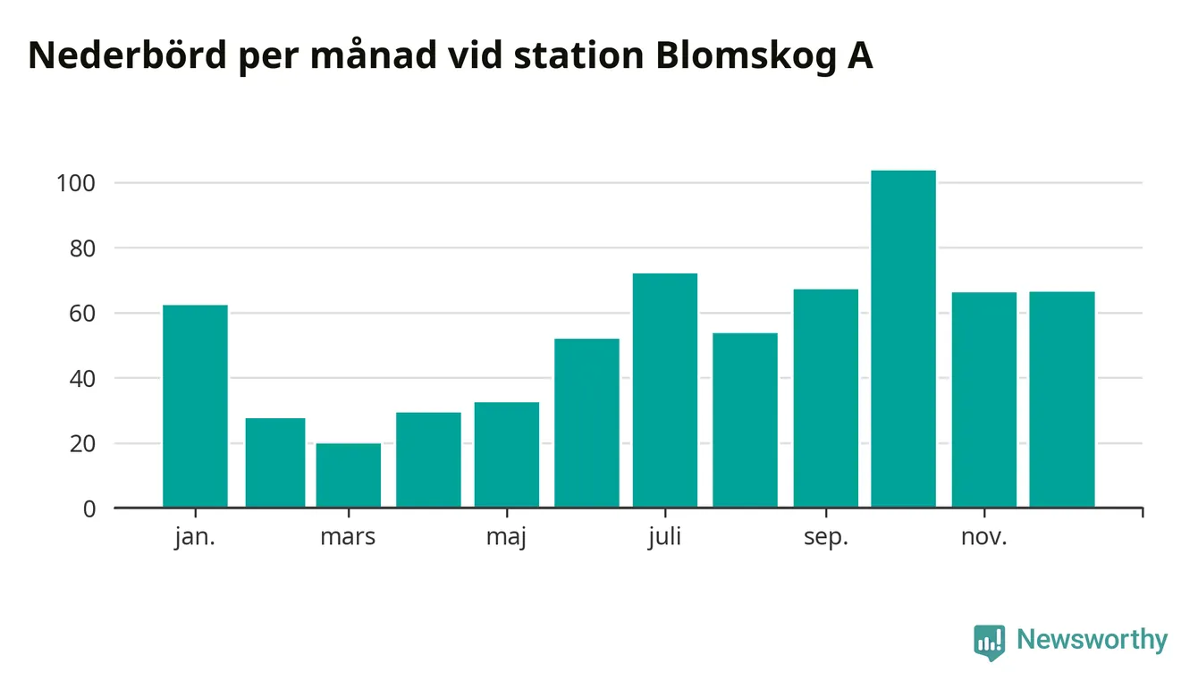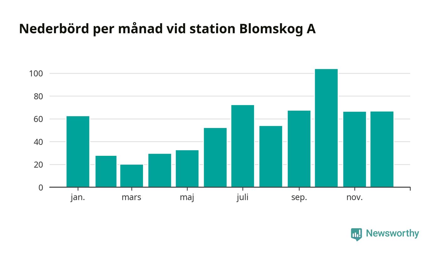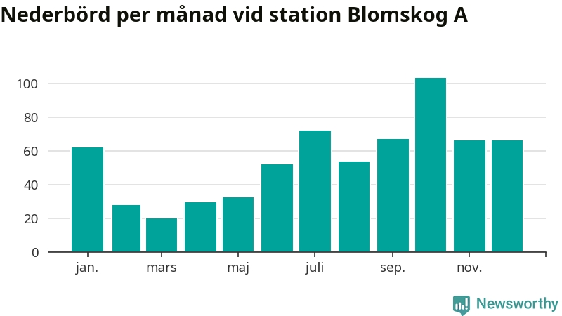 Nederbördsmässigt var 2025 ett torrare år än vanligt vid Blomskog A. Totalt föll 652 millimeter nederbörd vid stationen, att jämföra med de senaste tre decenniernas genomsnitt på 749 millimeter. Månaden med mest nederbörd var oktober, med 104 millimeter.