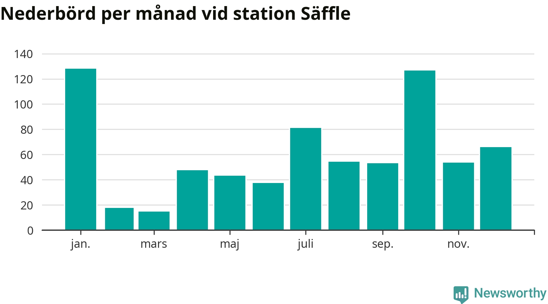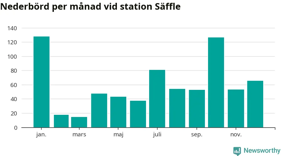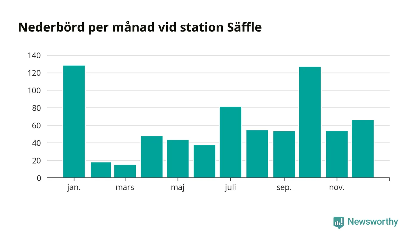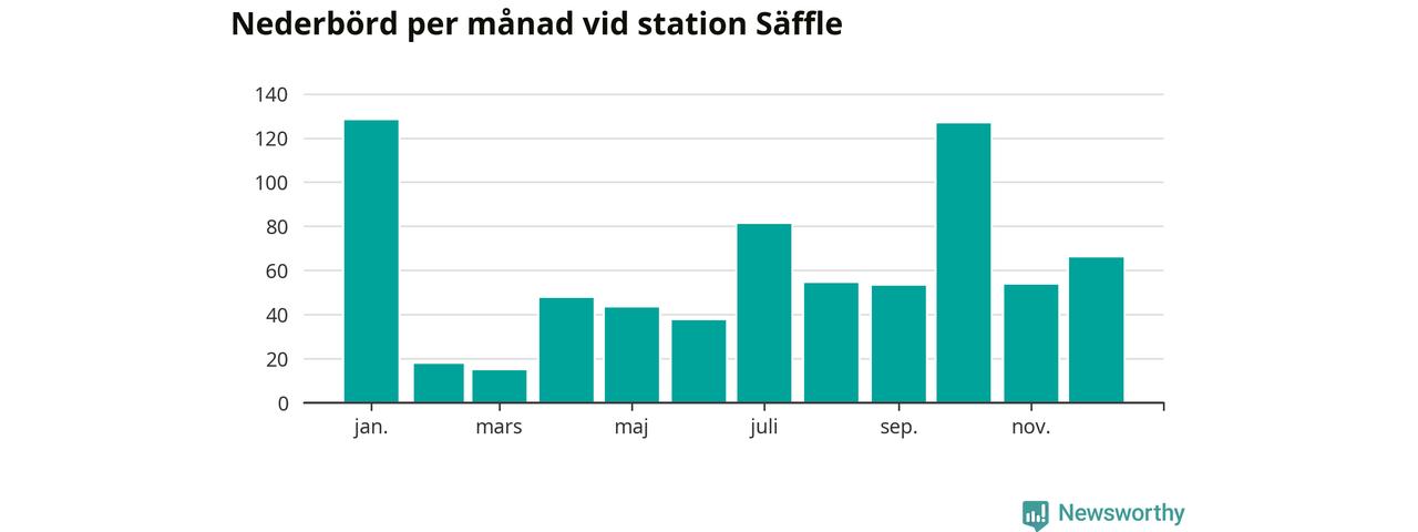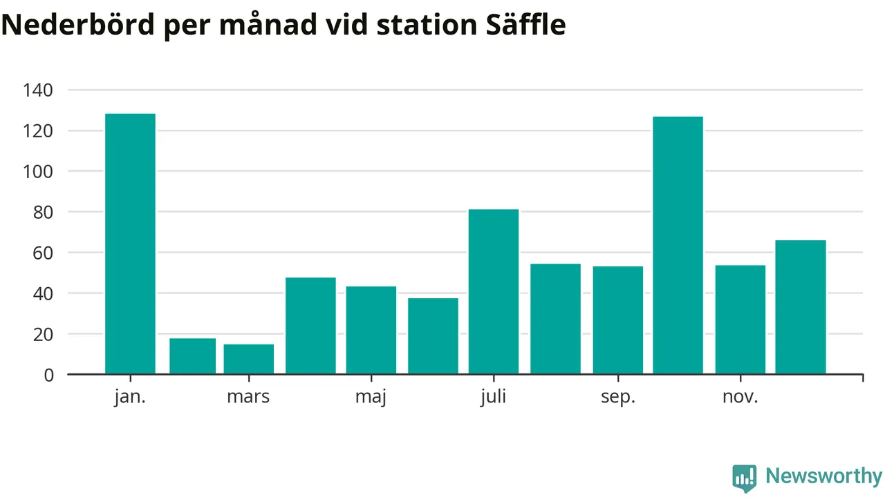 Nederbördsmässigt var 2025 ett torrare år än vanligt vid Säffle. Totalt föll 723 millimeter nederbörd vid stationen, att jämföra med de senaste tre decenniernas genomsnitt på 802 millimeter. Månaden med mest nederbörd var januari, med 128 millimeter.